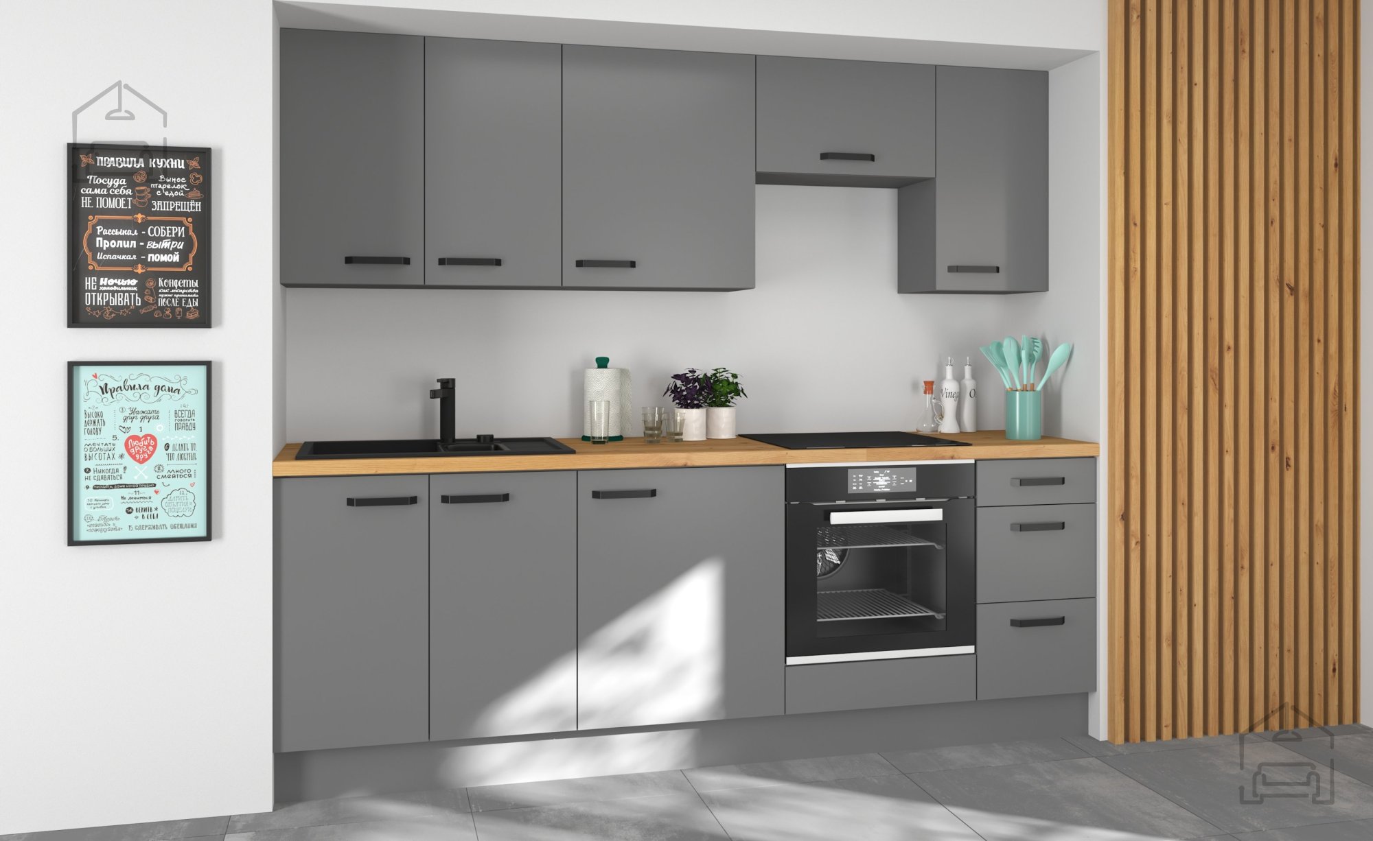 Die Küchenzeile Nessa – 240 cm ist die perfekte Wahl für alle, die modernes Design, hochwertige Materialien und eine praktische Anordnung der Elemente vereinen möchten. Mit ihrem minimalistischen Erscheinungsbild in anthrazitfarbener Ausführung schafft sie ein Gefühl von Prestige und Ordnung und ermöglicht gleichzeitig eine funktionale Raumnutzung. Die Kombination aus 16 mm starker laminierter Platte und Metallgriffen gewährleistet eine lange Haltbarkeit und einfache Pflege. Diese Küchenzeile ist die ideale Lösung für moderne Wohnungen, in denen jeder Zentimeter Raum kostbar ist.
