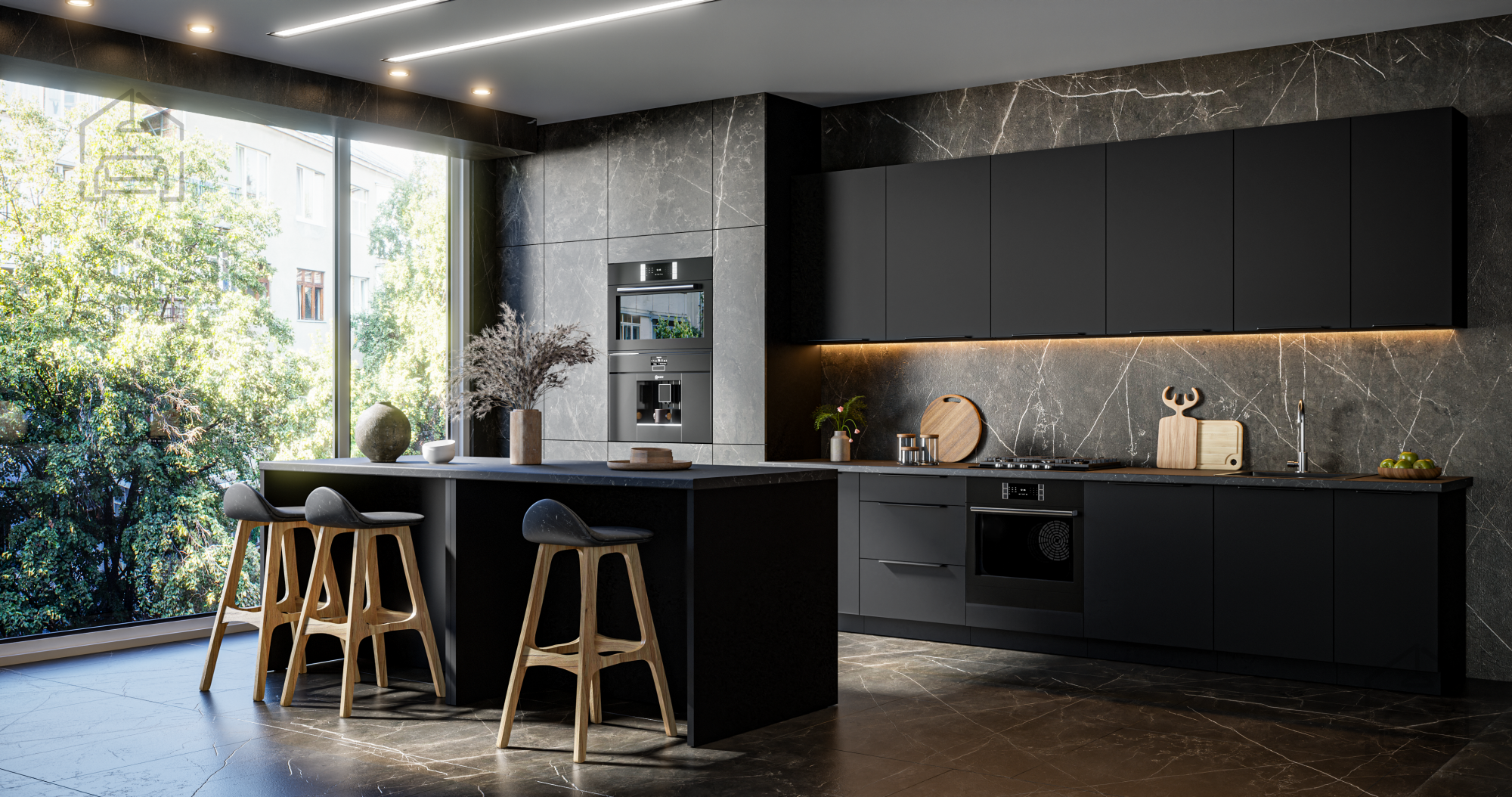 Eleganz, Funktionalität und zeitlose Schlichtheit vereinen sich in einem – in der perfekten Wahl für eine moderne Küche, in der Qualität und Design in den Vordergrund treten. Dieses Küchenensemble mit einer Breite von 320 cm ist die ideale Lösung für alle, die einen Raum schaffen möchten, in dem sich Komfort mit ästhetischer Vollendung verbindet. Die schwarze matte Farbe und die minimalistischen Kanten-Griffe UA-HEXA in einer Kombination aus Schwarz und Aluminium sorgen für ein anspruchsvolles Aussehen, das sowohl zu modernen als auch zu industriellen Interieurs hervorragend passt.