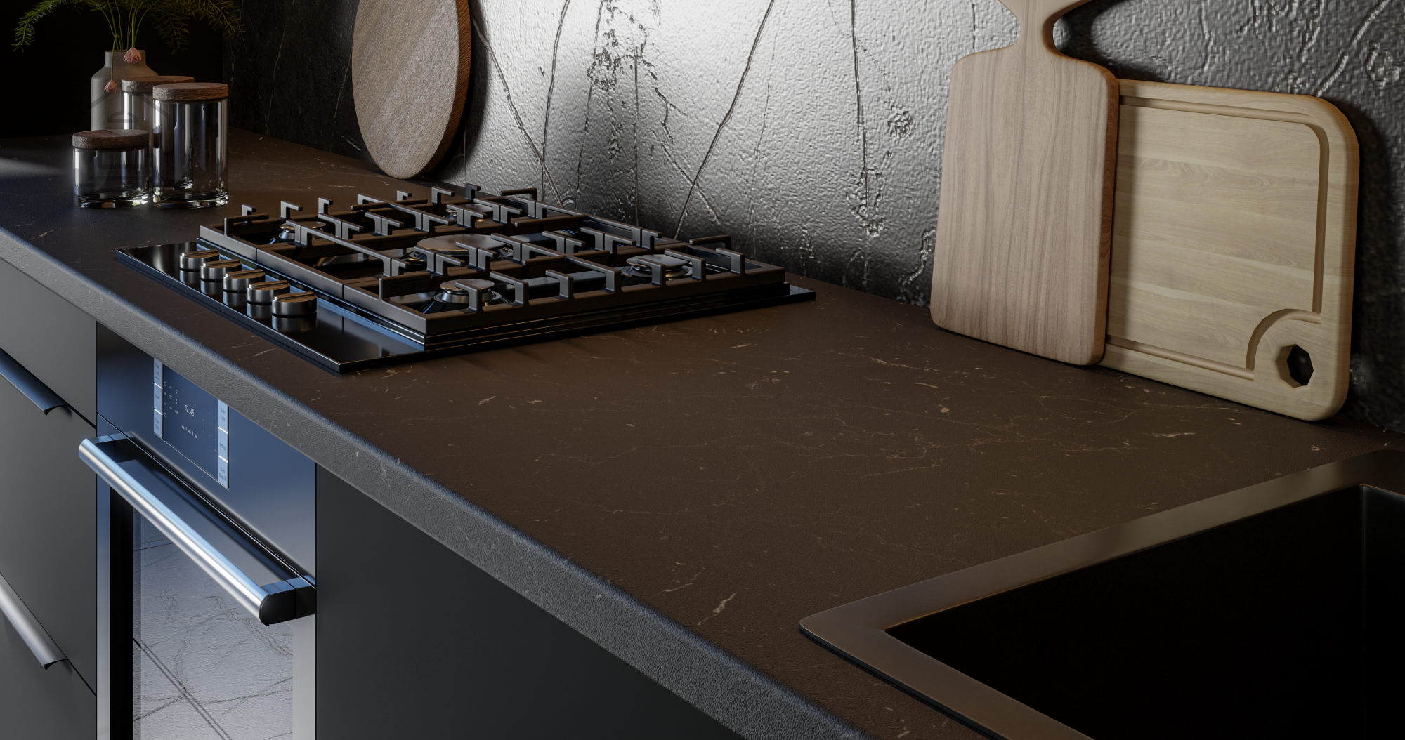 Besondere Aufmerksamkeit widmeten die Designer auch der Ästhetik der Glaselemente. Das gehärtete Graphitglas mit einer Stärke von 4 mm, das rundum poliert ist, verleiht der Küche einen raffinierten Charakter und ermöglicht gleichzeitig einen subtilen Blick in das Innere der Oberschränke. Die Glasböden mit einer Stärke von 5 mm sind elegant verarbeitet und äußerst robust, was eine sichere Aufbewahrung auch schwererer Gegenstände ermöglicht.