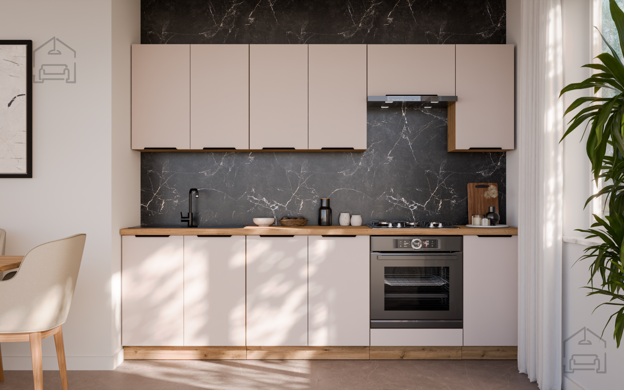 Dank ihrer universellen Größe von 260 cm ist die Küchenzeile eine ausgezeichnete Lösung für kleinere Wohnräume, Studios oder Ferienhäuser. Trotz ihres kompakten Designs bietet sie alles, was Sie für ein perfektes Küchenerlebnis benötigen – von einer großzügigen Arbeitsfläche bis zu intelligent gestalteten Aufbewahrungsschränken.