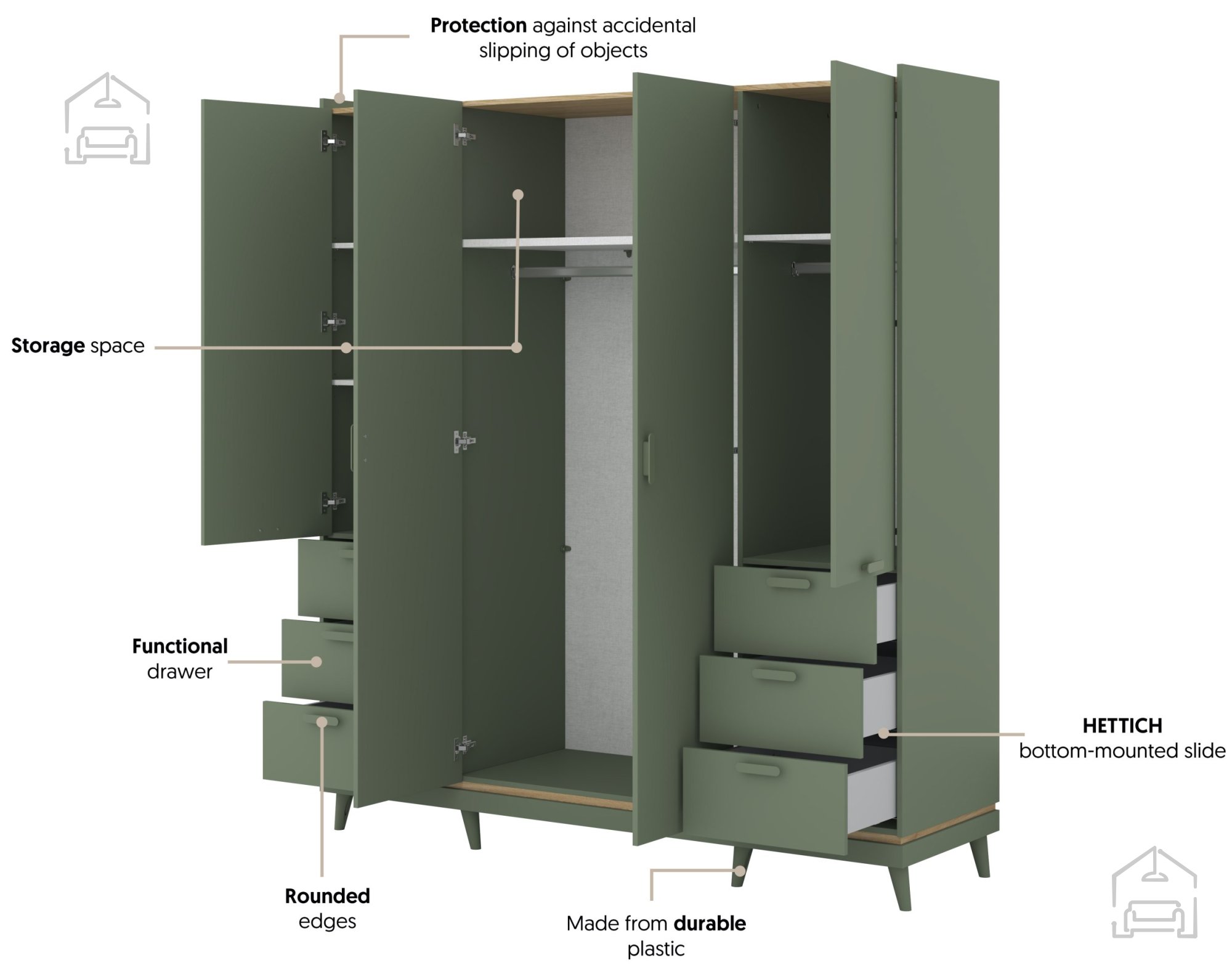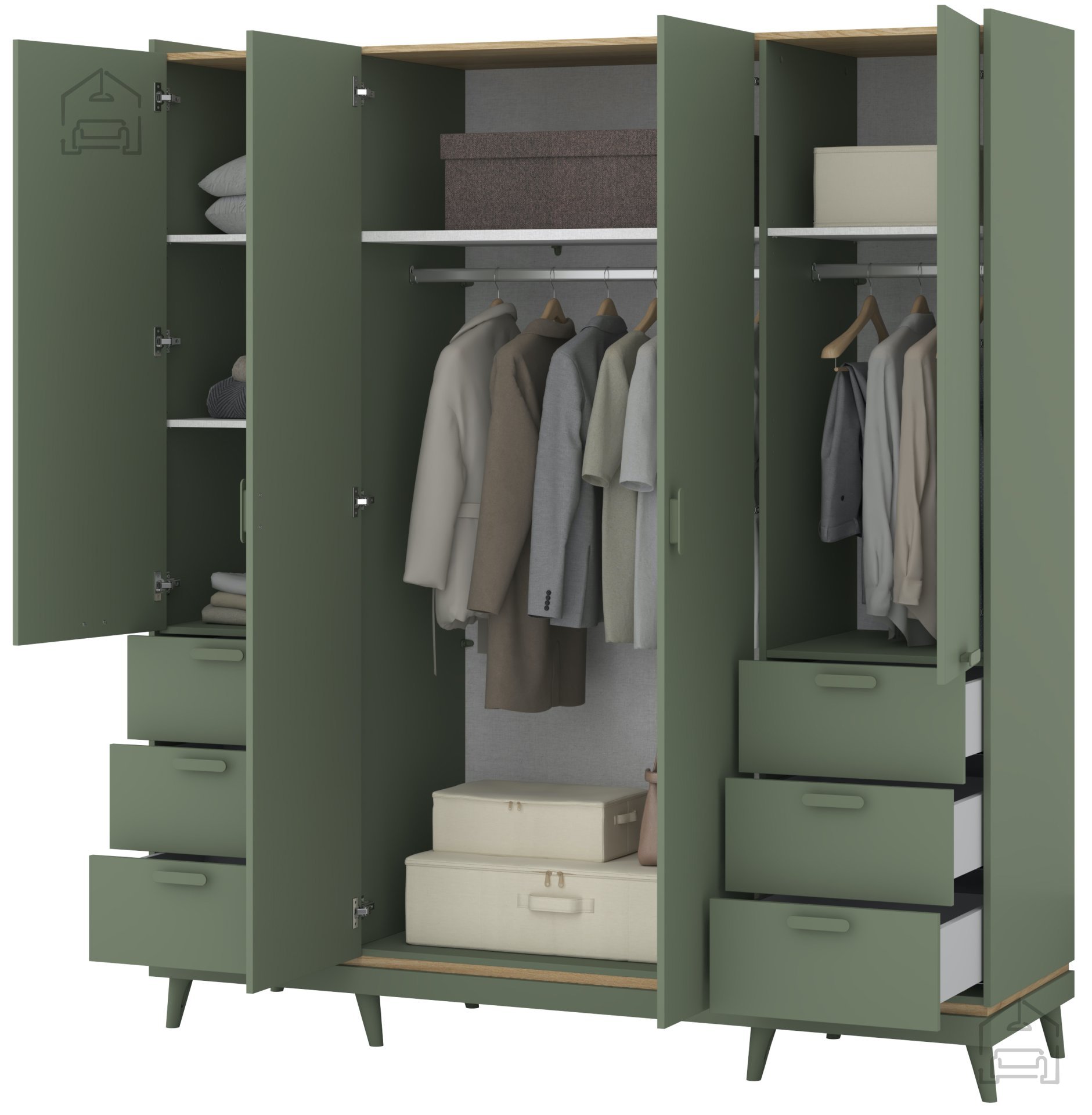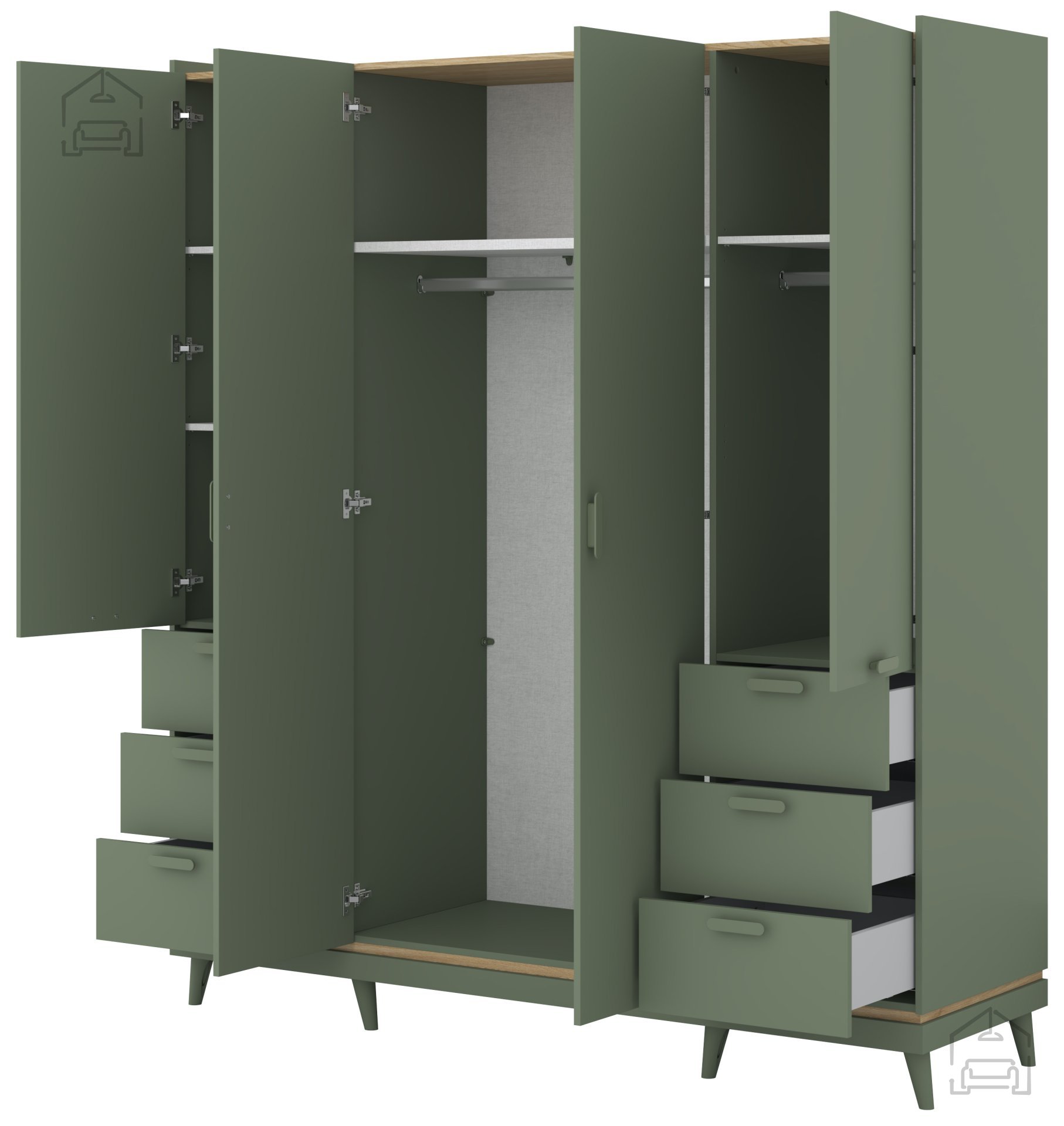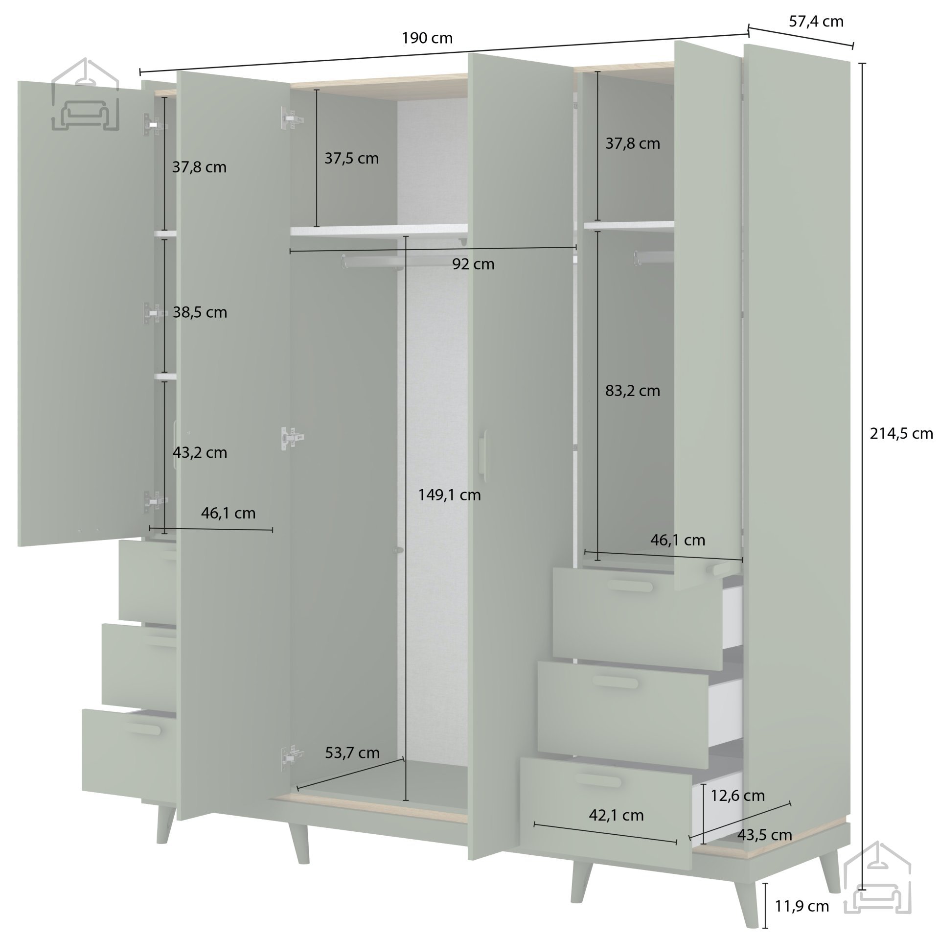 Sorgen Sie dafür, dass Ihre Garderobe stets ordentlich bleibt und Ihre Kleidung stets griffbereit ist – mit einem Möbelstück, das Qualität, Funktionalität und modernen Stil vereint. Wählen Sie den Kleiderschrank in der Kombination aus verblasst grün geölter Eiche und verblasst grün und verleihen Sie Ihrem Zuhause einen Hauch von Eleganz und Praktikabilität.