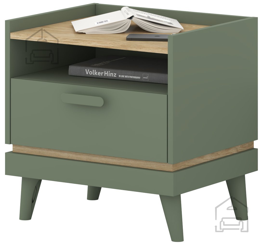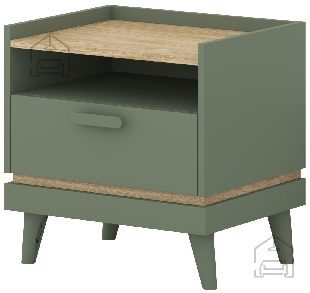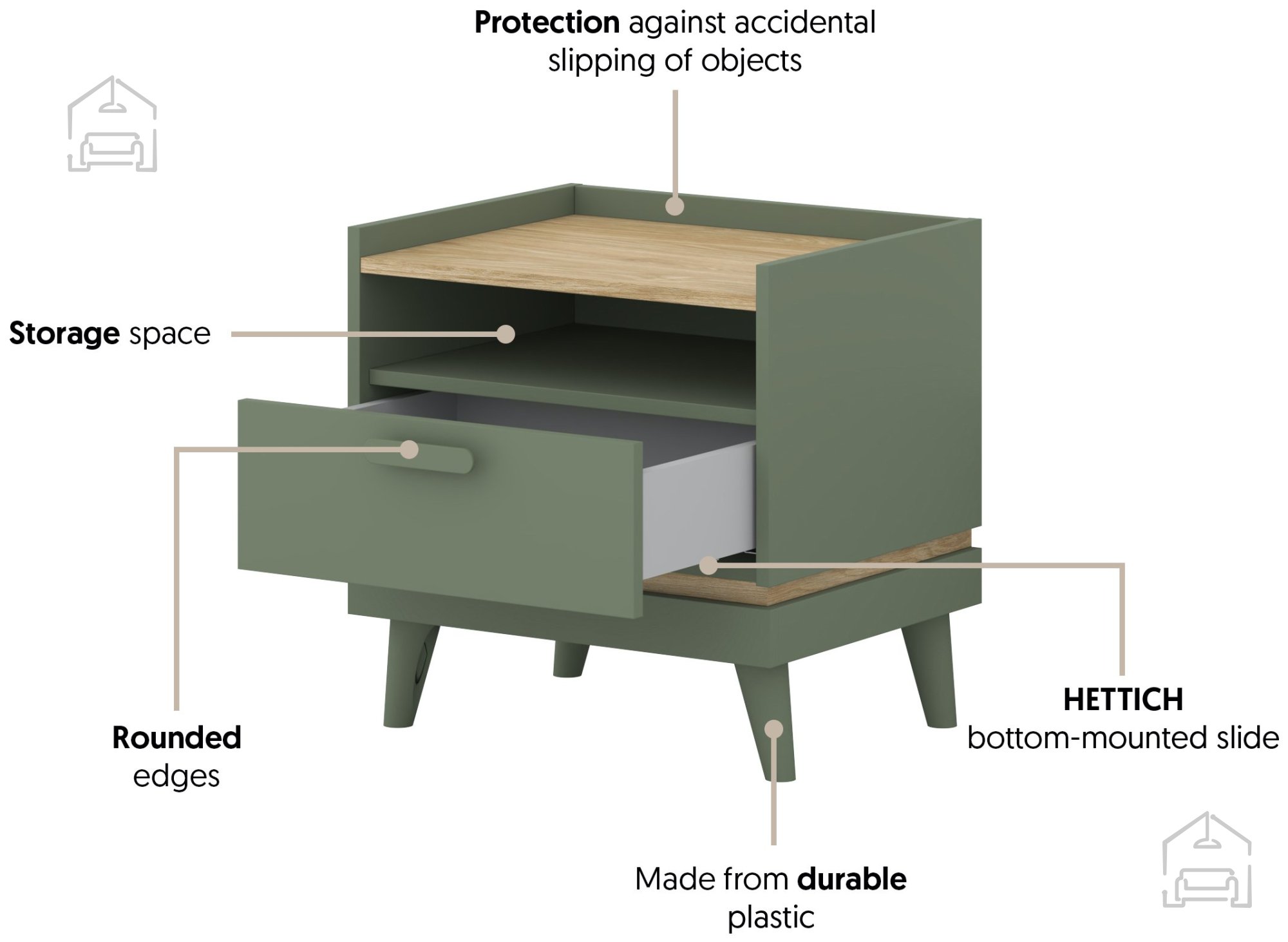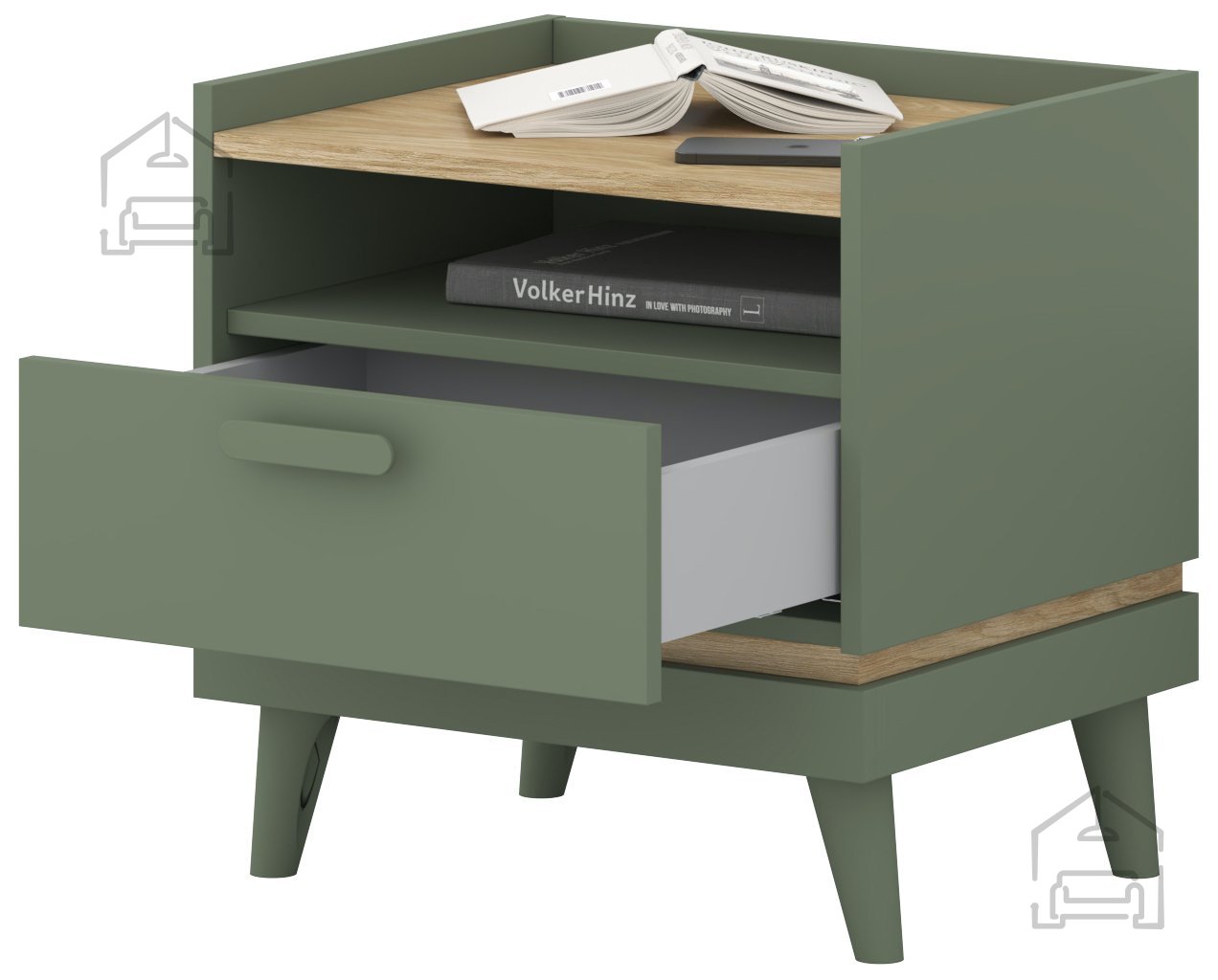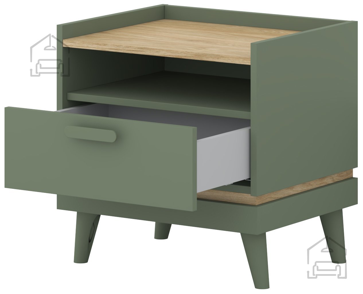 Die perfekte Kombination aus natürlicher Wärme und moderner Eleganz – dieser Nachttisch in einem wunderschönen, verblasst grünen Farbton mit Details aus geölter Eiche bringt Frische, Ruhe und skandinavische Schlichtheit in Ihr Schlafzimmer. Mit seinem minimalistischen Design und der durchdachten Gestaltung passt er hervorragend zu verschiedenen Einrichtungsstilen – von modern bis rustikal – und bietet zugleich praktischen Stauraum sowie ein aufgeräumtes Erscheinungsbild.
