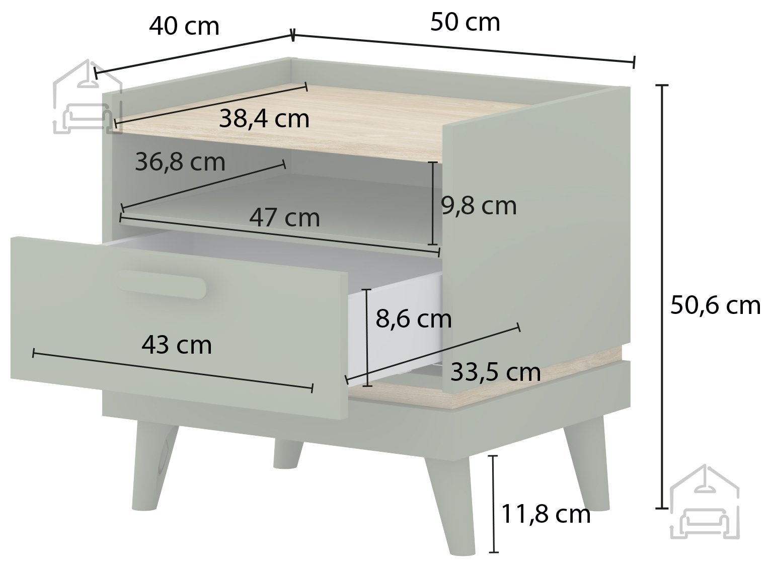 Inspiriert vom beliebten skandinavischen Stil strahlt der Nachttisch Scandi natürliche Schönheit und Funktionalität aus. Die Kombination aus verblasst grün geölter Eiche und sanftem Grünton schafft einen harmonischen Kontrast, der dem Schlafzimmer ein Gefühl von Entspannung und Wärme verleiht. Die Oberfläche aus Möbelplatte mit einer Stärke von 15 und 22 mm sorgt für Stabilität, während ABS-Kanten vor Abnutzung und Beschädigungen schützen – so behält der Nachttisch über viele Jahre hinweg sein makelloses Aussehen.