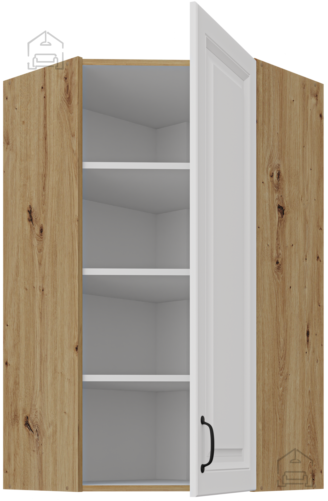 Der obere Eckschrank Stilo in der Kombination aus Weiß und Eiche Artisan ist die perfekte Wahl für alle, die eine ästhetisch vollendete, praktische und hochwertige Lösung für ihre Küche suchen. Mit seiner modernen Form, durchdachten Details und der natürlichen Farbkombination ergänzt er mühelos sowohl klassische als auch moderne Küchenambiente. Der Schrank ist aus hochwertiger laminierter Platte gefertigt, die eine lange Lebensdauer, Feuchtigkeitsbeständigkeit und einfache Pflege gewährleistet. Sein zeitloses Aussehen und die durchdachte Funktionalität verwandeln Ihre Küche in einen Raum, in dem sich Ästhetik und Komfort perfekt vereinen.
