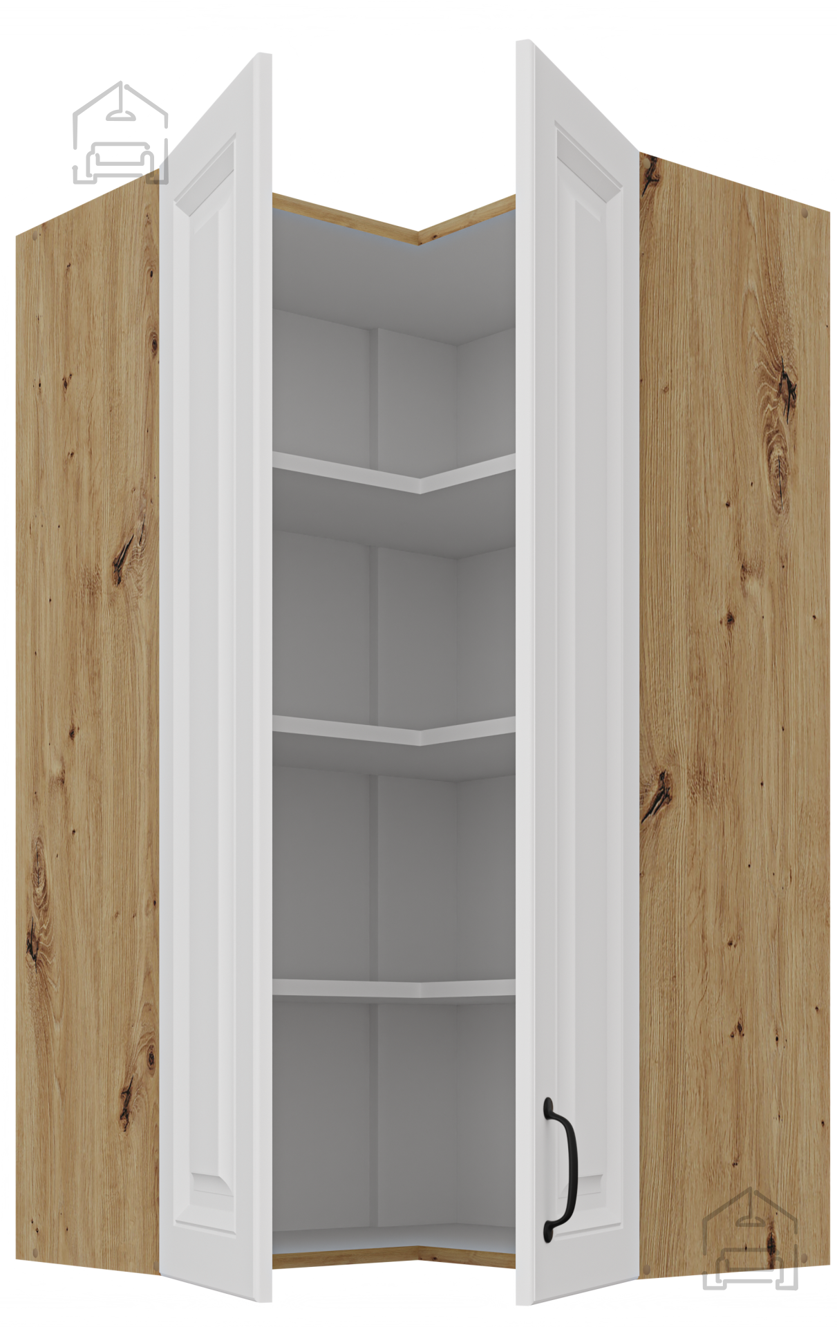 Der obere Eckschrank Stilo in der Kombination aus Weiß und Eiche Artisan ist die perfekte Wahl für alle, die eine ästhetisch vollendete, praktische und hochwertige Lösung für ihre Küche suchen. Mit seiner modernen Form, den durchdachten Details und der natürlichen Farbkombination ergänzt er mühelos sowohl klassische als auch moderne Küchenumgebungen. Der Schrank besteht aus einer hochwertigen laminierten Platte, die eine lange Lebensdauer, Feuchtigkeitsbeständigkeit und einfache Pflege gewährleistet. Sein zeitloses Erscheinungsbild und die durchdachte Funktionalität verwandeln Ihre Küche in einen Raum, in dem sich Ästhetik und Komfort perfekt vereinen.