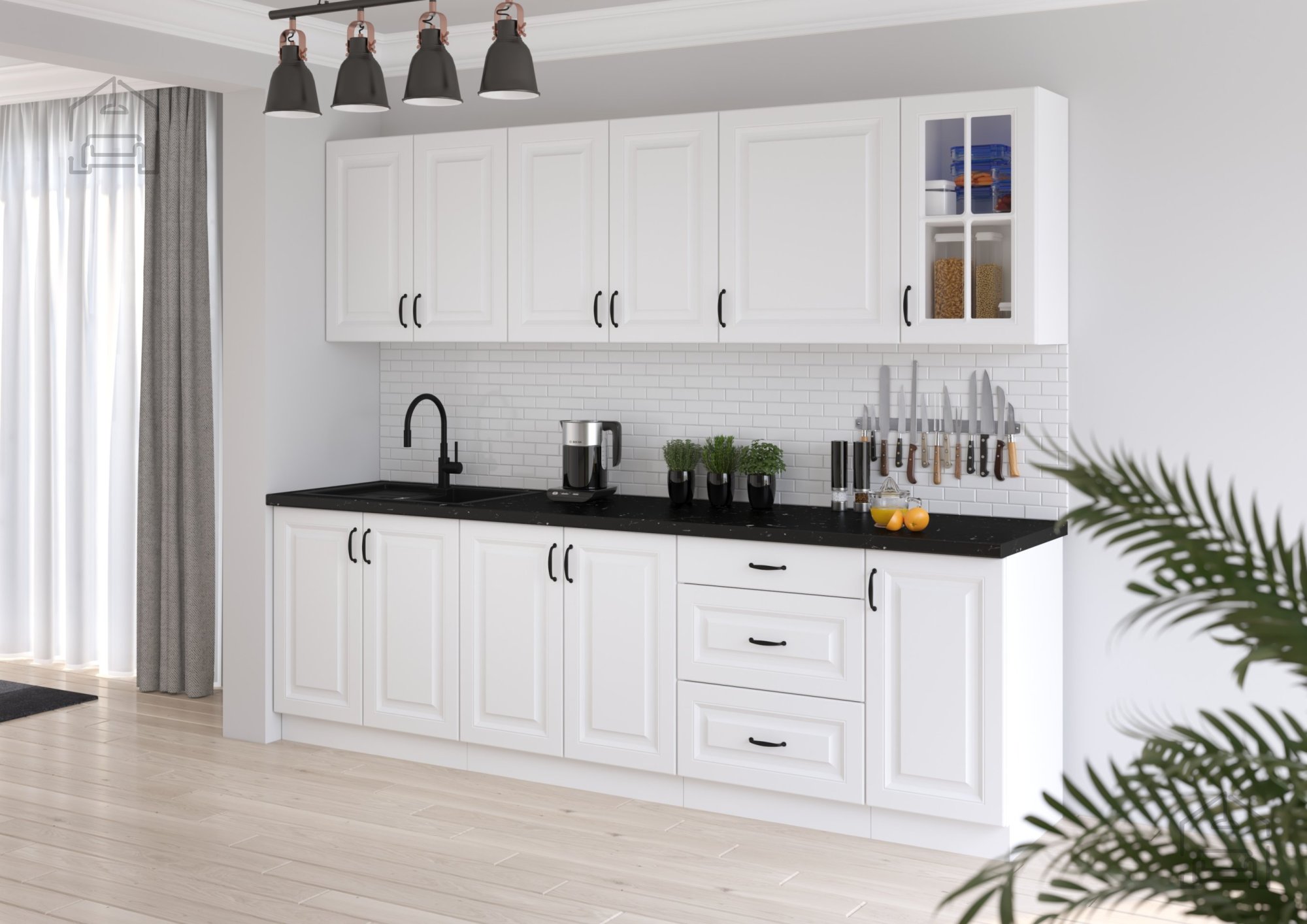 Dieses Küchenensemble ist eine hervorragende Investition in den Komfort und die Schönheit Ihres Zuhauses. Es eignet sich sowohl für neue Küchen als auch für Renovierungen, da es sich problemlos an unterschiedliche Raumanforderungen anpasst. Seine universelle weiße Farbe ermöglicht die Kombination mit verschiedenen Wandfarben, Bodenbelägen und Accessoires – Sie können den Raum mit farbigen Details beleben oder die minimalistische Eleganz beibehalten.