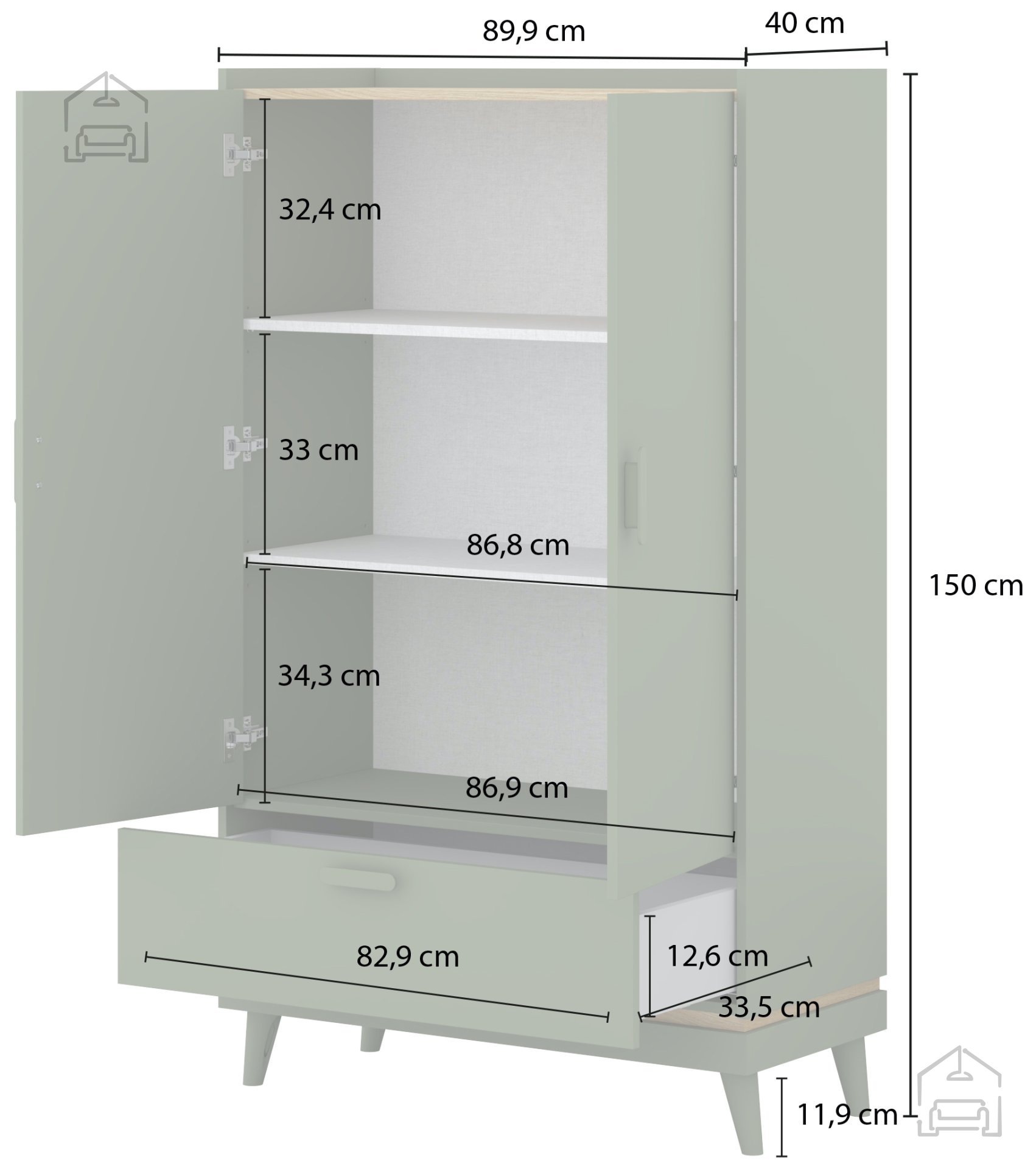 Bringen Sie einen Hauch moderner skandinavischer Eleganz in Ihr Zuhause mit einem außergewöhnlichen Schrank, der die zeitlose Ästhetik von natürlichem Holz mit der Frische von verblasstem Grün vereint. Dieser wunderschöne Schrank mit den Maßen 90x40x150 cm ist die perfekte Wahl für alle, die Funktionalität, Qualität und harmonisches Design schätzen. Gefertigt aus einer robusten Möbelplatte mit einer Stärke von 15 mm und 22 mm, garantiert er Stabilität und Langlebigkeit, während ABS-Kanten zusätzlichen Schutz vor Abnutzung und Stößen bieten.