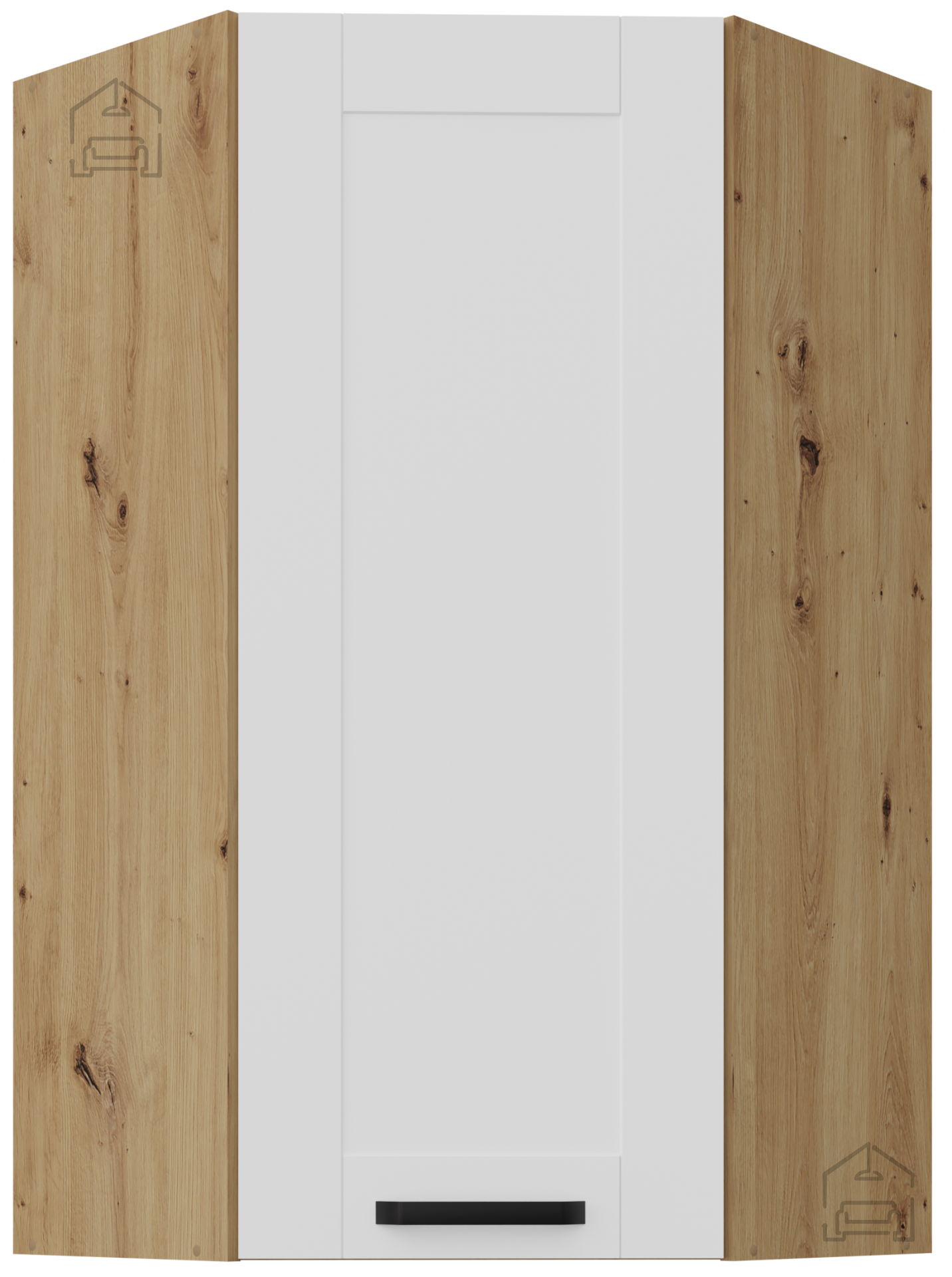 Die perfekte Kombination aus Eleganz, Funktionalität und Qualität – das sind die Hauptmerkmale, die der obere Eckschrank Luna in einer wunderschönen Kombination aus Weiß und Eichen-Dekor Artisan mit sich bringt. Dieses durchdacht gestaltete Küchenelement ist die ideale Lösung für jedes moderne Zuhause, das ästhetische Vollkommenheit, maximale Raumausnutzung und eine lange Lebensdauer der Möbel schätzt. Mit seinem raffinierten Erscheinungsbild und seinem praktischen Design bereichert der Schrank Luna im Handumdrehen das Aussehen Ihrer Küche und verleiht ihr einen Hauch von Wärme und natürlicher Eleganz.