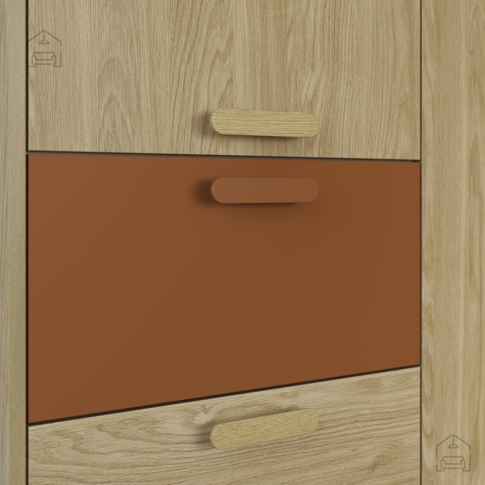 Die Wärme der geölten Eiche schafft eine angenehme und entspannte Atmosphäre, während der Farbkontrast des Ziegeltons dem Raum Charakter und ein modernes Aussehen verleiht. Dank hochwertiger Materialien wie Möbelplatte mit 15 mm und 22 mm Stärke ist jedes Möbelstück langlebig, stabil und für den langfristigen Gebrauch geeignet. Die feine ABS-Kante schützt die Oberflächen zusätzlich vor Beschädigungen und sorgt gleichzeitig für ein perfektes Erscheinungsbild ohne scharfe Abschlüsse.