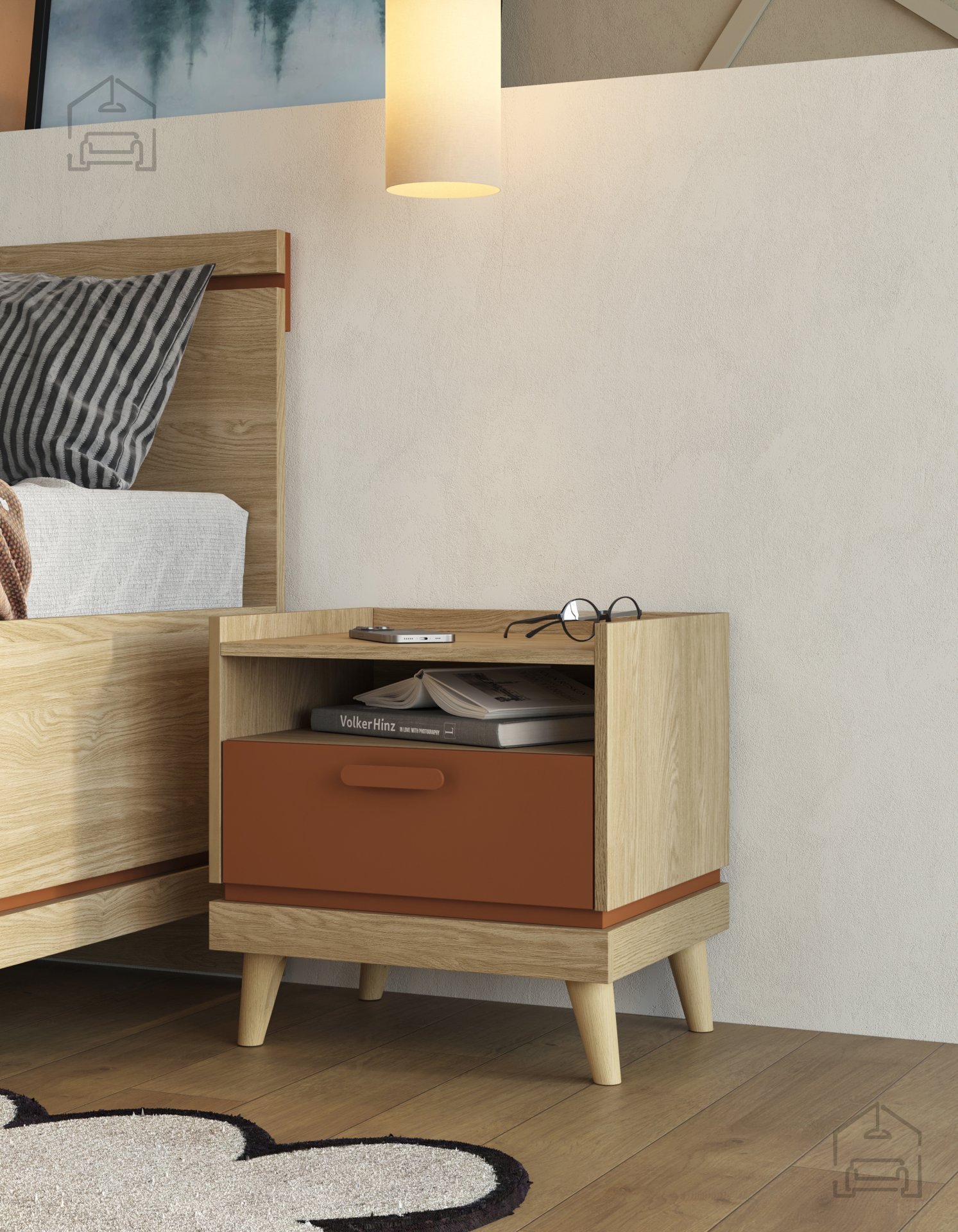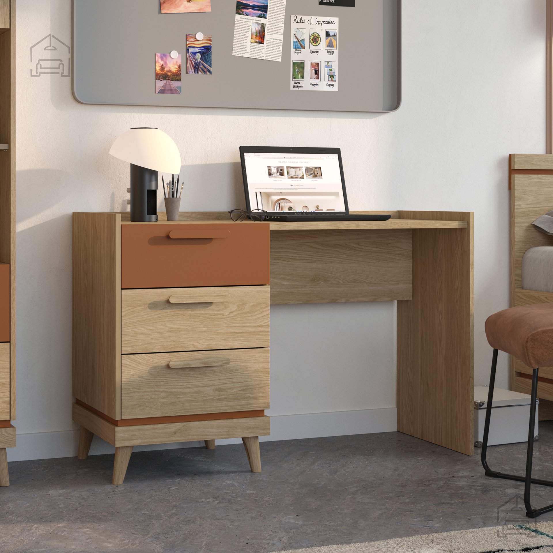 Die Wärme der geölten Eiche schafft eine angenehme und entspannte Atmosphäre, während der Farbkontrast des Ziegeltons dem Raum Charakter und ein modernes Aussehen verleiht. Dank hochwertiger Materialien wie Möbelplatte mit 15 mm und 22 mm Stärke ist jedes Möbelstück langlebig, stabil und für den langfristigen Gebrauch geeignet. Die feine ABS-Kante schützt die Oberflächen zusätzlich vor Beschädigungen und sorgt gleichzeitig für ein perfektes Erscheinungsbild ohne scharfe Abschlüsse.