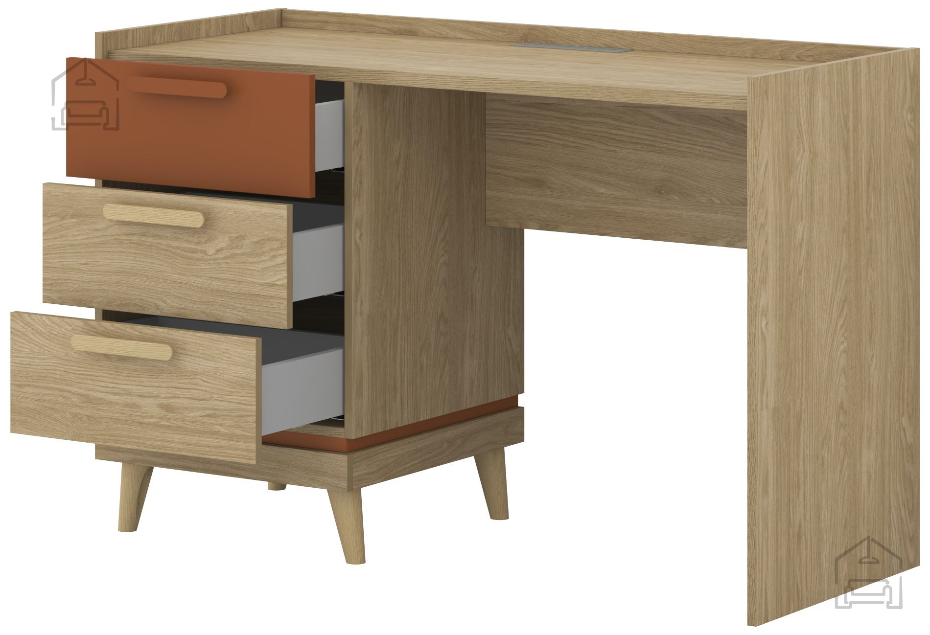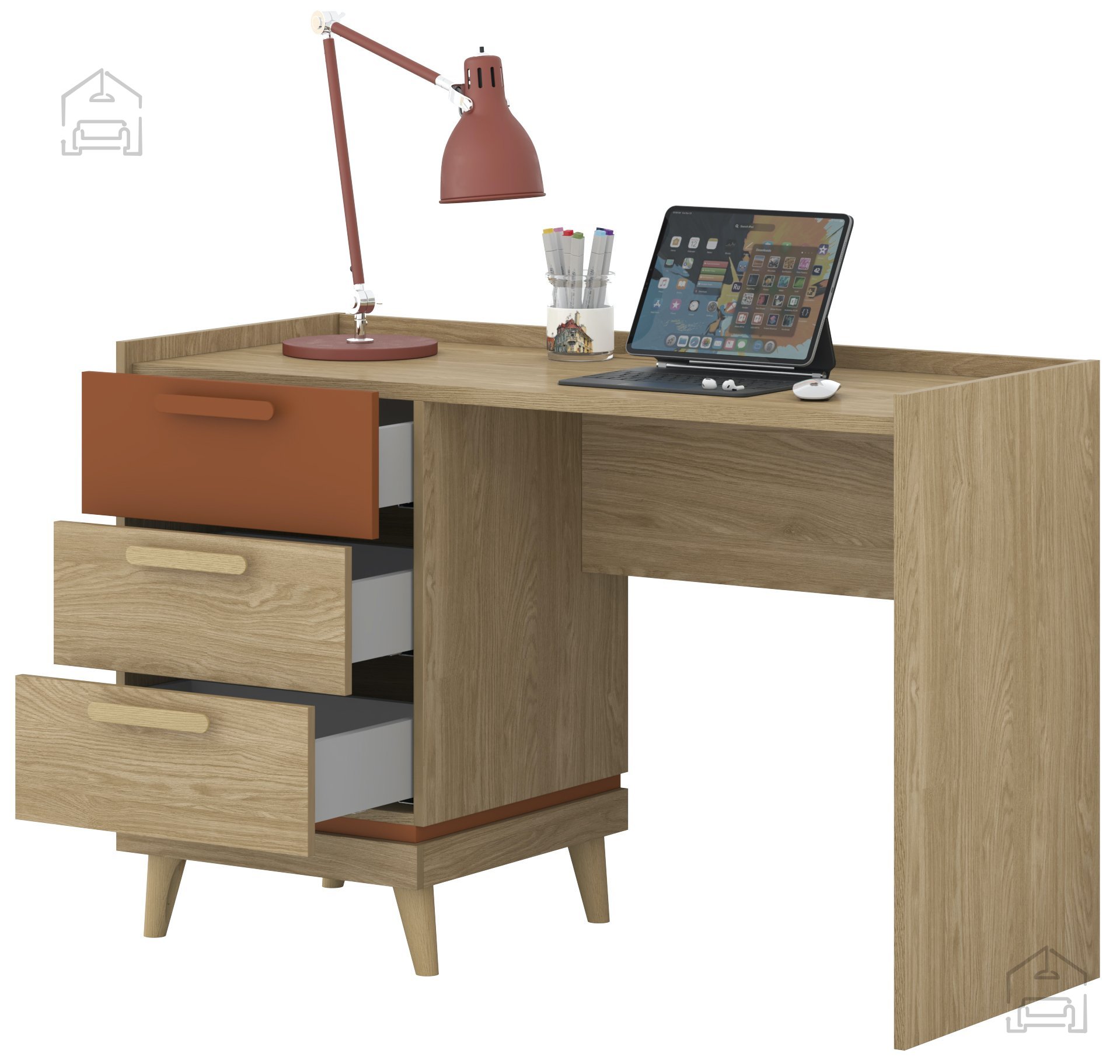 Der Schreibtisch Scandi in der Kombination aus geölter Eiche und Ziegelton ist die perfekte Wahl für alle, die einen klaren, natürlichen und modernen Einrichtungsstil schätzen. Mit seiner ausgewogenen Kombination aus warmen Holztönen und minimalistischer Form passt er sowohl ins Homeoffice als auch ins Kinder- oder Jugendzimmer. Seine kompakte Größe von 120x50x80 cm ermöglicht eine einfache Platzierung auch in kleineren Räumen, ohne dabei Komfort und Funktionalität zu opfern.
