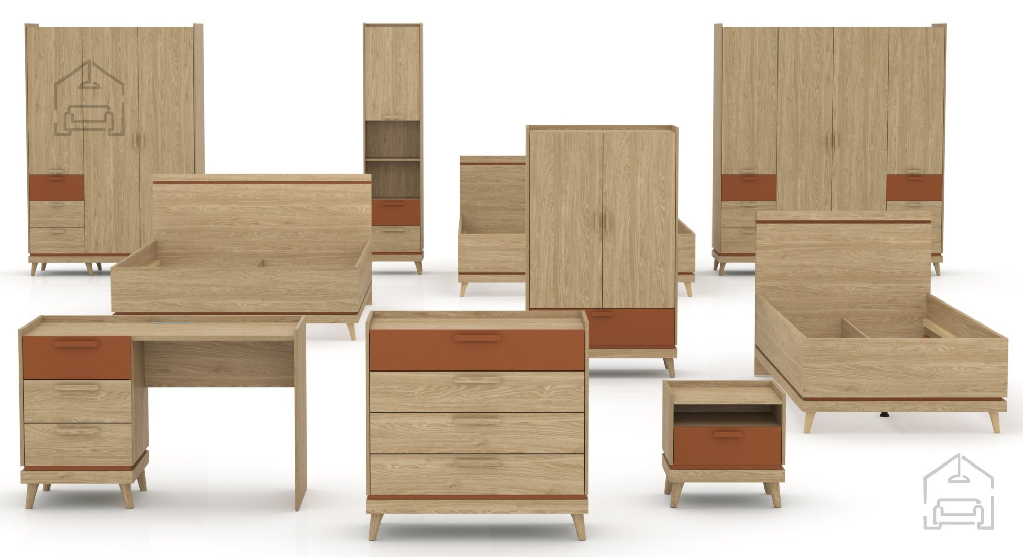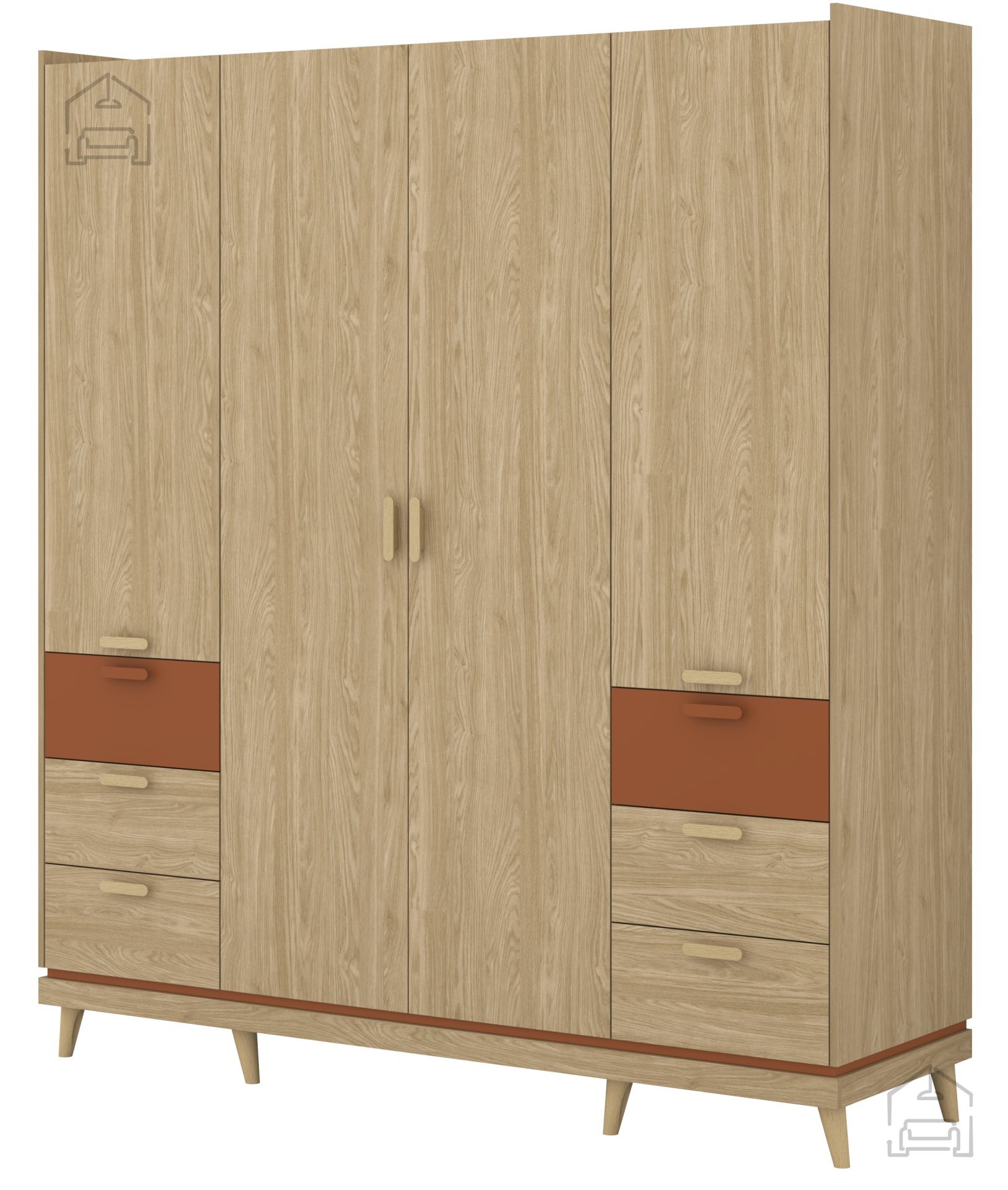 Inspiriert vom skandinavischen Design bringt dieser Kleiderschrank ein Gefühl von Ruhe, Ordnung und Wärme in jeden Raum. Die Oberfläche im Farbton geölte Eiche betont die natürliche Holzstruktur und schafft eine angenehme, wohnliche Atmosphäre. Details in der Farbe Ziegel verleihen dem Raum einen subtilen Kontrast, der für einen modernen und raffinierten Look sorgt. Die Kombination dieser beiden Töne passt perfekt zu verschiedenen Einrichtungsstilen – von rustikal bis modern.