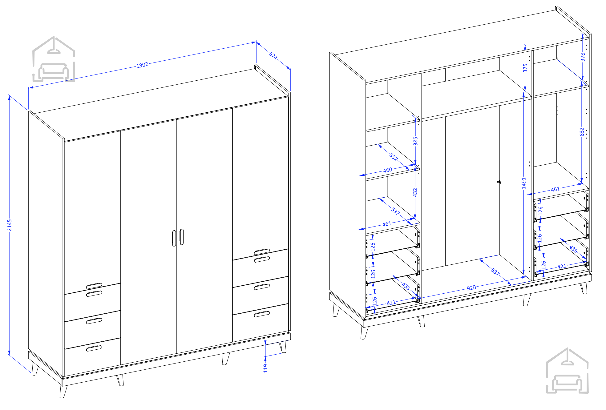 Der Kleiderschrank Scandi 2 überzeugt mit einer intelligenten Innenaufteilung, die eine optimale Raumnutzung ermöglicht. Mit vier Türen und sechs geräumigen Schubladen haben Sie ausreichend Platz für Kleidung, Accessoires und saisonale Gegenstände. Das Innere ist so gestaltet, dass eine logische Ordnung entsteht – von hängender Kleidung über gefaltete Stücke bis hin zu Schuhen und Modeaccessoires. So bleibt Ihre Garderobe stets übersichtlich, ordentlich und leicht zugänglich.