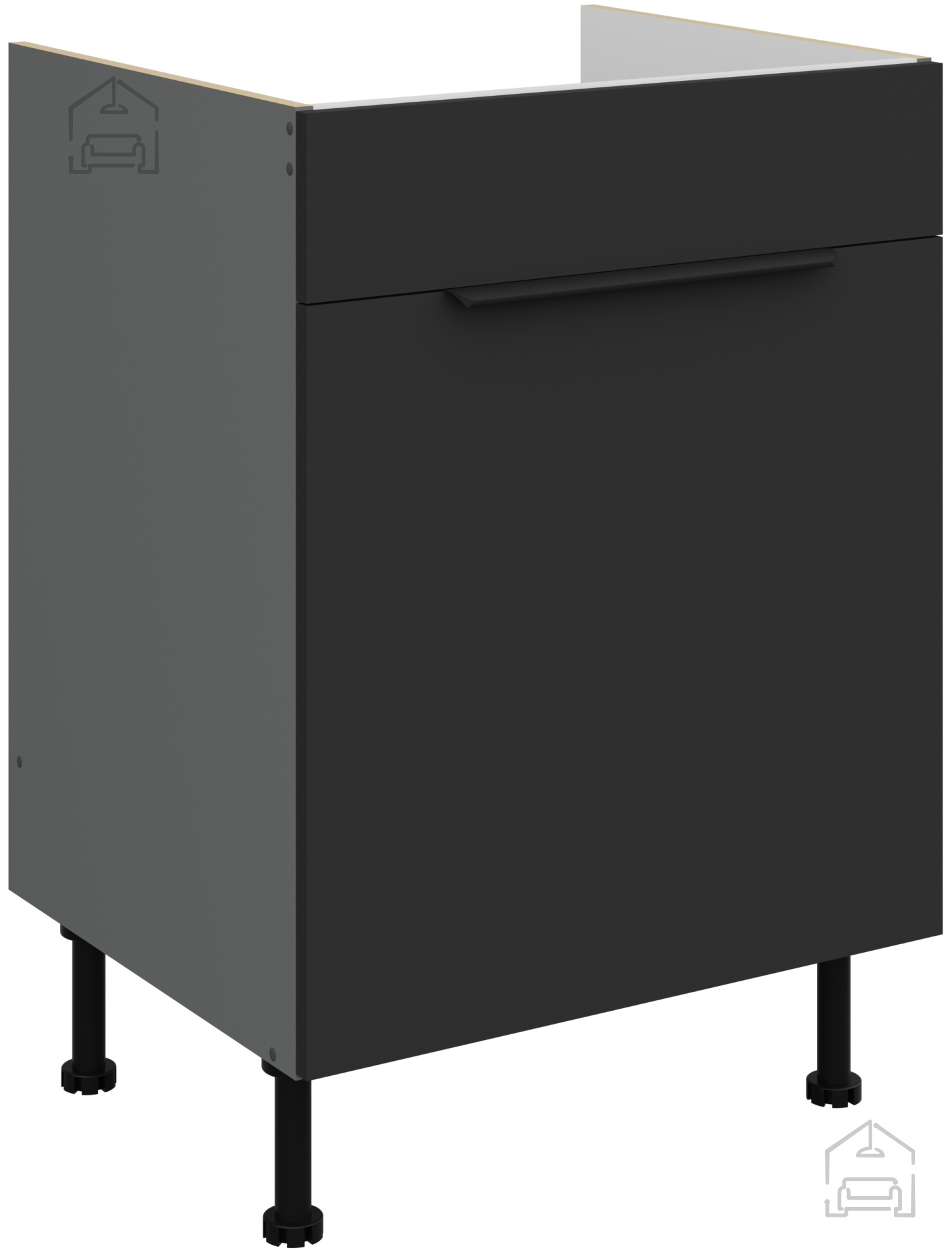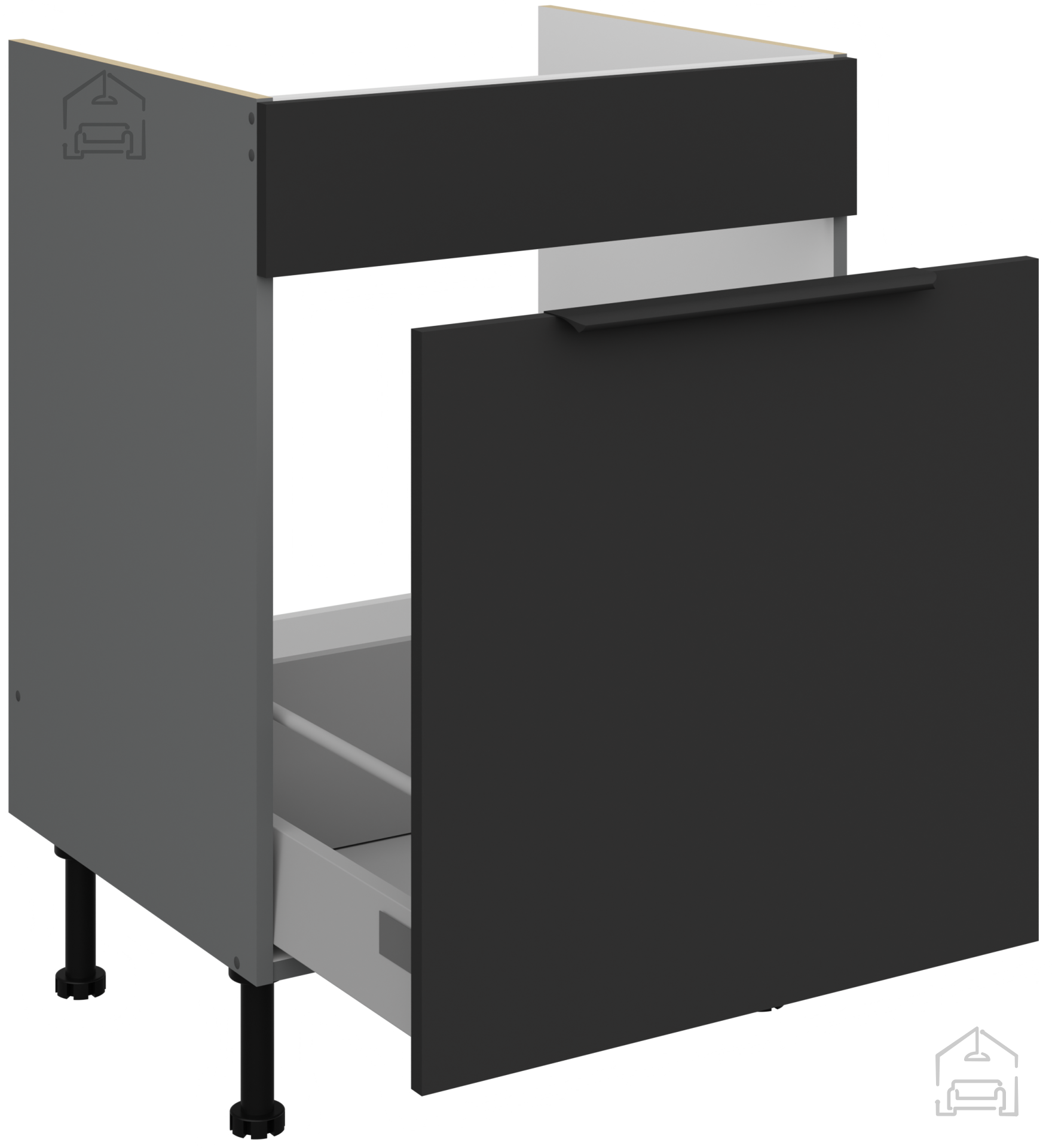 Die Grundlage jedes Elements ist eine laminierte Platte mit einer Stärke von 16 mm, die Stabilität und Widerstandsfähigkeit im täglichen Gebrauch gewährleistet. Die Oberfläche ist leicht zu reinigen und widerstandsfähig gegen Feuchtigkeit, Kratzer und Hitze – Eigenschaften, die in der Küche besonders wichtig sind. Die schwarz-anthrazitfarbenen Töne verleihen einen Hauch von Prestige und schaffen einen harmonischen Kontrast zu hellen Wänden oder natürlichen Materialien wie Holz und Stein.
