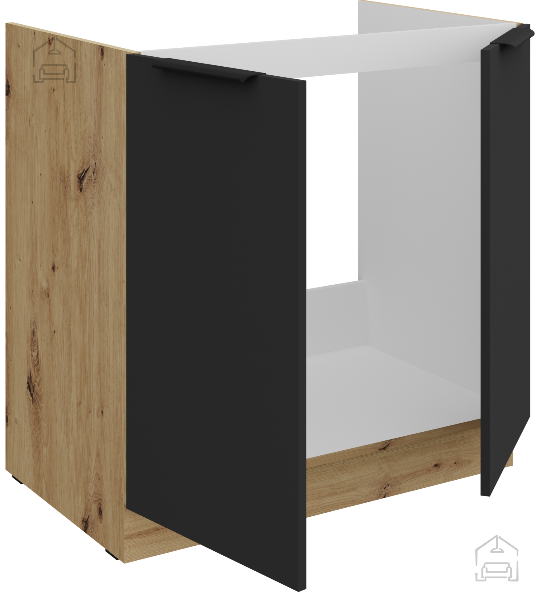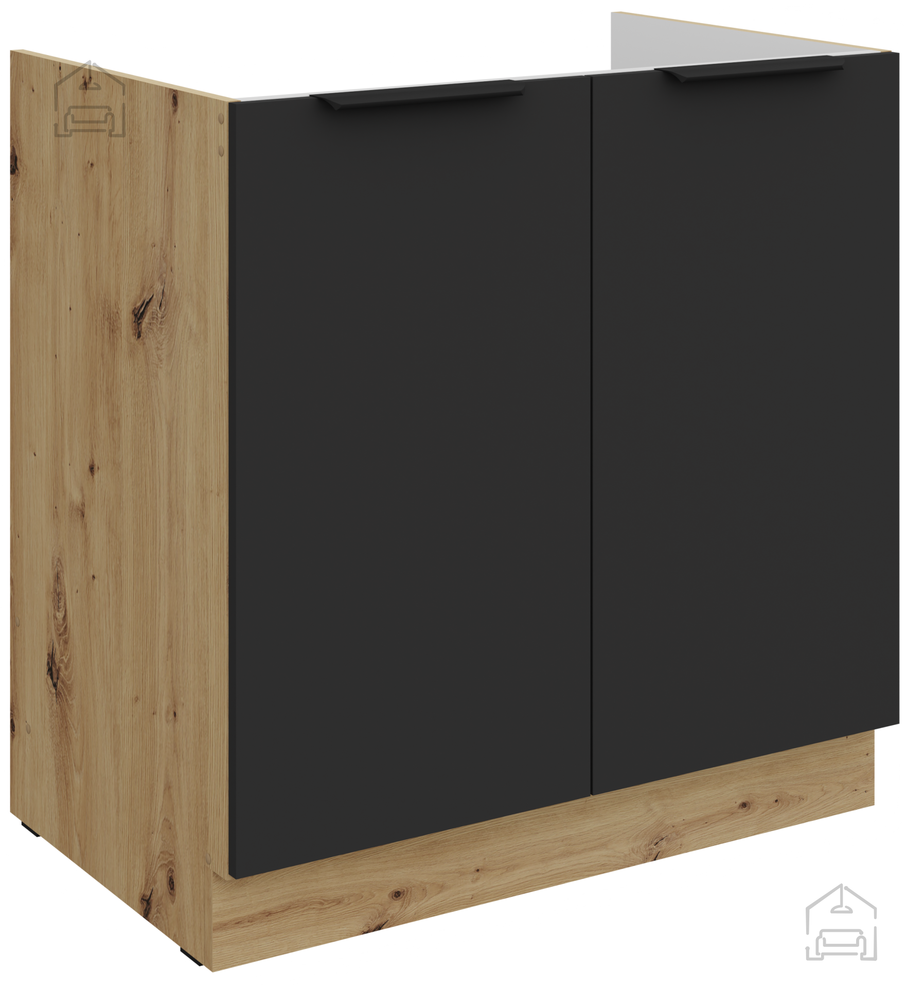 Küchenensemble Aria ist aus einer hochwertigen laminierten Platte mit einer Stärke von 16 mm gefertigt, was außergewöhnliche Stabilität und Langlebigkeit über Jahre hinweg gewährleistet. Die Oberfläche ist kratz-, feuchtigkeits- und hitzebeständig, sodass Ihre Küche immer wie neu aussieht, selbst bei täglichem Gebrauch. Schwarze Elemente sorgen für einen modernen Touch, während die Wärme der Artisan-Eiche einen natürlichen Charakter verleiht, der sowohl zu modernen als auch zu klassischen Interieurs perfekt passt.