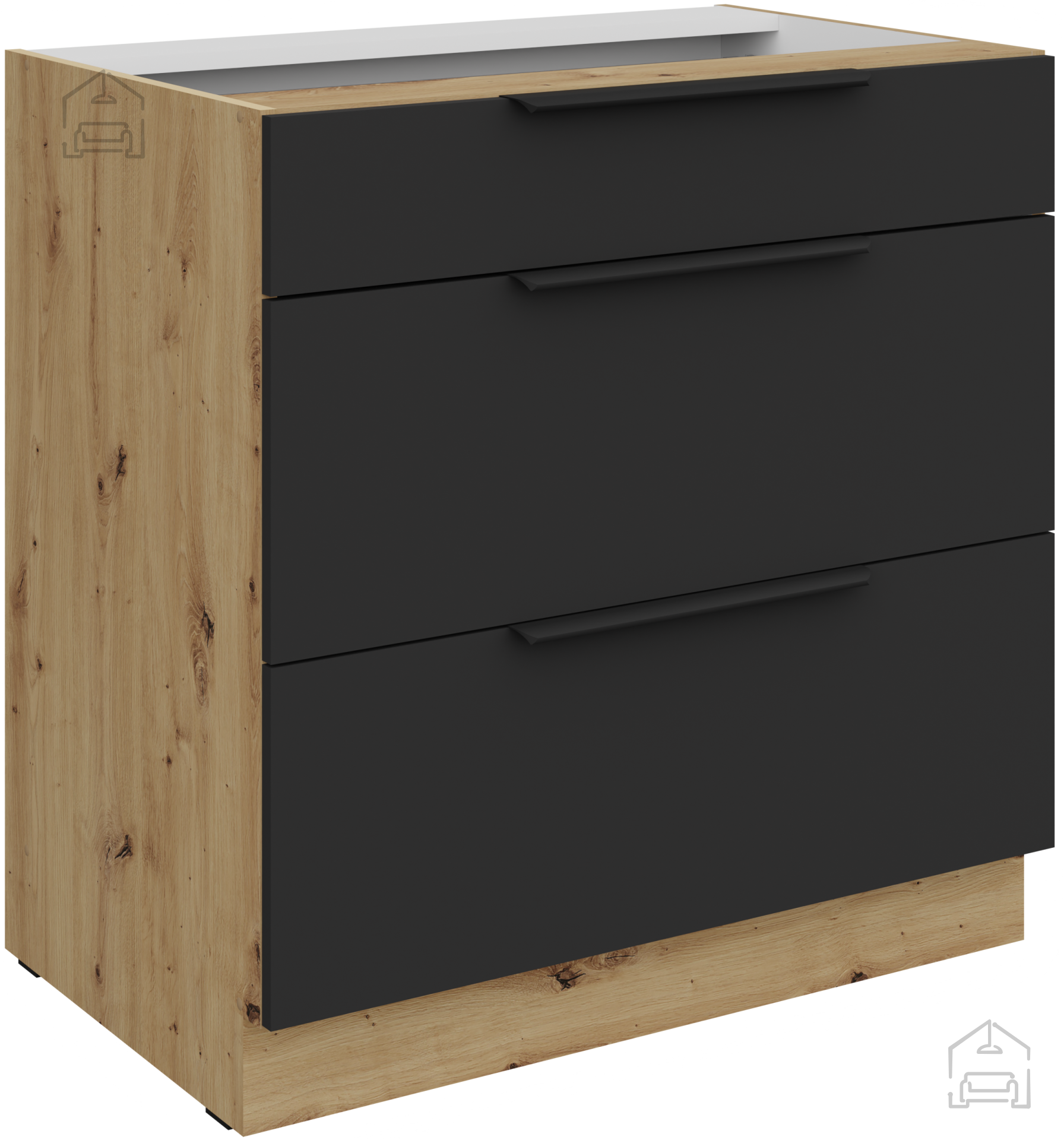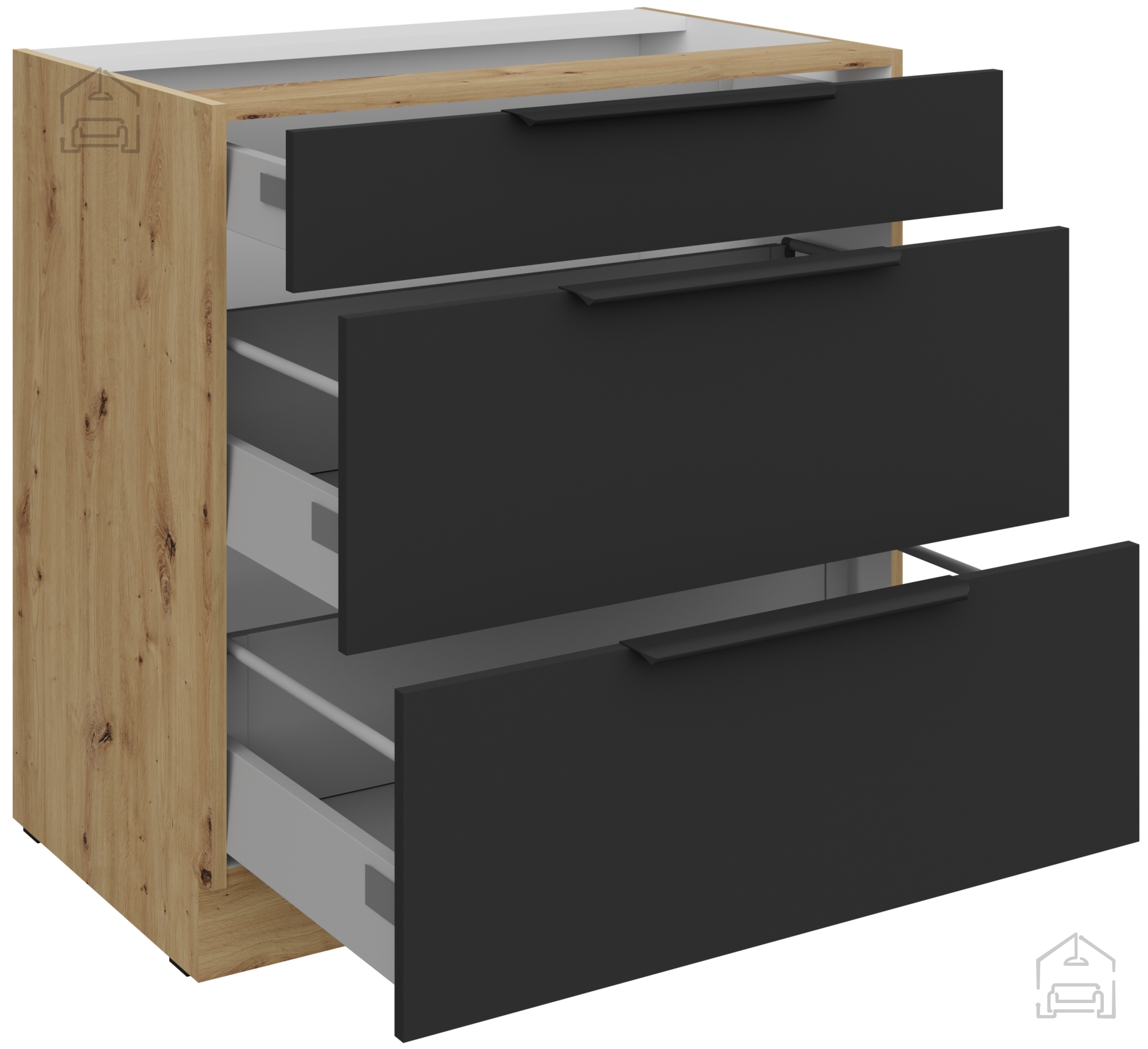 Küchenensemble Aria ist aus einer hochwertigen laminierten Platte mit einer Dicke von 16 mm gefertigt, was außergewöhnliche Stabilität und Langlebigkeit über viele Jahre hinweg gewährleistet. Die Oberfläche ist kratz-, feuchtigkeits- und hitzebeständig, sodass Ihre Küche auch nach täglichem Gebrauch immer wie neu aussieht. Schwarze Elemente sorgen für einen modernen Touch, während die Wärme der Artisan-Eiche einen natürlichen Charakter verleiht, der sowohl zu modernen als auch zu klassischen Interieurs perfekt passt.