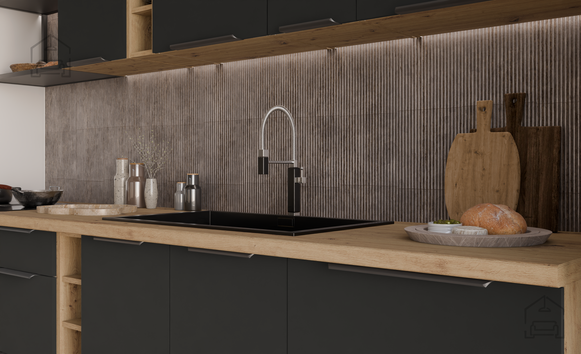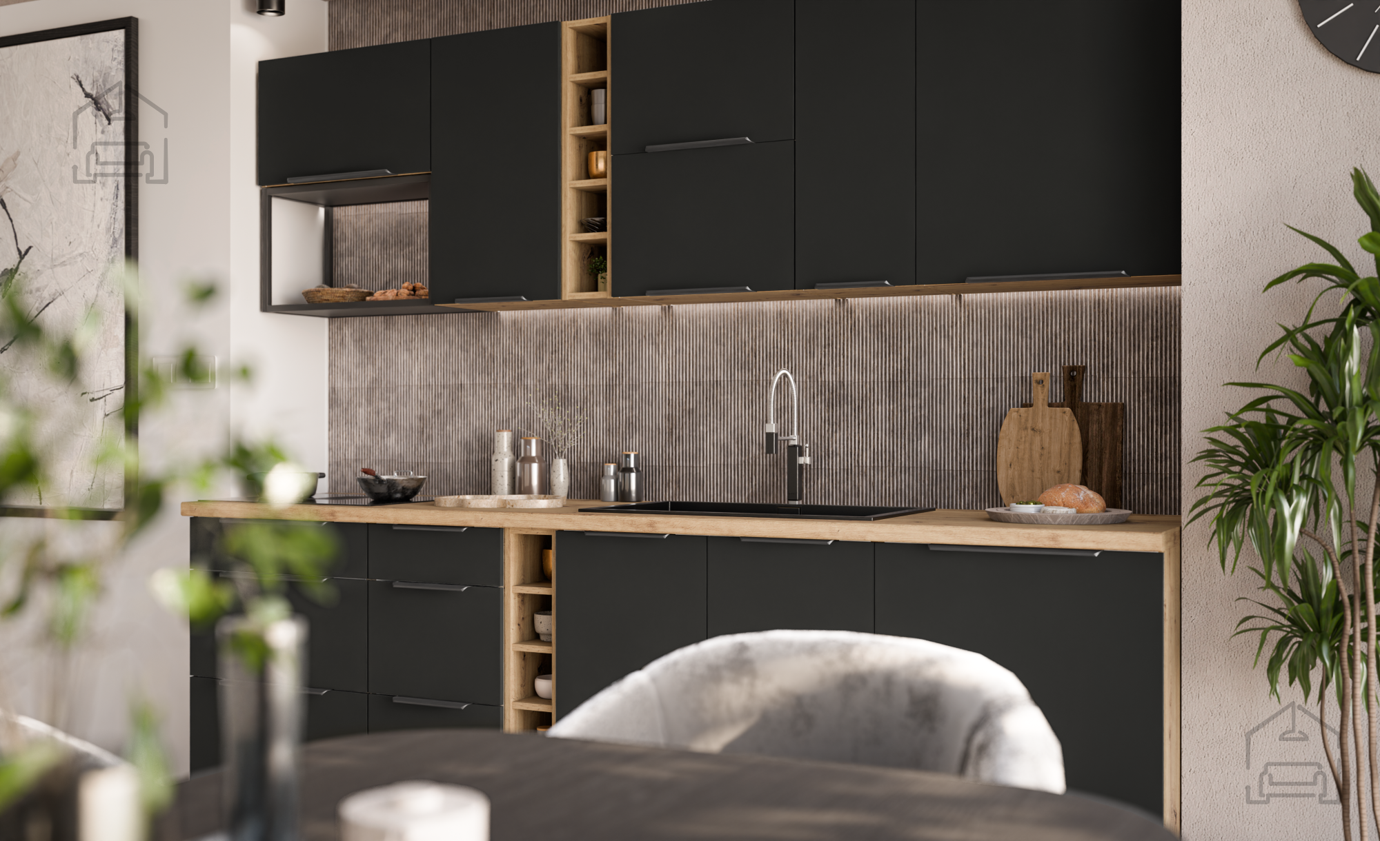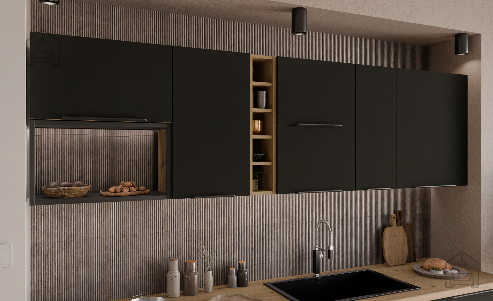 Die Kombination aus Schwarz und Holztextur verleiht dem Raum Charakter und Wärme, die Sie jeden Tag spüren werden. Durch das Hinzufügen persönlicher dekorativer Akzente wie Glasregale, Metallelemente oder Lichtelemente können Sie die Küche vollständig an Ihren Stil anpassen und sie in einen Raum verwandeln, der Ihre Persönlichkeit widerspiegelt.