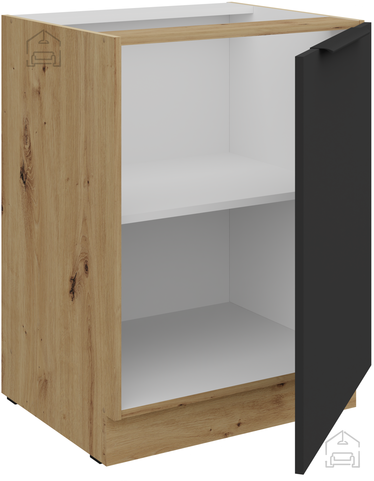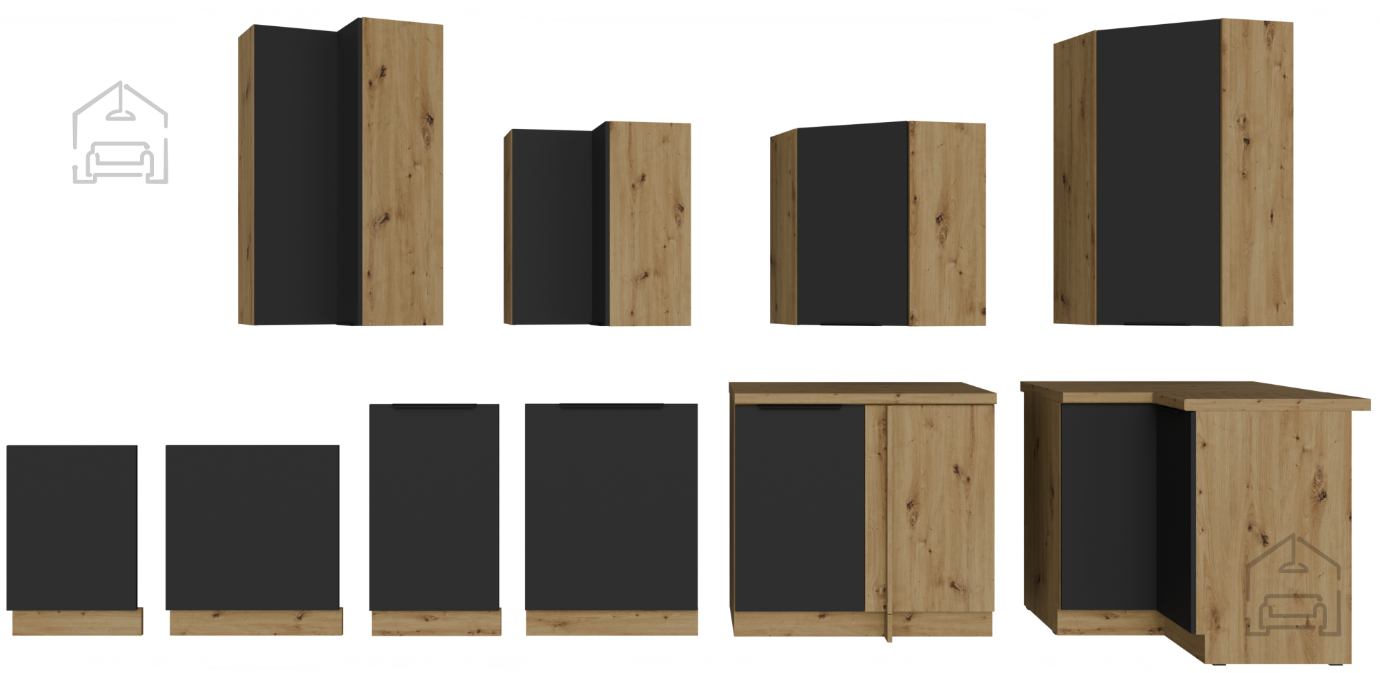Küchenzeile Aria besteht aus einer hochwertigen laminierten Platte mit einer Dicke von 16 mm, was außergewöhnliche Stabilität und Langlebigkeit über viele Jahre hinweg gewährleistet. Die Oberfläche ist kratz-, feuchtigkeits- und hitzebeständig, sodass Ihre Küche auch nach täglichem Gebrauch immer wie neu aussieht. Schwarze Elemente sorgen für einen modernen Touch, während die Wärme der Artisan-Eiche einen natürlichen Charakter einbringt, der sowohl zu modernen als auch zu klassischen Innenräumen wunderbar passt.
