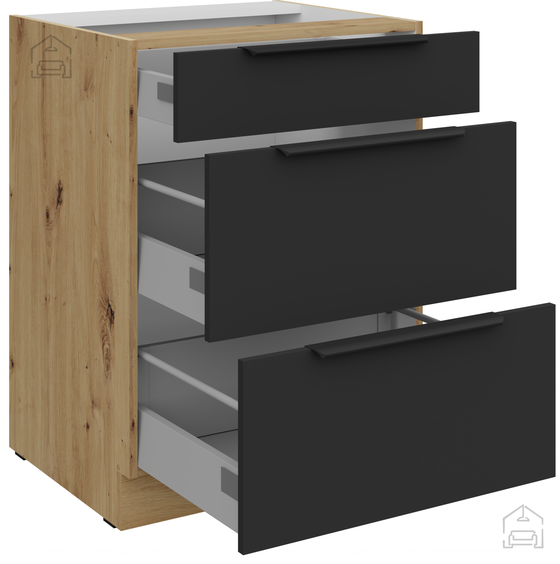 Küchenblock Aria ist aus einer hochwertigen laminierten Platte mit einer Dicke von 16 mm gefertigt, was außergewöhnliche Stabilität und Langlebigkeit über viele Jahre der Nutzung gewährleistet. Die Oberfläche ist kratz-, feuchtigkeits- und hitzebeständig, sodass Ihre Küche auch nach täglichem Gebrauch immer wie neu aussieht. Schwarze Elemente sorgen für einen modernen Touch, während die Wärme der Artisan-Eiche den natürlichen Charakter einbringt, der sowohl zu modernen als auch klassischen Interieurs perfekt passt.