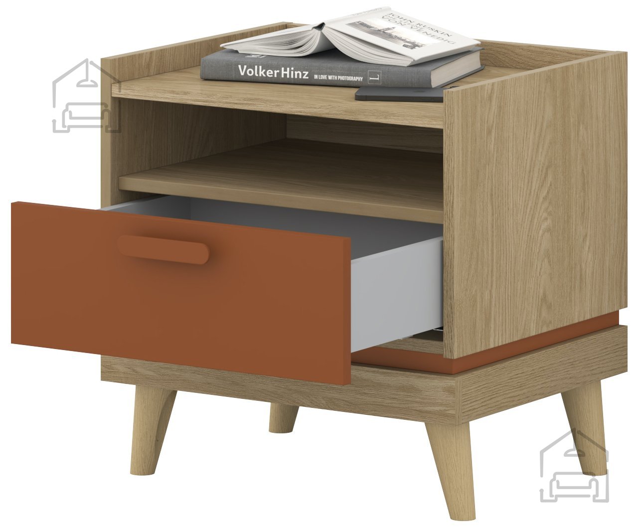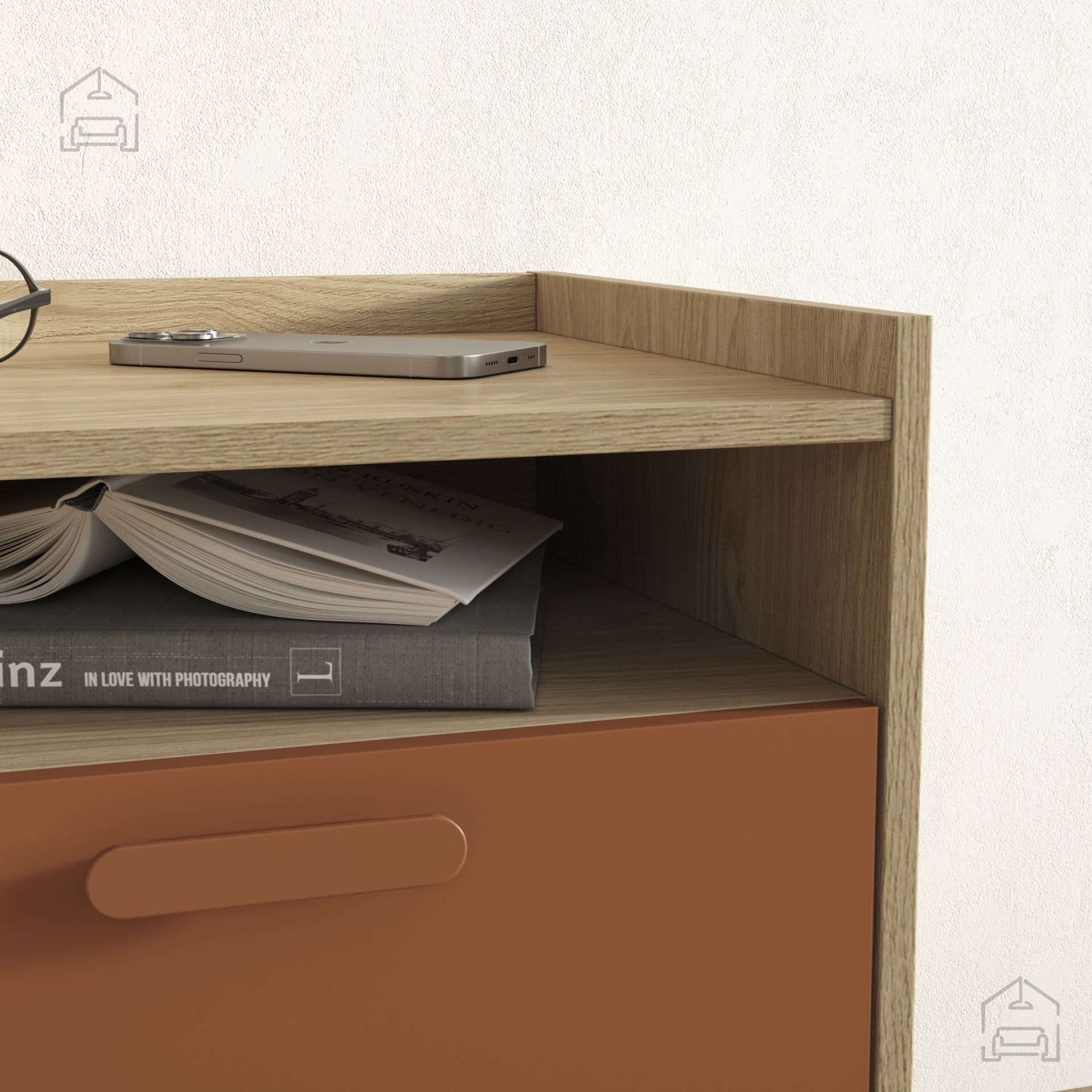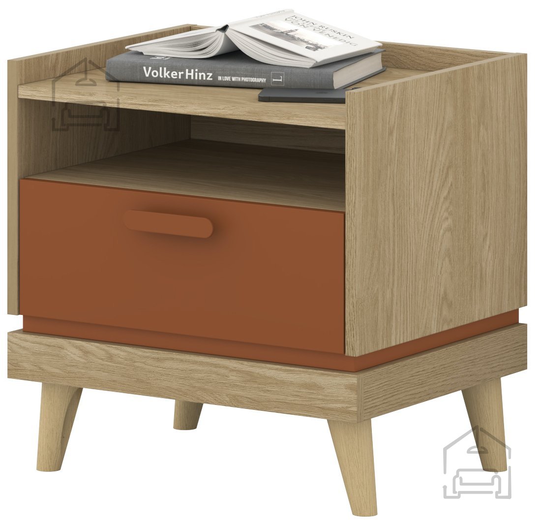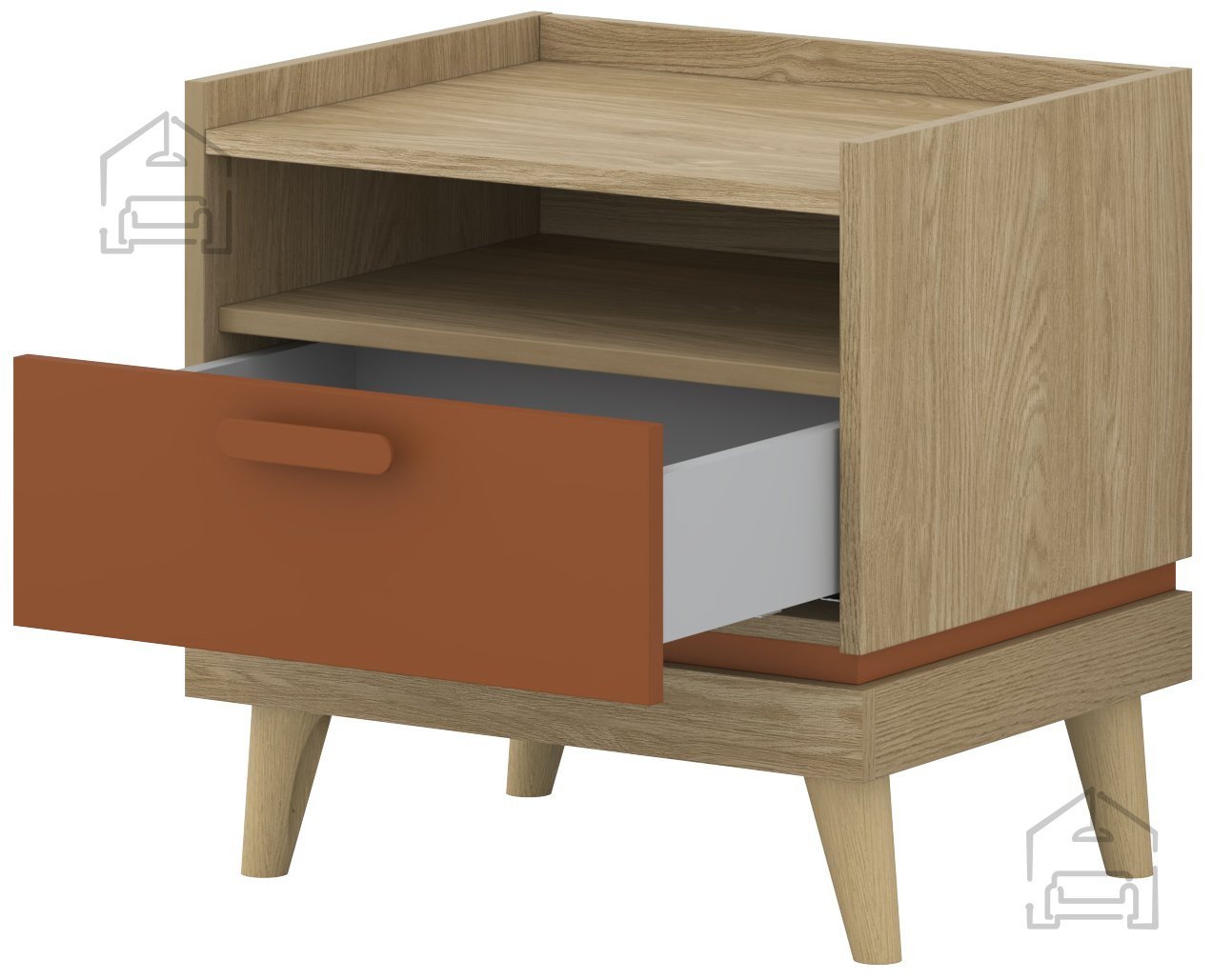 Der Nachttisch besteht aus einer hochwertigen Möbelplatte mit einer Stärke von 15 mm und 22 mm, was Stabilität und Langlebigkeit garantiert. Die Oberfläche in der Farbe geölte Eiche wirkt warm und angenehm und passt hervorragend zu verschiedenen Farbtönen von Bettmöbeln oder Bodenbelägen. Der zusätzliche Farbakzent im Ton geölte Eiche-Ziegel verleiht einen Hauch von Modernität und einen raffinierten Kontrast, der das Erscheinungsbild des Raums belebt.