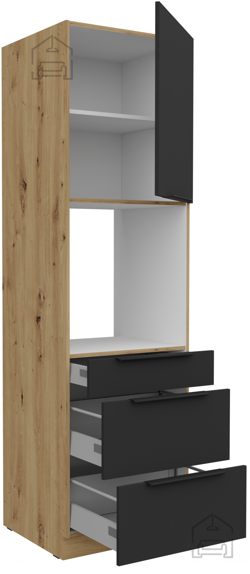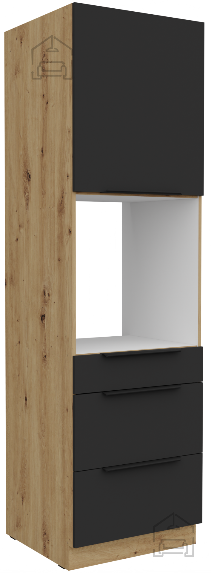 Küchenensemble Aria ist aus einer hochwertigen laminierten Platte mit einer Stärke von 16 mm gefertigt, was außergewöhnliche Stabilität und Langlebigkeit über Jahre hinweg gewährleistet. Die Oberfläche ist kratz-, feuchtigkeits- und hitzebeständig, sodass Ihre Küche auch nach täglichem Gebrauch immer wie neu aussieht. Schwarze Elemente sorgen für einen modernen Touch, während die Wärme der Artisan-Eiche einen natürlichen Charakter einbringt, der sowohl zu modernen als auch klassischen Interieurs hervorragend passt.