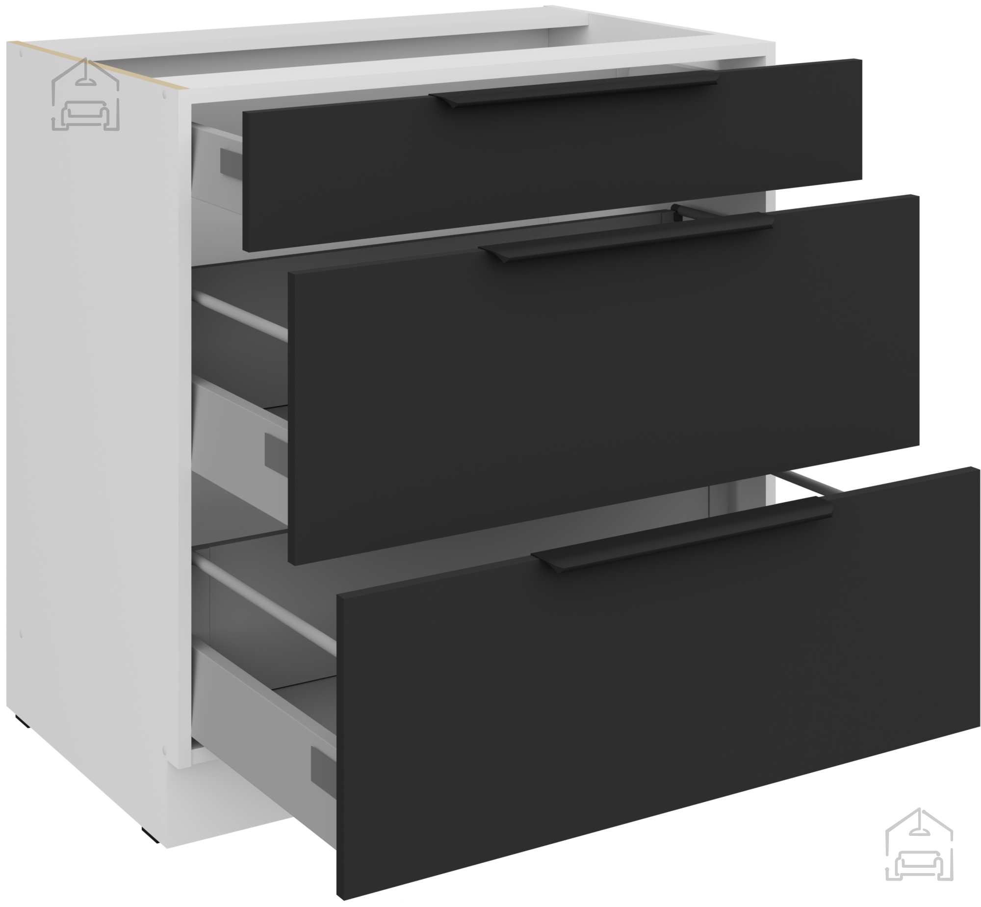 Schwarz und Weiß schaffen einen zeitlosen Kontrast, der sowohl zu modernen als auch klassischen Interieurs perfekt passt. Der Korpus und die Fronten aus laminierter Platte mit 16 mm Stärke gewährleisten eine lange Lebensdauer und einfache Pflege, während die schwarz-aluminiumfarbenen Griffe Edge UA-HEXA einen Hauch moderner Eleganz hinzufügen. Dank ihrer universellen Farbkombination passt die Küchenzeile Aria gut zu verschiedenen Arten von Bodenbelägen, Wänden und Accessoires – von Holztönen bis zu Betonoberflächen.