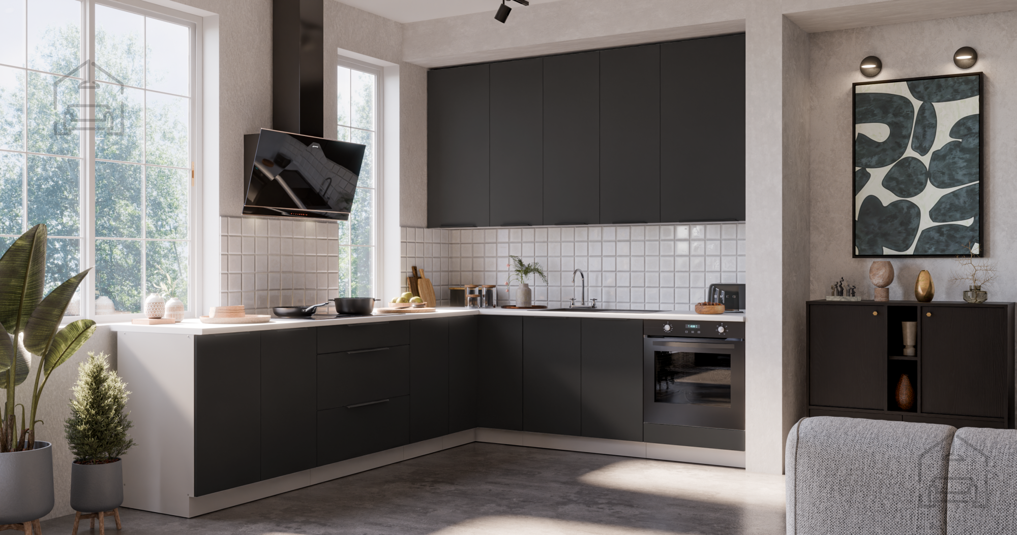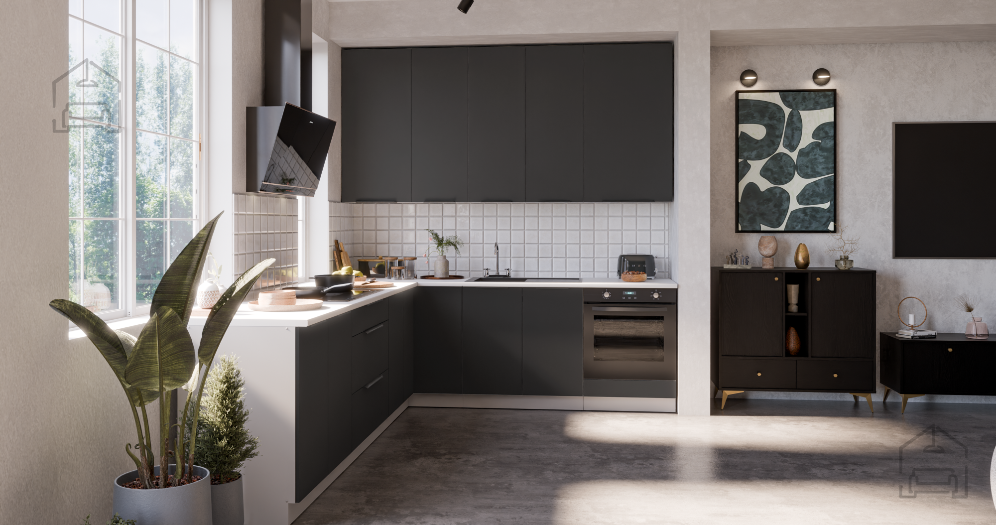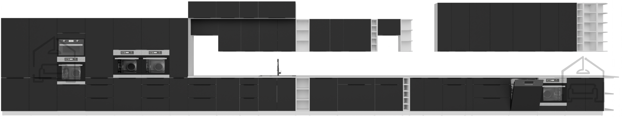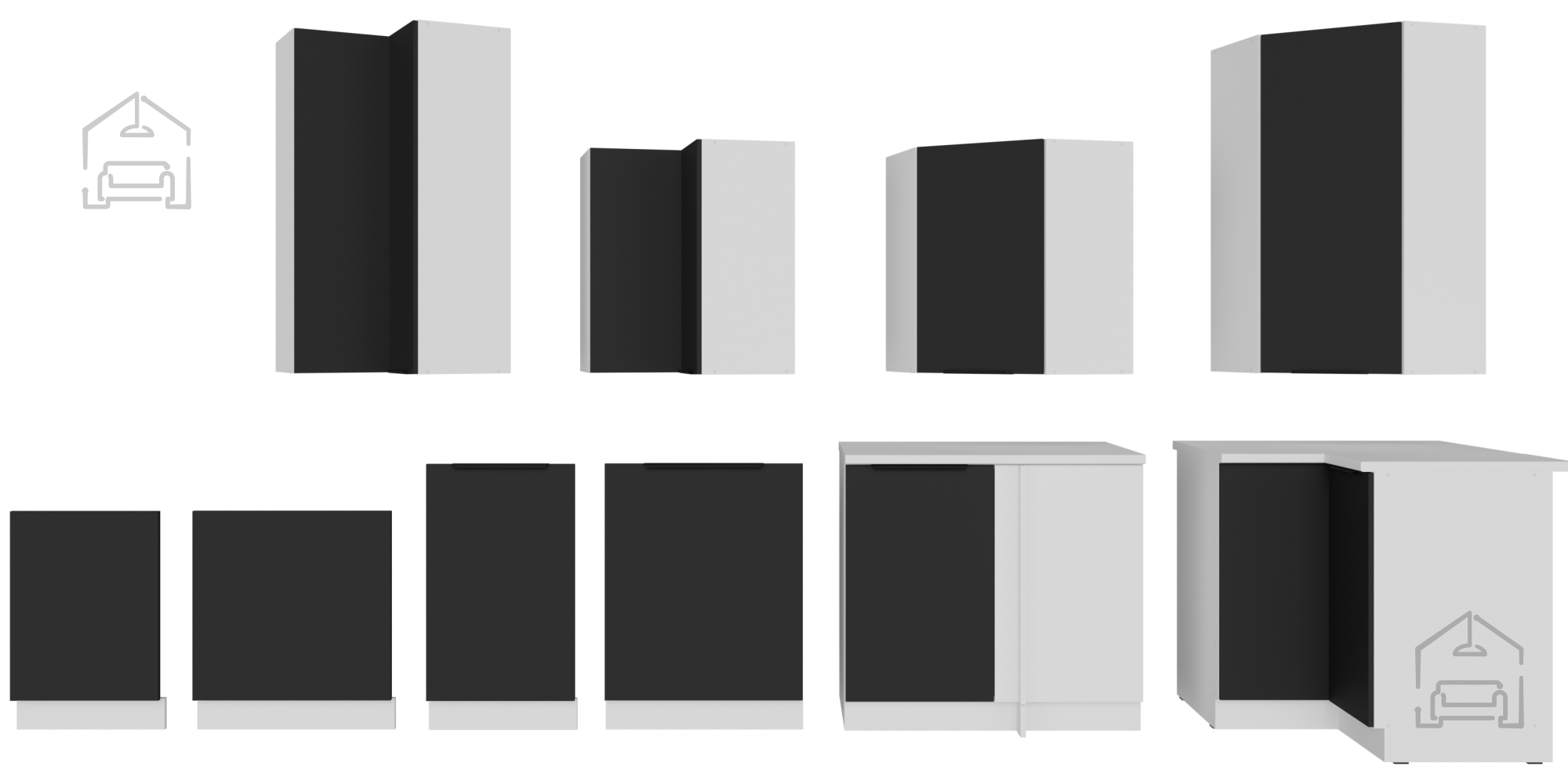 Schwarz und Weiß schaffen einen zeitlosen Kontrast, der sowohl zu modernen als auch zu klassischen Interieurs perfekt passt. Korpus und Fronten aus 16 mm starker laminierter Platte gewährleisten eine lange Lebensdauer und einfache Pflege, während die schwarz-aluminiumfarbenen Griffe Edge UA-HEXA einen Hauch moderner Eleganz verleihen. Aufgrund ihrer universellen Farbkombination passt das Küchenset Aria gut zu verschiedenen Bodenbelägen, Wänden und Accessoires – von Holztönen bis hin zu Betonoberflächen.