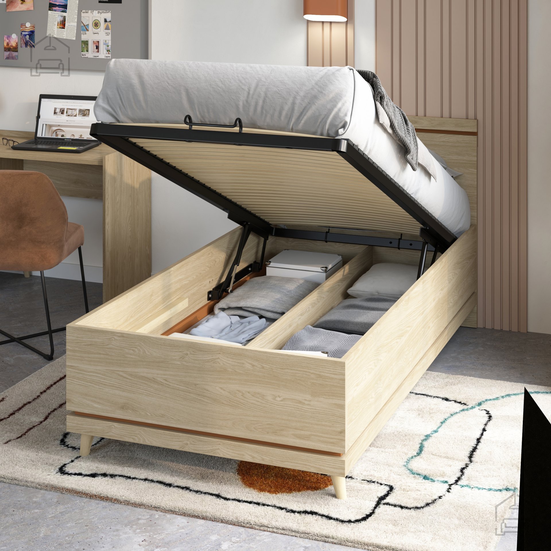 Das Bett Scandi mit Hebemechanismus 100x200 cm ist eine ausgezeichnete Wahl für Einzelpersonen, Jugendliche oder kleinere Schlafzimmer, in denen jeder Zentimeter Platz wertvoll ist. Seine Abmessungen (105x207x100 cm) ermöglichen eine bequeme Ruhe, ohne zu viel Platz einzunehmen. Aufgrund seiner schlichten, aber ausgefeilten Form passt es sowohl in klassische als auch in moderne Interieurs. Mit dem Kauf dieses Bettes erhalten Sie nicht nur ein hochwertiges Möbelstück, sondern auch eine clevere Aufbewahrungslösung und ein ästhetisches Element, das Ihr Schlafzimmer bereichert. Seine Kombination aus natürlichen Tönen und funktionalem Design schafft eine harmonische Atmosphäre, die Entspannung und erholsamen Schlaf fördert. Wenn Sie Ihrem Zuhause einen Hauch von Natur, moderne Eleganz und praktische Nutzbarkeit verleihen möchten, ist dieses Bett die richtige Wahl für Sie. Entdecken Sie, wie Sie Komfort, Schönheit und intelligente Raumnutzung in einem Produkt vereinen können – einem Bett, das zum Mittelpunkt Ihres Schlafzimmers wird und jeden Tag erholsamen Schlaf bietet.