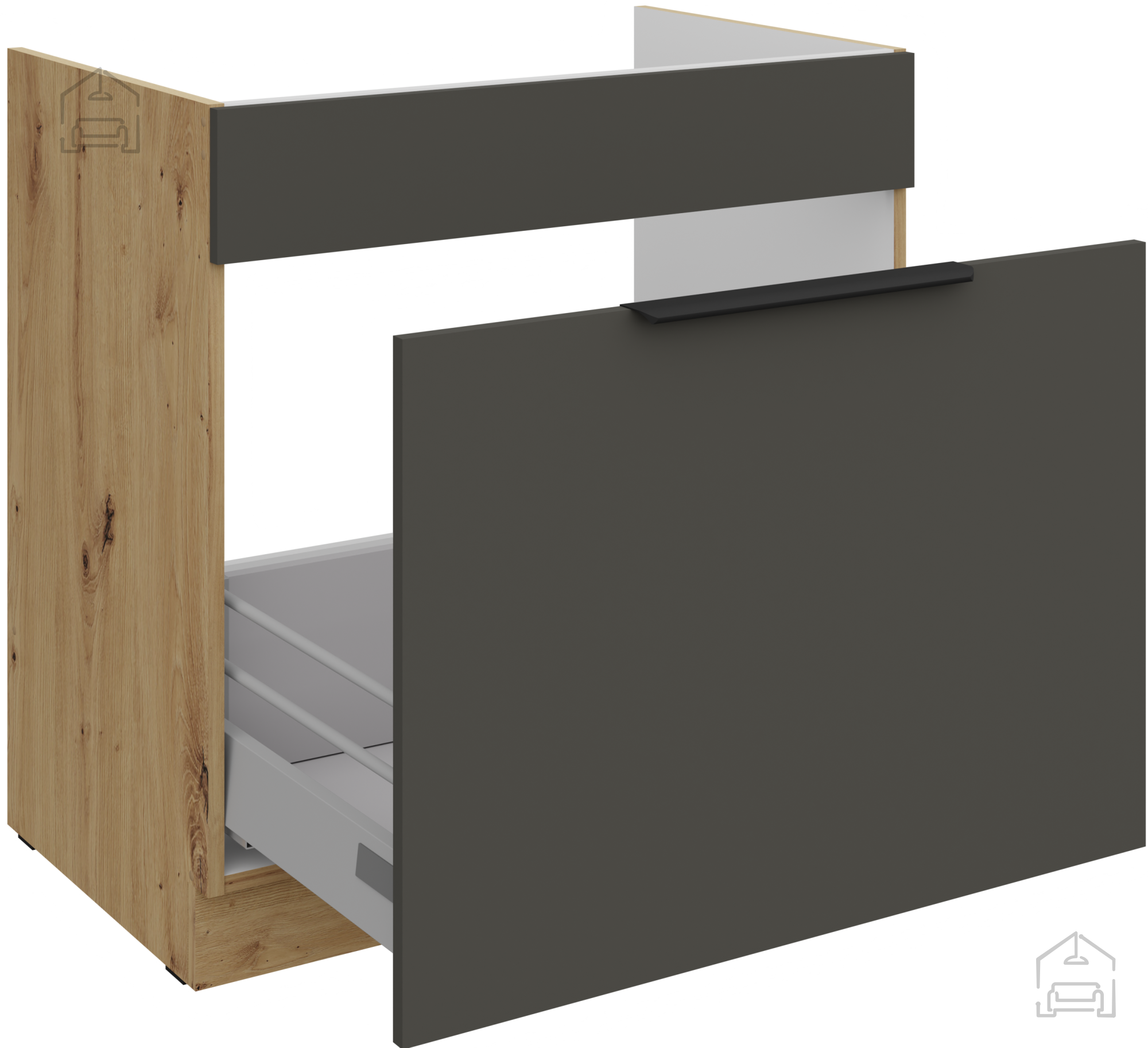 Die Küchenzeile in der Kombination aus grauer Farbe und Eichenholz Artisan stellt ein perfektes Gleichgewicht zwischen der Wärme von natürlichem Holz und moderner minimalistischer Ästhetik dar. Dieses wunderschön gestaltete Küchenensemble ist für alle gedacht, die Qualität, Praktikabilität und ein elegantes Erscheinungsbild des Raumes schätzen. Mit präziser Verarbeitung aus laminierter Platte mit einer Stärke von 16 mm gewährleistet sie eine lange Lebensdauer und Widerstandsfähigkeit gegen tägliche Belastungen und behält gleichzeitig ein raffiniertes Aussehen, das jeden Besucher begeistern wird.