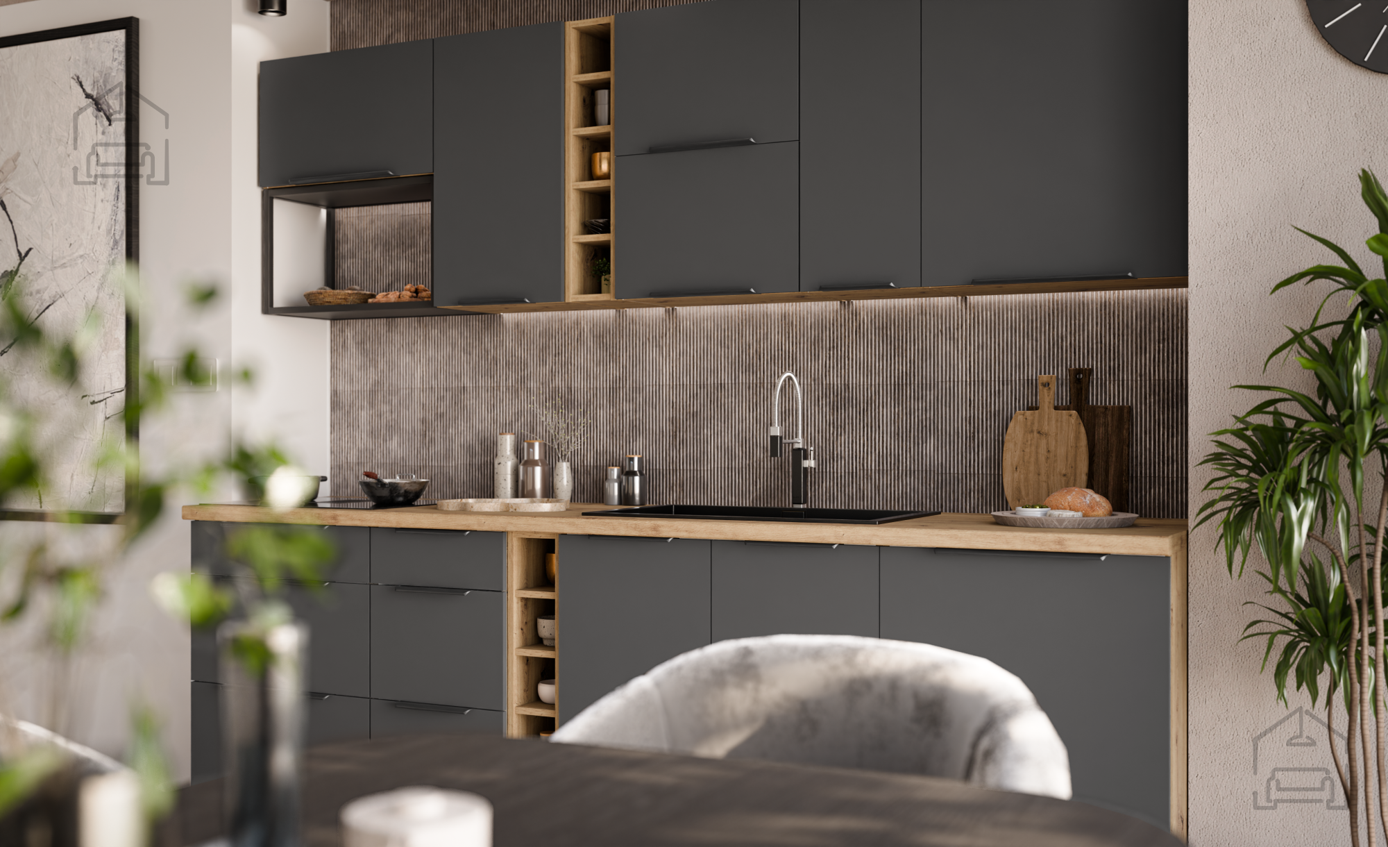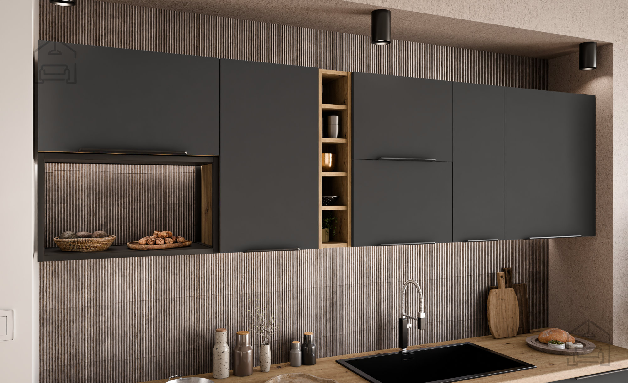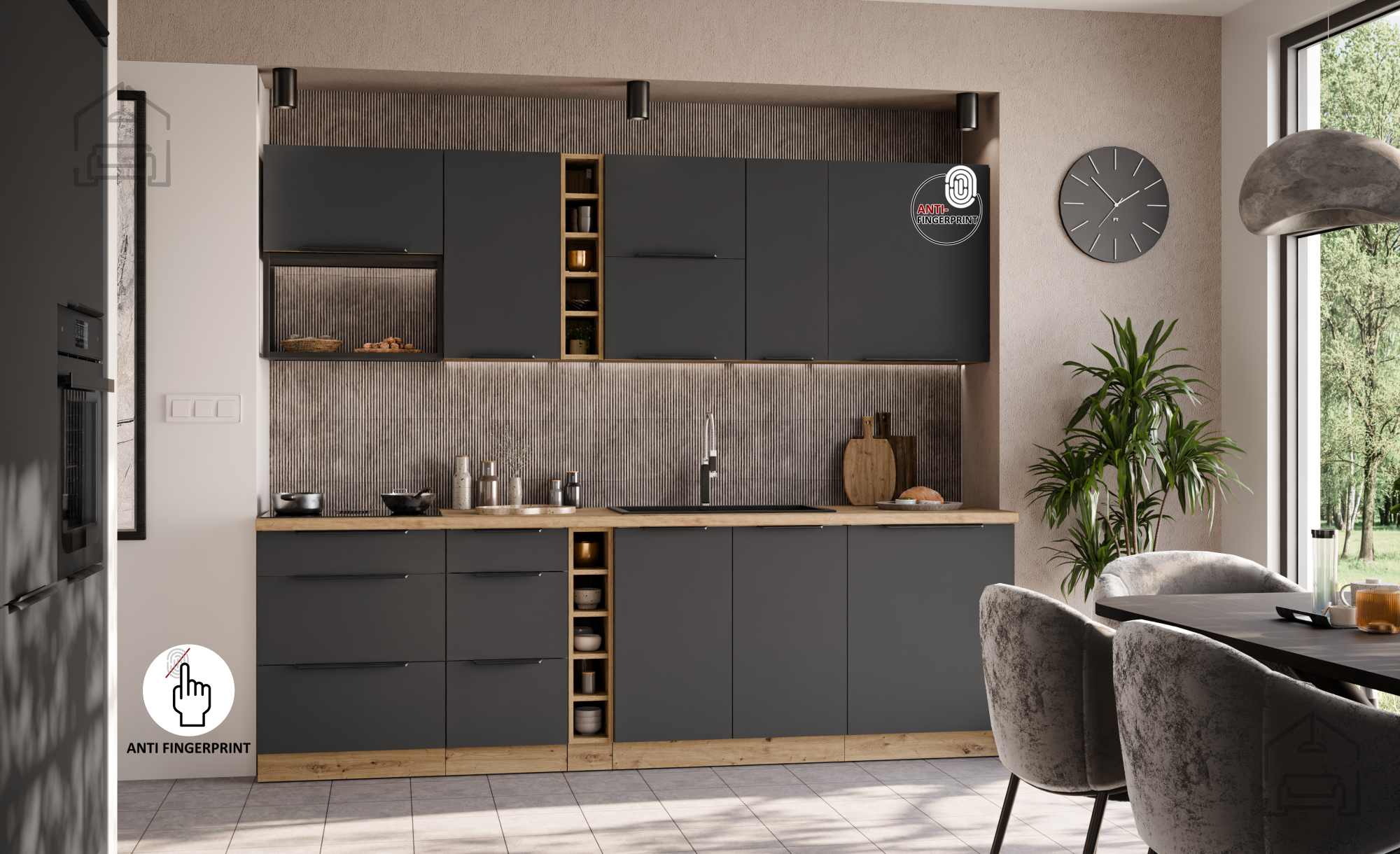 Die Griffe Edge UA-HEXA aus schwarz-aluminiertem Material sind ein modernes Detail, das das minimalistische Design betont und einen bequemen Halt gewährleistet. Der Abstand zwischen den Griffen (64 mm – 320 mm) ermöglicht eine harmonische Integration in verschiedene Elemente, was zu einem ganzheitlichen und ausgewogenen Erscheinungsbild der Küche beiträgt.