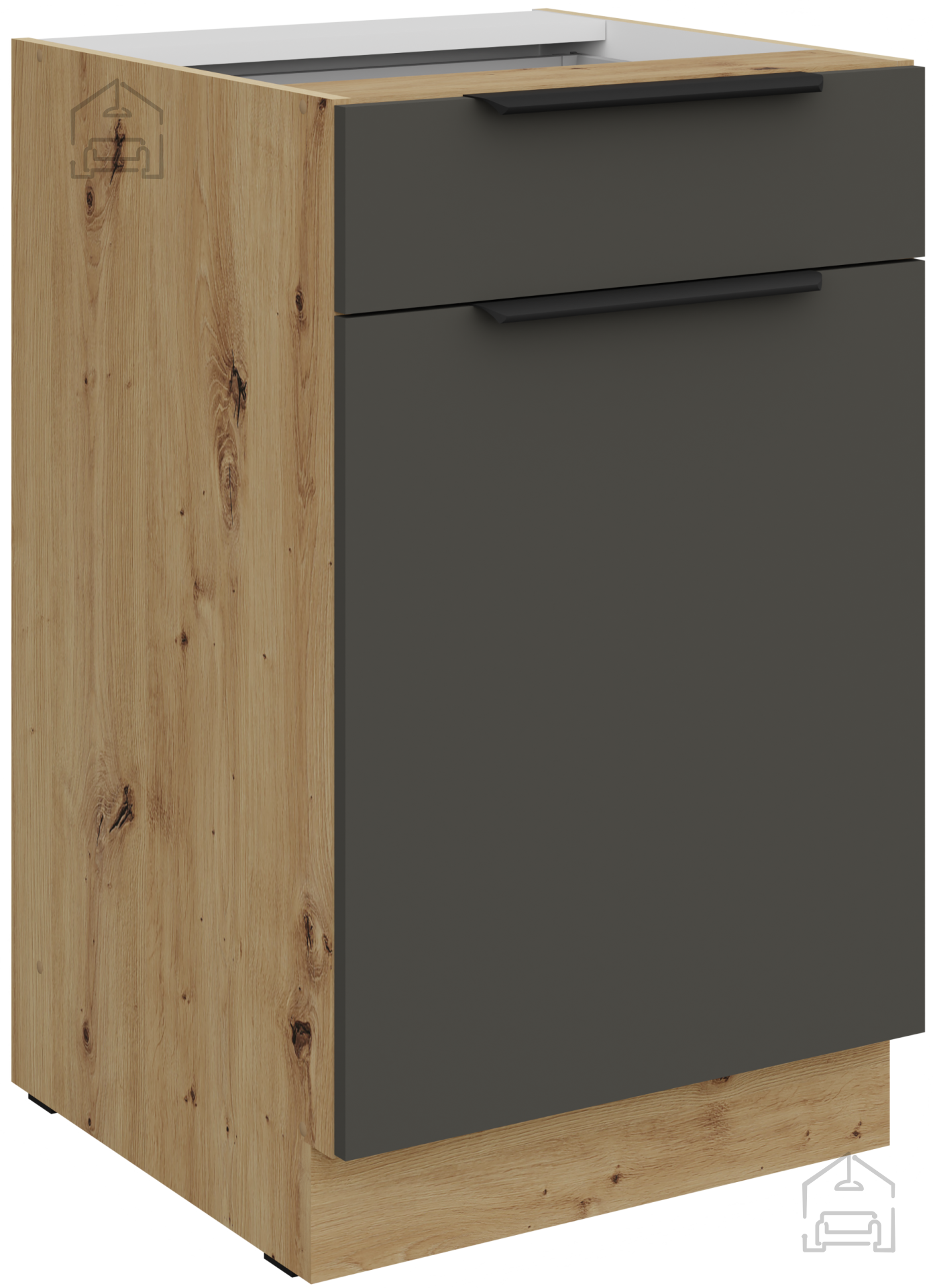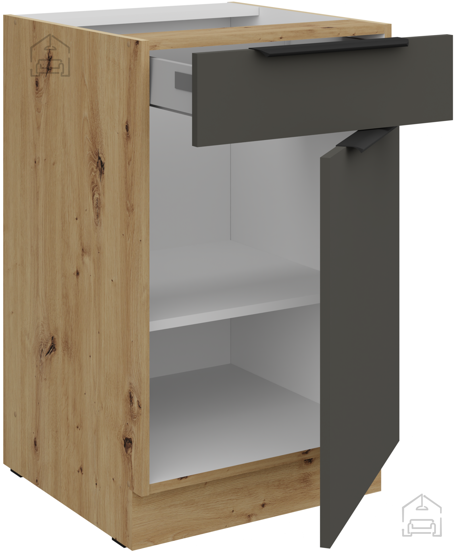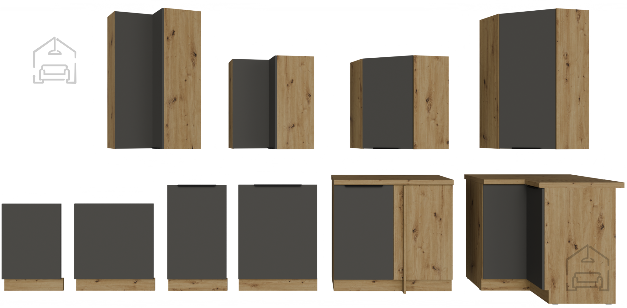 Die Küchenzeile in der Kombination aus grauer Farbe und Artisan-Eiche stellt das perfekte Gleichgewicht zwischen der Wärme von natürlichem Holz und moderner minimalistischer Ästhetik dar. Dieses wunderschön gestaltete Küchenensemble ist für alle gedacht, die Qualität, Funktionalität und ein elegantes Erscheinungsbild des Raumes schätzen. Mit präziser Verarbeitung aus laminierter Platte mit einer Stärke von 16 mm gewährleistet sie eine lange Lebensdauer und Widerstandsfähigkeit gegen tägliche Belastungen, während sie gleichzeitig ein raffiniertes Aussehen bewahrt, das jeden Besucher begeistern wird.
