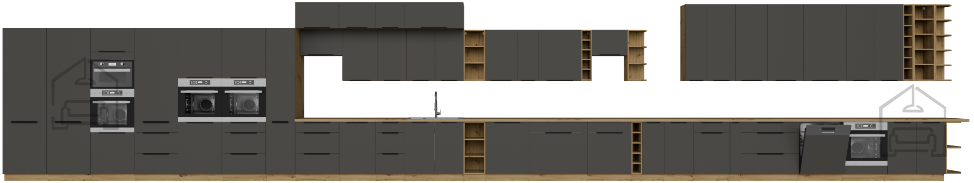 Das Besondere an dieser Küchenzeile ist das ästhetische Spiel der Kontraste – sanftes Grau harmoniert wunderbar mit der natürlichen Struktur der Artisan-Eiche, wodurch eine angenehme, heimelige Atmosphäre entsteht. Jede Oberfläche ist sorgfältig bearbeitet, um ein Gefühl von Wärme und Prestige zu vermitteln, bleibt jedoch gleichzeitig leicht zu reinigen und zu pflegen. Die Arbeitsplatte im Dekor Marmor Roma (38-6499) verleiht einen Hauch von Luxus und sorgt für eine langlebige und elegante Basis für die Zubereitung von Mahlzeiten.