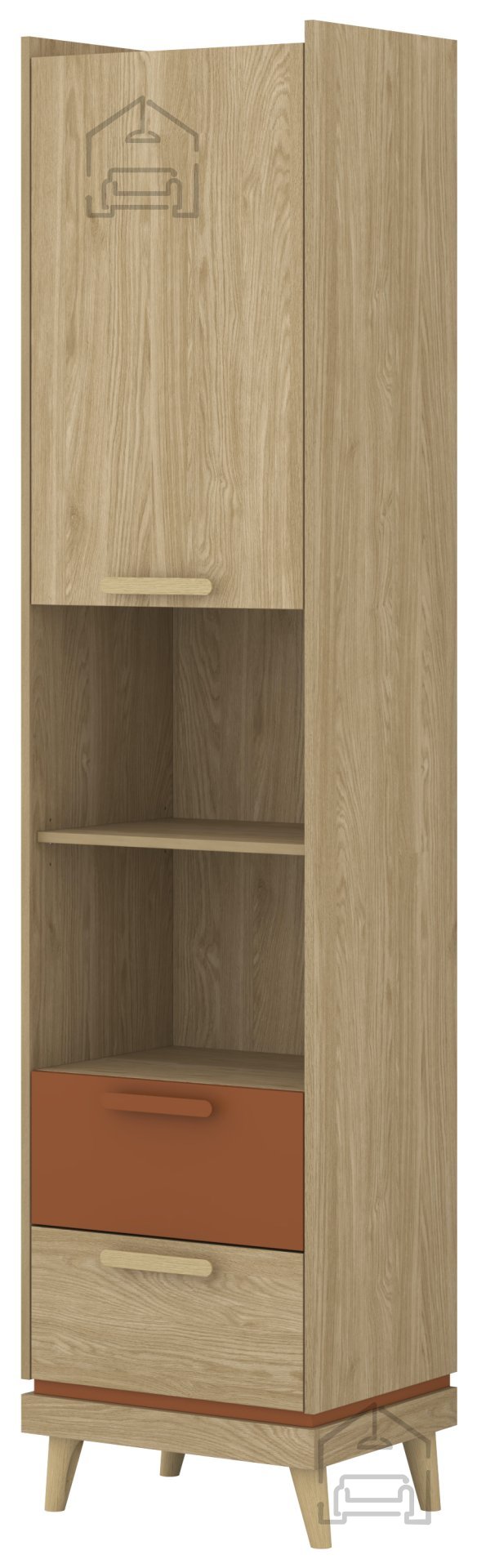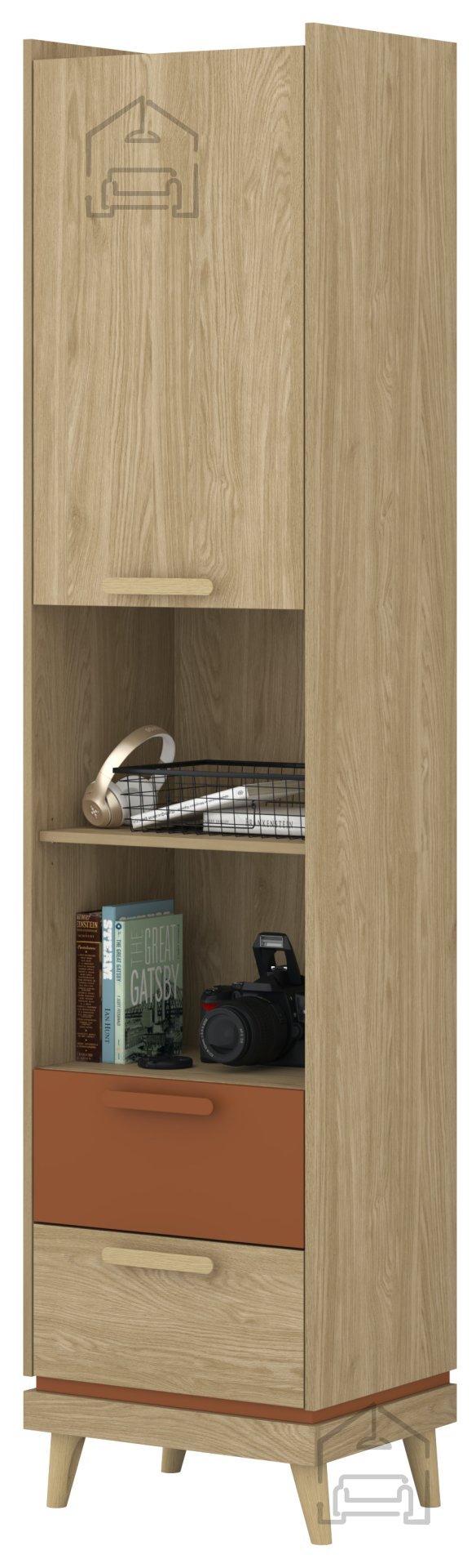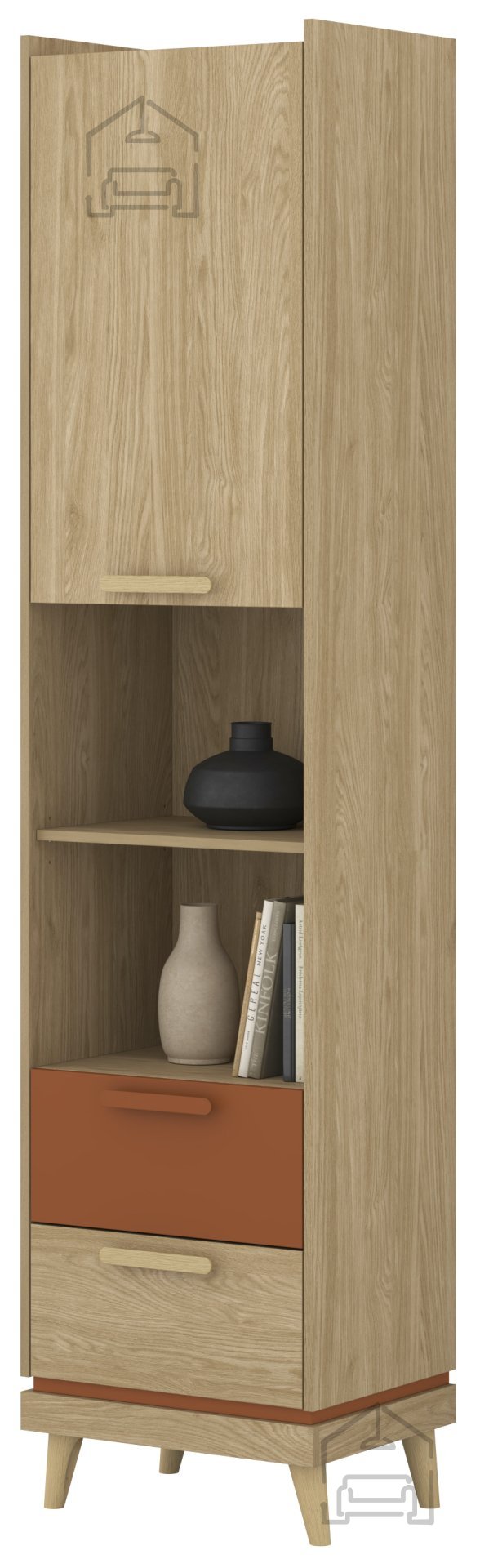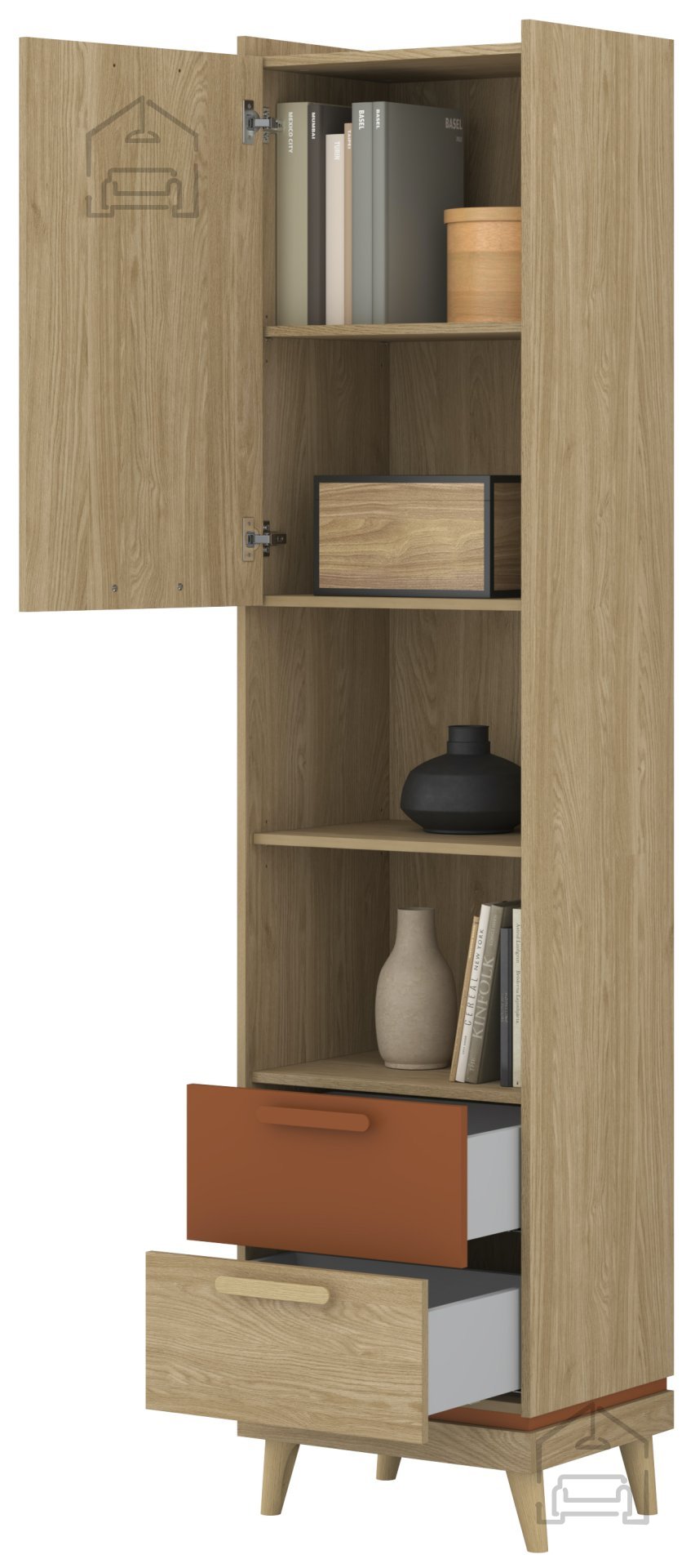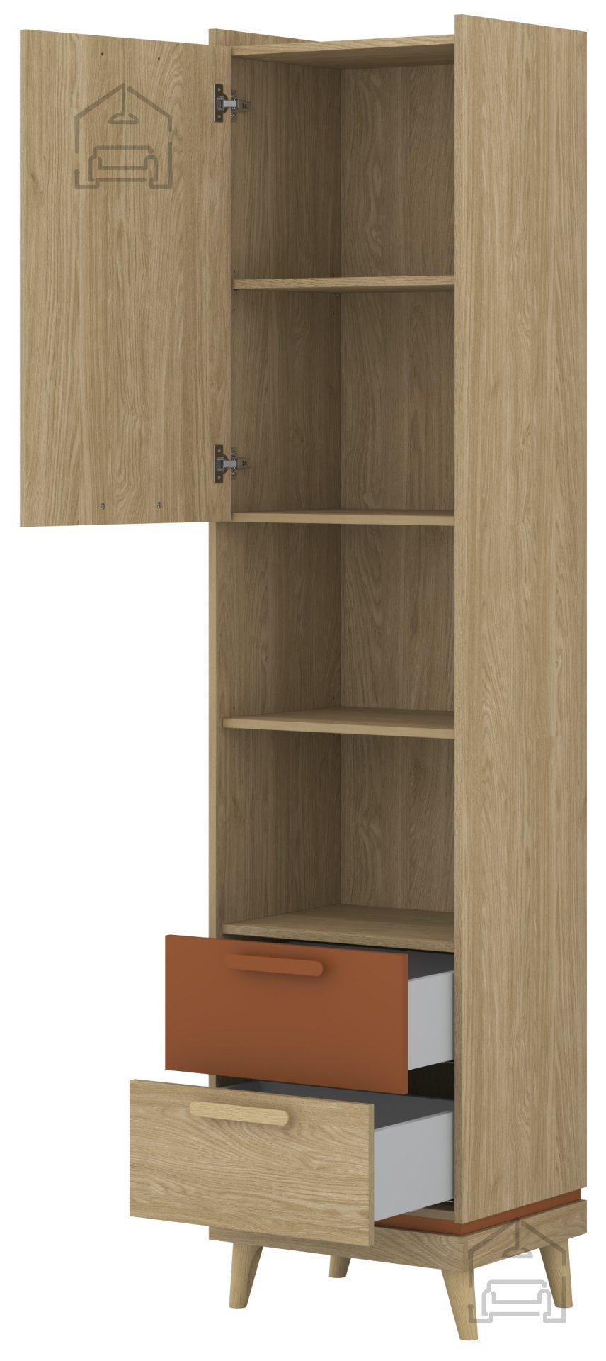 Schrank Scandi in der Kombination von geölter Eiche und warmer Ziegelsteinfarbe ist die perfekte Wahl für alle, die skandinavische Eleganz, Funktionalität und zeitloses Design in ihrem Zuhause wünschen. Dieser hohe und schmale Schrank mit den Maßen 50x40x215 cm ist die ideale Lösung für kleinere Räume, in denen jeder Zentimeter zählt, und bietet gleichzeitig überraschend viel Stauraum. Er ist aus hochwertiger Möbelplatte mit einer Stärke von 15 und 22 mm gefertigt, was Stabilität, Langlebigkeit und Beständigkeit bei täglicher Nutzung gewährleistet.