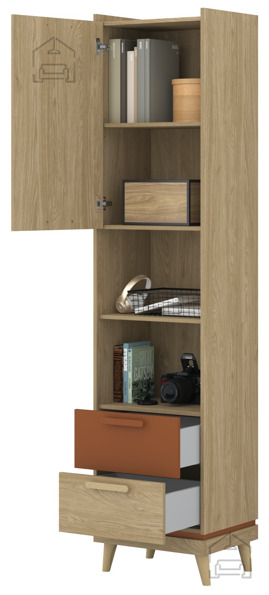 Der Schrank ist mit Blick auf Benutzerfreundlichkeit und Ästhetik konzipiert. Das einflügelige Design mit zwei geräumigen Schubladen ermöglicht eine übersichtliche Organisation von Kleidung, Büchern, Dokumenten oder persönlichen Gegenständen. Aufgrund seiner Höhe eignet er sich auch ideal zur Aufbewahrung von Gegenständen, die Sie griffbereit, aber dennoch ordentlich verstaut haben möchten. Die Kombination aus Regalen und Schubladen ermöglicht eine flexible Nutzung im Wohnzimmer, Schlafzimmer, Flur, Arbeitszimmer oder sogar im Kinderzimmer.