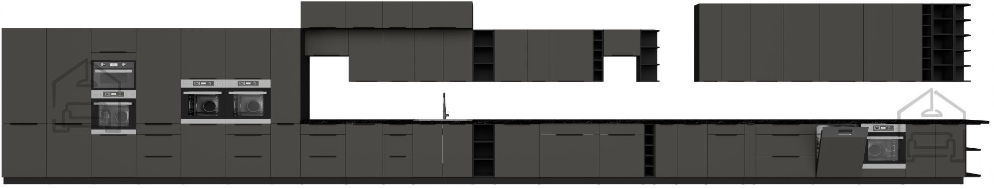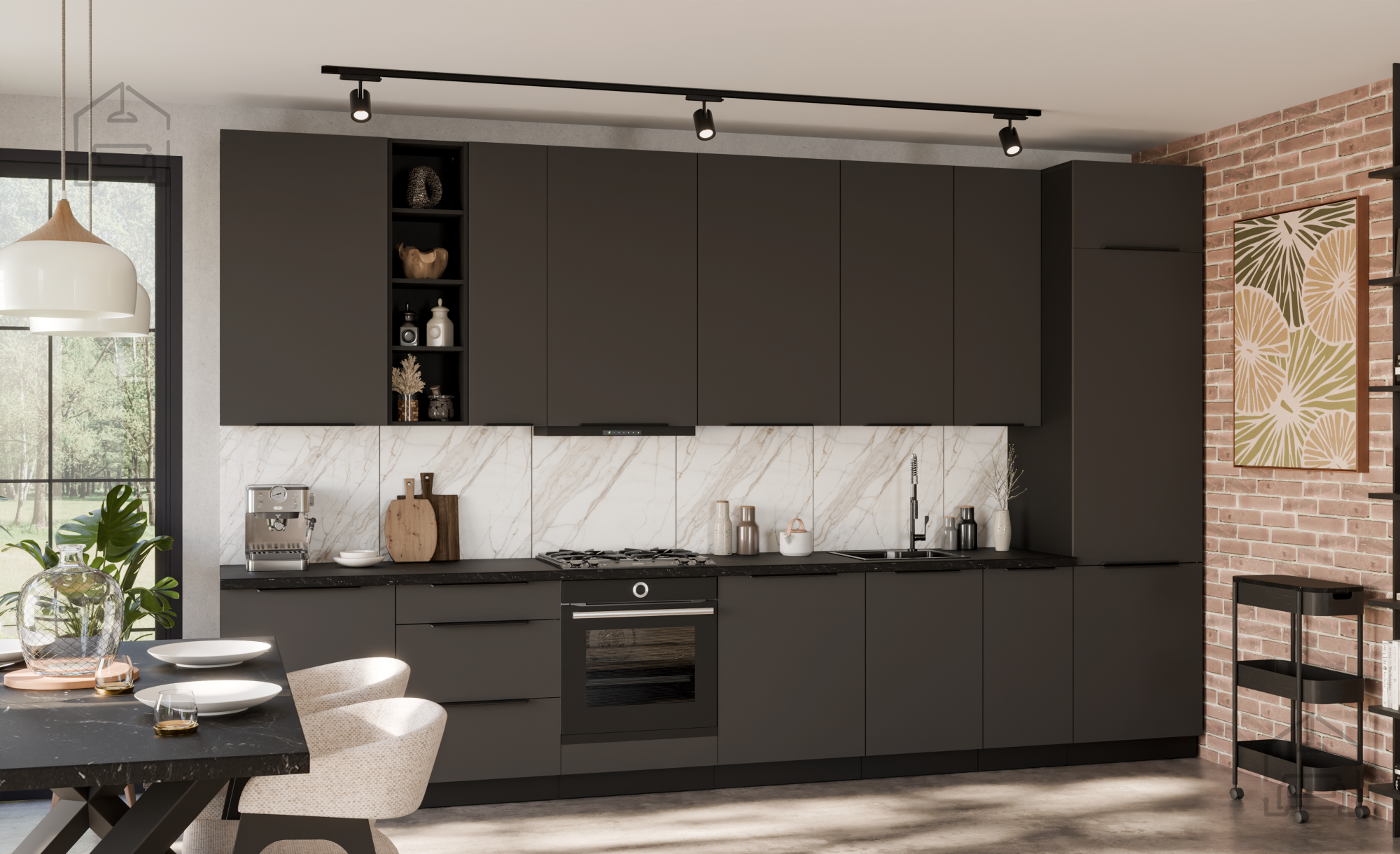 Grau und Schwarz bilden das perfekte Gleichgewicht zwischen Wärme und Eleganz. Eine solche Farbkombination passt hervorragend sowohl zu hellen als auch zu dunkleren Bodenbelägen und Wänden, sodass sich das Küchenensemble Aria leicht in verschiedene Einrichtungsstile integrieren lässt – von industriell bis skandinavisch. Die schwarz-aluminiumfarbenen Griffe Edge UA-HEXA mit klaren Linien verleihen einen Hauch von Modernität und Raffinesse und ermöglichen gleichzeitig ein bequemes und sicheres Öffnen der Fronten und Schubladen.