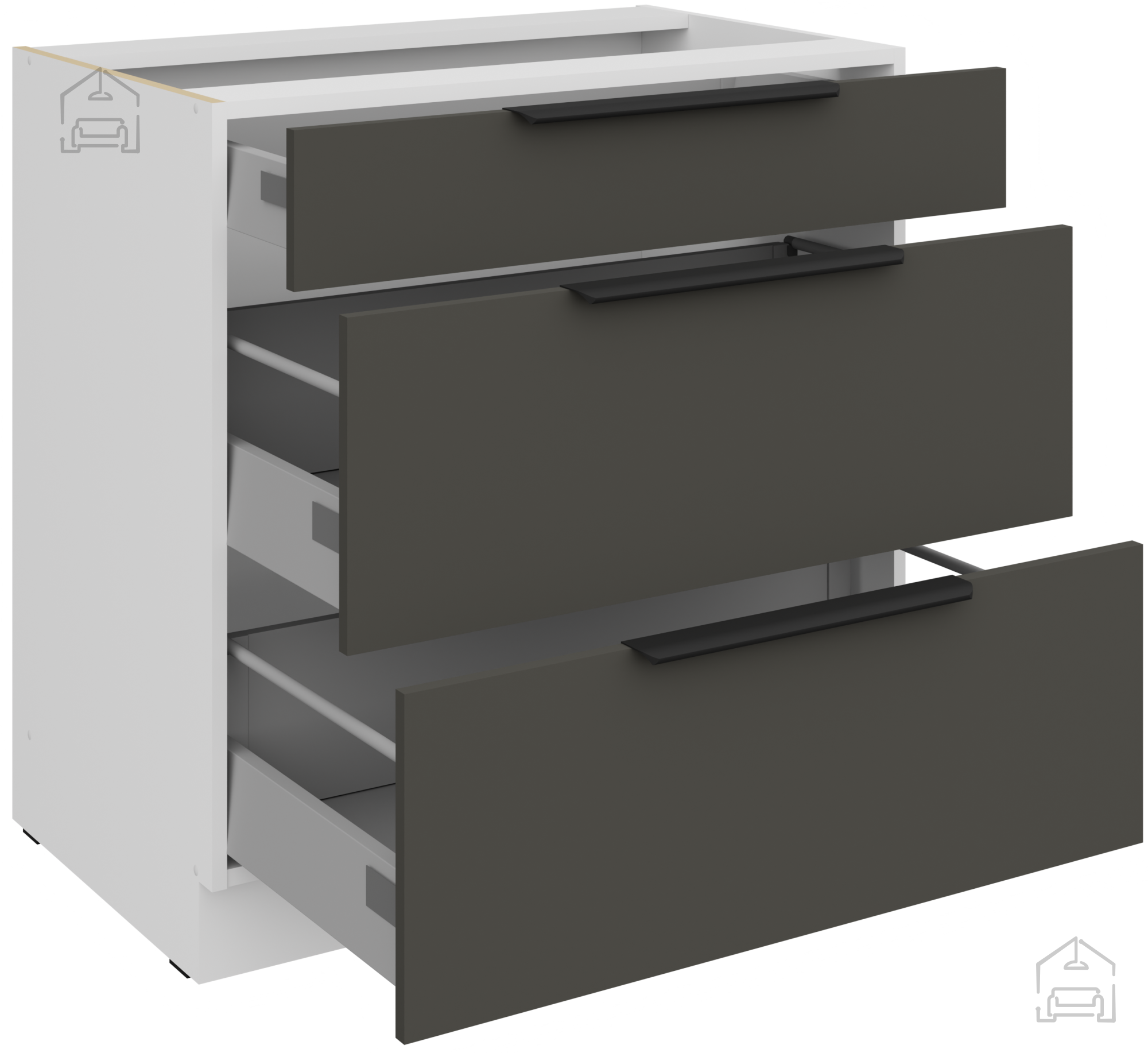Alle Schubladen und Fronten des Küchenensembles Aria sind mit einem Soft-Close-System ausgestattet. Dieser Mechanismus verhindert ein plötzliches Zuschlagen der Türen und reduziert Geräusche, was den Benutzerkomfort erheblich erhöht. Eine solche Lösung ist ideal für offene Grundrisse, in denen die Küche mit dem Wohnbereich verbunden ist, da sie auch während des Kochens oder Aufräumens eine ruhige und angenehme Atmosphäre bewahrt.