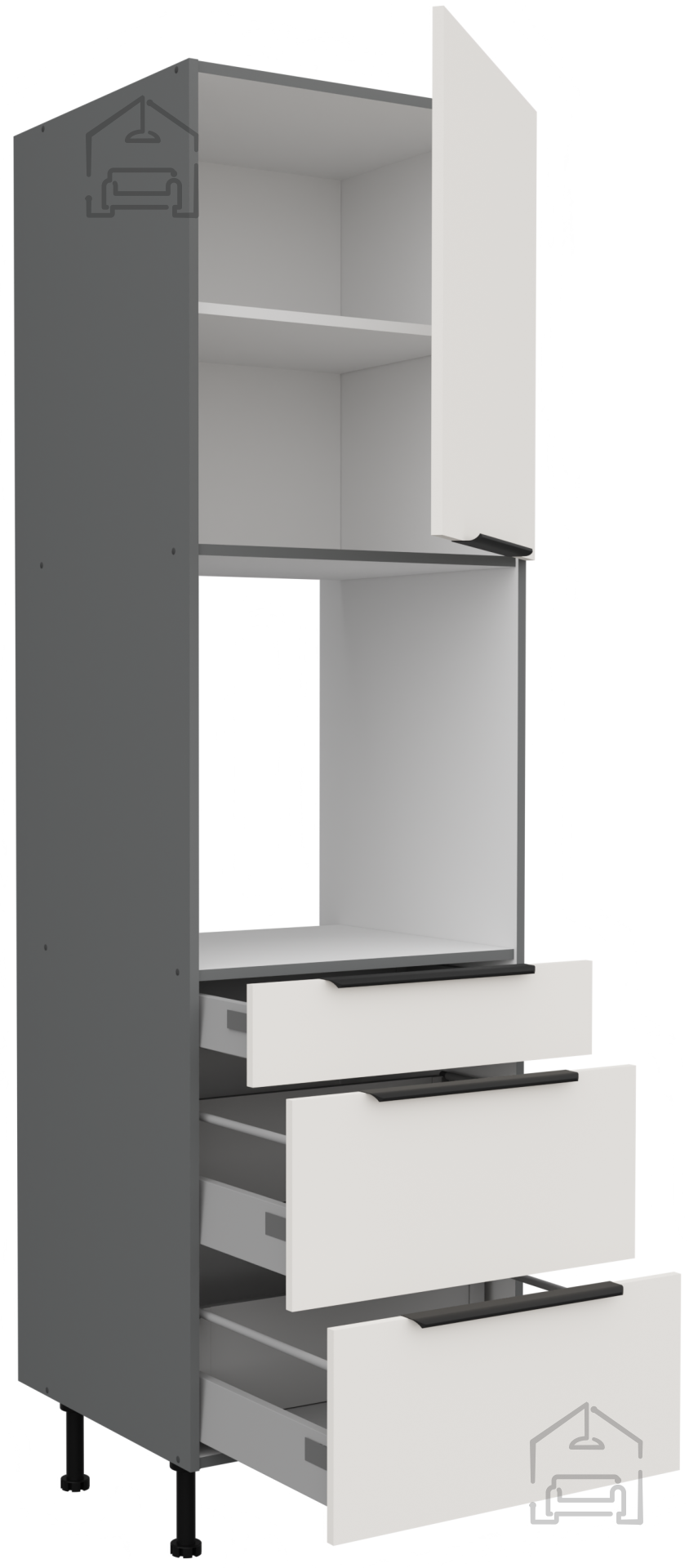 Das Küchenensemble Aria des polnischen Herstellers Stolarz-Lempert vereint minimalistische Ästhetik, Funktionalität und Verarbeitungsqualität, die man von einer modernen Küche erwartet. Es besteht aus einer strapazierfähigen laminierten Platte mit einer Stärke von 16 mm, die eine lange Lebensdauer, Feuchtigkeitsbeständigkeit und einfache Reinigung der Oberflächen gewährleistet. Die Kombination aus Weiß und Anthrazit schafft ein modernes, aber zugleich warmes Erscheinungsbild, das gut zu verschiedenen Einrichtungsstilen passt – von modernen bis zu klassischen Umgebungen.