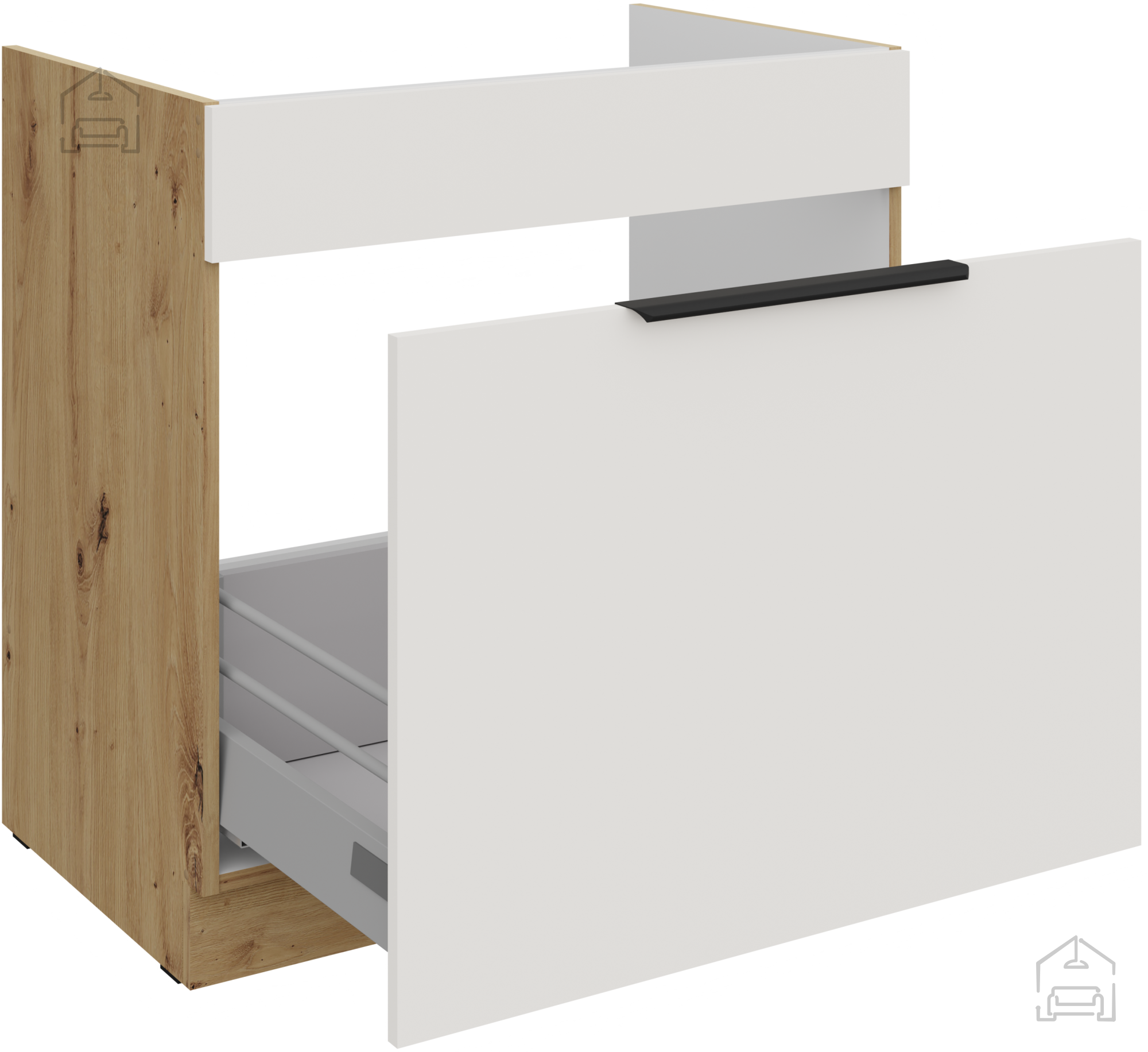 Die Grundlage des Küchenensembles Aria ist ein Rahmen aus Spanplatte, was eine stabile Konstruktion und gute Belastungsbeständigkeit bedeutet. Die Oberflächen sind mit einer hochwertigen Laminierung versehen, die vor Feuchtigkeit und mechanischen Beschädigungen schützt. Die Kombination aus weißer Farbe und dem Farbton Artisan-Eiche schafft einen angenehmen Kontrast zwischen hellen und natürlichen Tönen und verleiht dem Raum ein Gefühl von Wärme und Leichtigkeit.