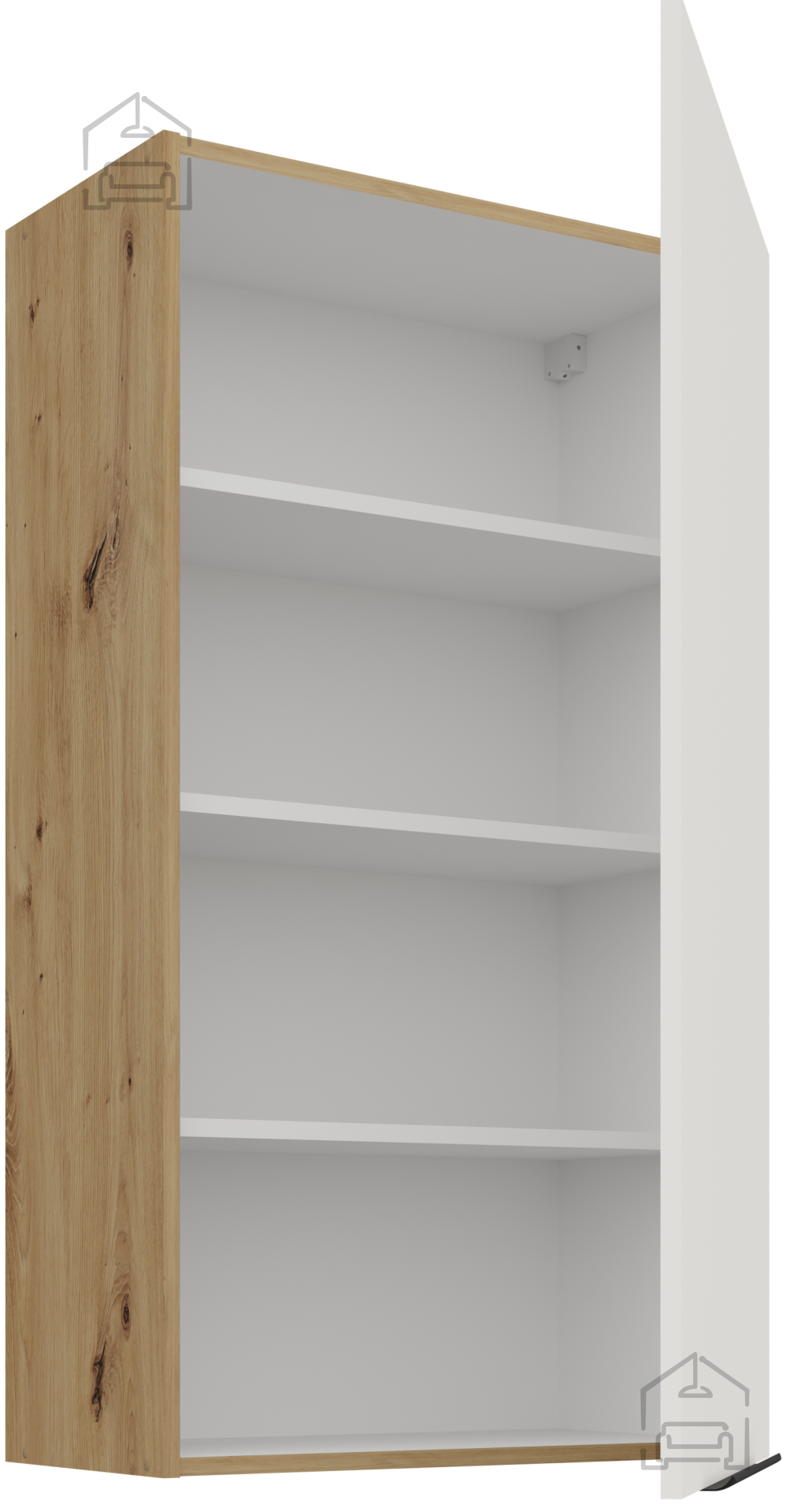 Die Basis des Küchenensembles Aria ist ein Rahmen aus Spanplatte, was eine stabile Konstruktion und gute Belastungsbeständigkeit bedeutet. Die Oberflächen sind mit einer hochwertigen Laminierung versehen, die vor Feuchtigkeit und mechanischen Beschädigungen schützt. Die Kombination aus weißer Farbe und Farbton Artisan-Eiche schafft einen angenehmen Kontrast zwischen hellen und natürlichen Tönen, was dem Raum ein Gefühl von Wärme und Leichtigkeit verleiht.