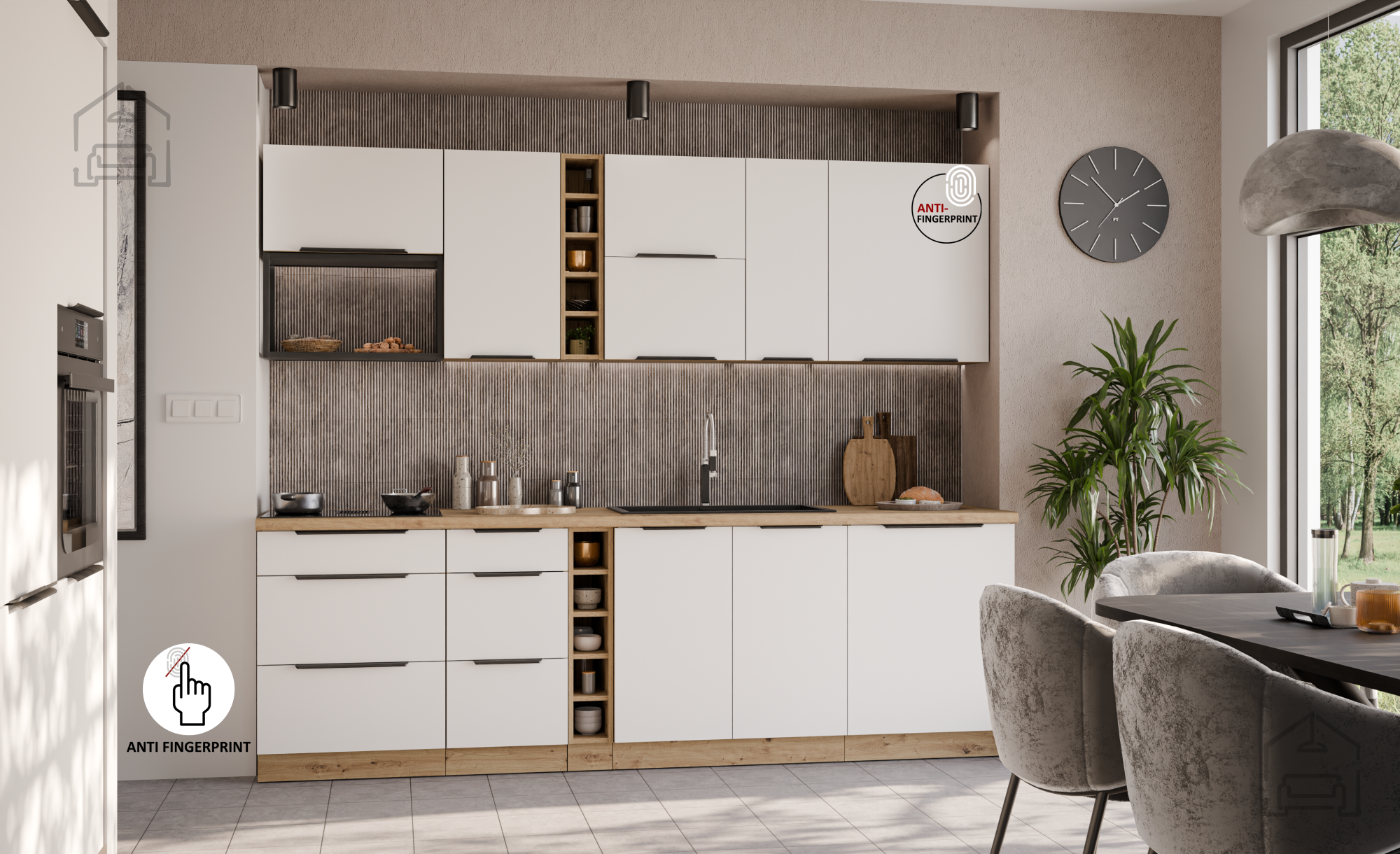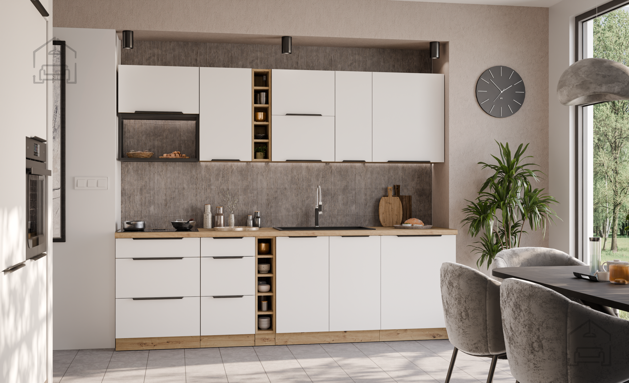 Die Basis des Küchenensembles Aria ist ein Rahmen aus Spanplatte, was eine stabile Konstruktion und gute Belastungsbeständigkeit bedeutet. Die Oberflächen sind mit hochwertiger Laminierung versehen, die vor Feuchtigkeit und mechanischen Beschädigungen schützt. Die Kombination aus weißer Farbe und Farbton Artisan-Eiche schafft einen angenehmen Kontrast zwischen hellen und natürlichen Tönen, was dem Raum ein Gefühl von Wärme und Leichtigkeit verleiht.