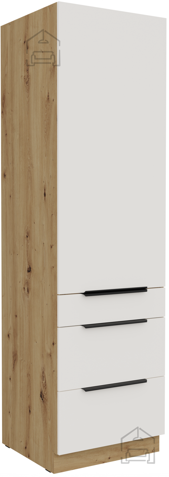 Die Basis des Küchenensembles Aria ist ein Rahmen aus Spanplatte, was eine stabile Konstruktion und gute Belastungsbeständigkeit bedeutet. Die Oberflächen sind mit einer hochwertigen Laminierung versehen, die vor Feuchtigkeit und mechanischen Beschädigungen schützt. Die Kombination aus Weiß und Artisan-Eiche-Farbton schafft einen angenehmen Kontrast zwischen hellen und natürlichen Tönen und verleiht dem Raum ein Gefühl von Wärme und Leichtigkeit.