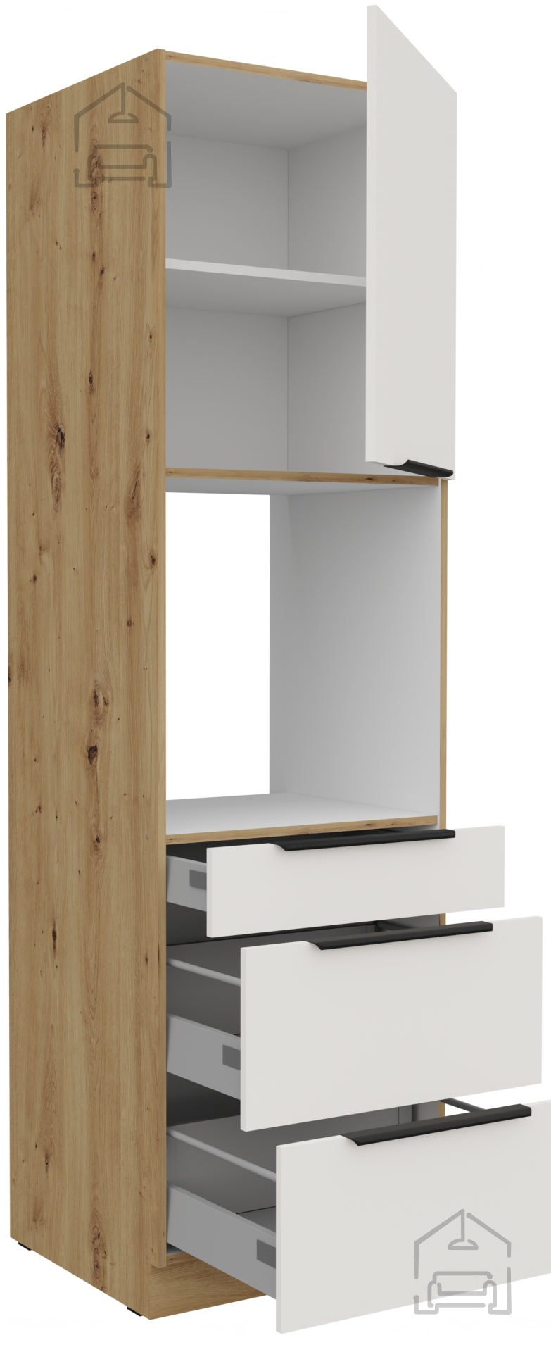 Die Basis des Küchenensembles Aria ist ein Rahmen aus Spanplatte, was eine stabile Konstruktion und gute Belastungsbeständigkeit bedeutet. Die Oberflächen sind mit einer hochwertigen Laminierung behandelt, die vor Feuchtigkeit und mechanischen Beschädigungen schützt. Die Kombination aus weißer Farbe und Farbton Artisan Eiche schafft einen angenehmen Kontrast zwischen hellen und natürlichen Tönen, was dem Raum ein Gefühl von Wärme und Leichtigkeit verleiht.