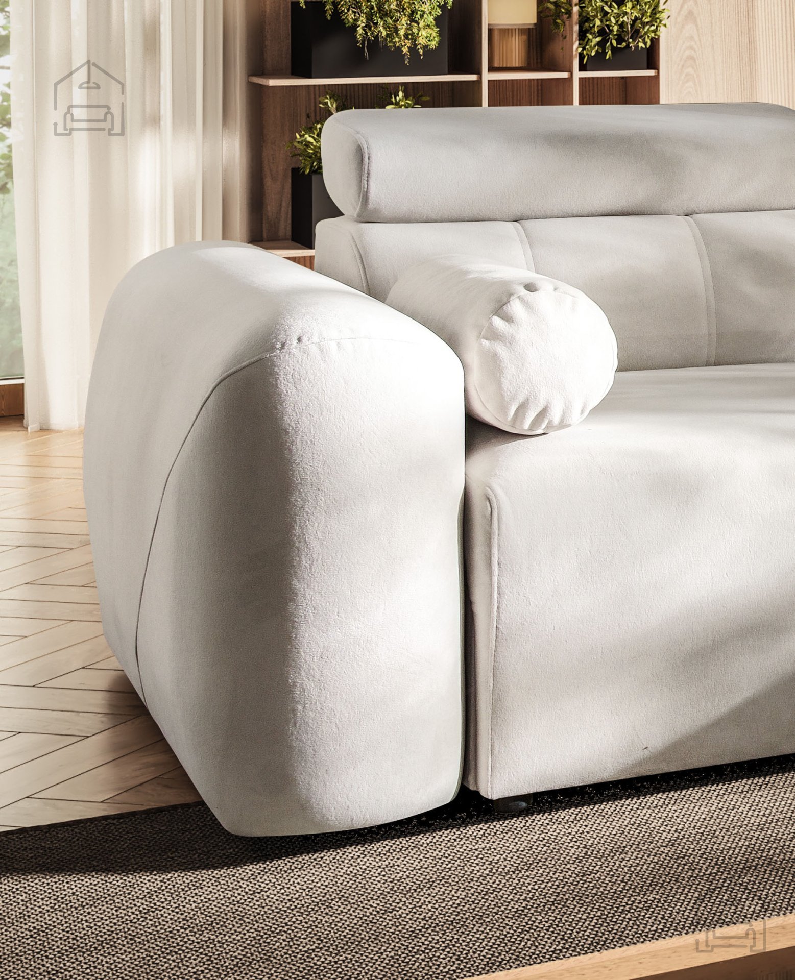 Der Rahmen der Wohnlandschaft besteht aus einer Holzkonstruktion, die mit Spanplatte kombiniert ist, was Festigkeit und Stabilität gewährleistet. Der Sitzbereich wird durch ein Wellenfedersystem unterstützt, das zusammen mit dem verstärkten Schaumstoff T-30 mit einer Dicke von 10 cm optimalen Sitz- und Liegekomfort bietet. In der Standardausführung ist der Ausziehmechanismus vom Typ Puma, der ein sanftes und sicheres Öffnen des Bettes ohne Mühe ermöglicht.