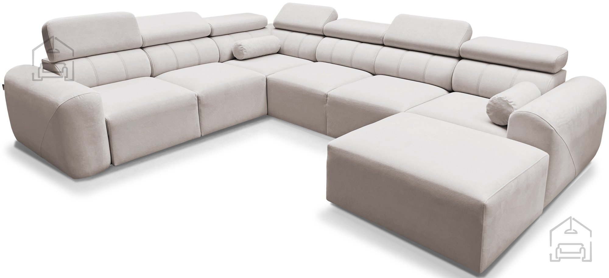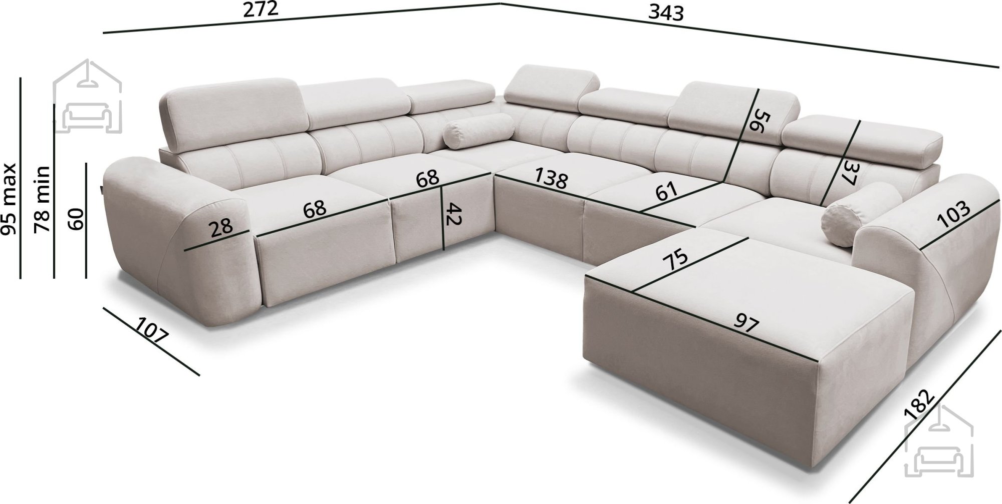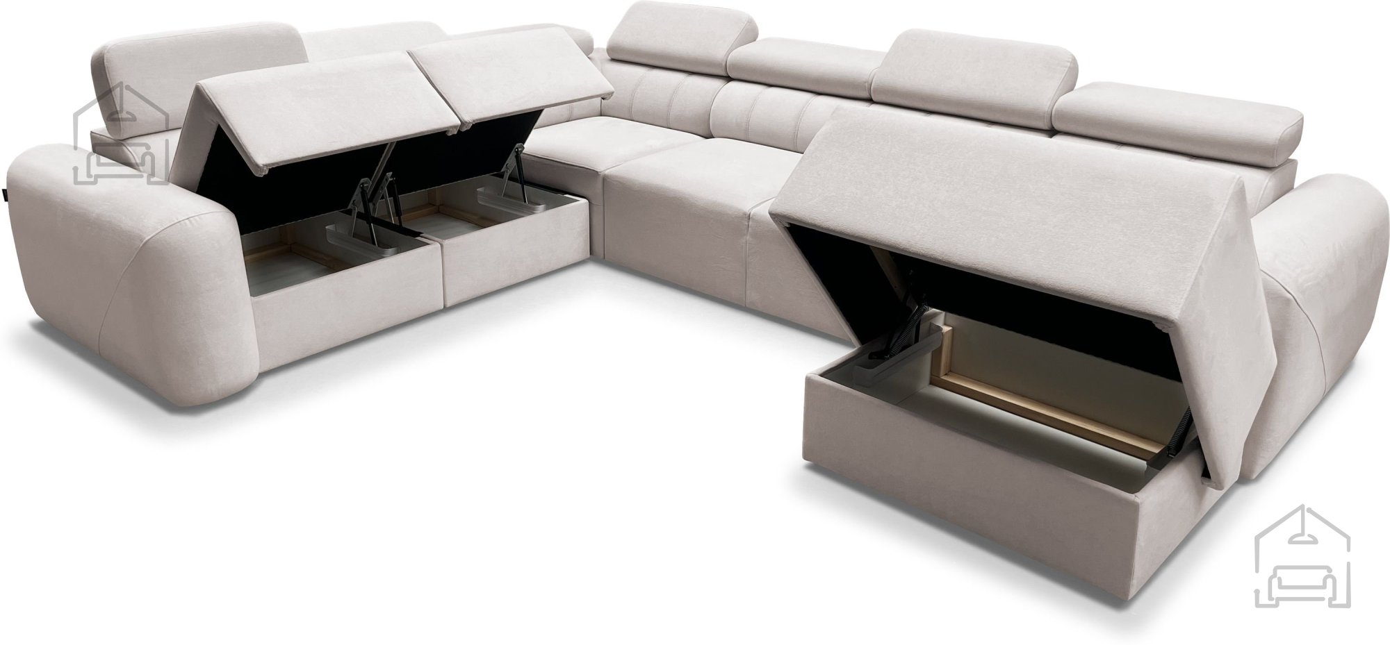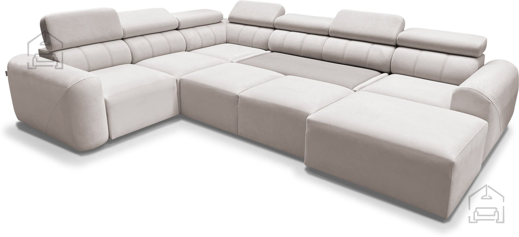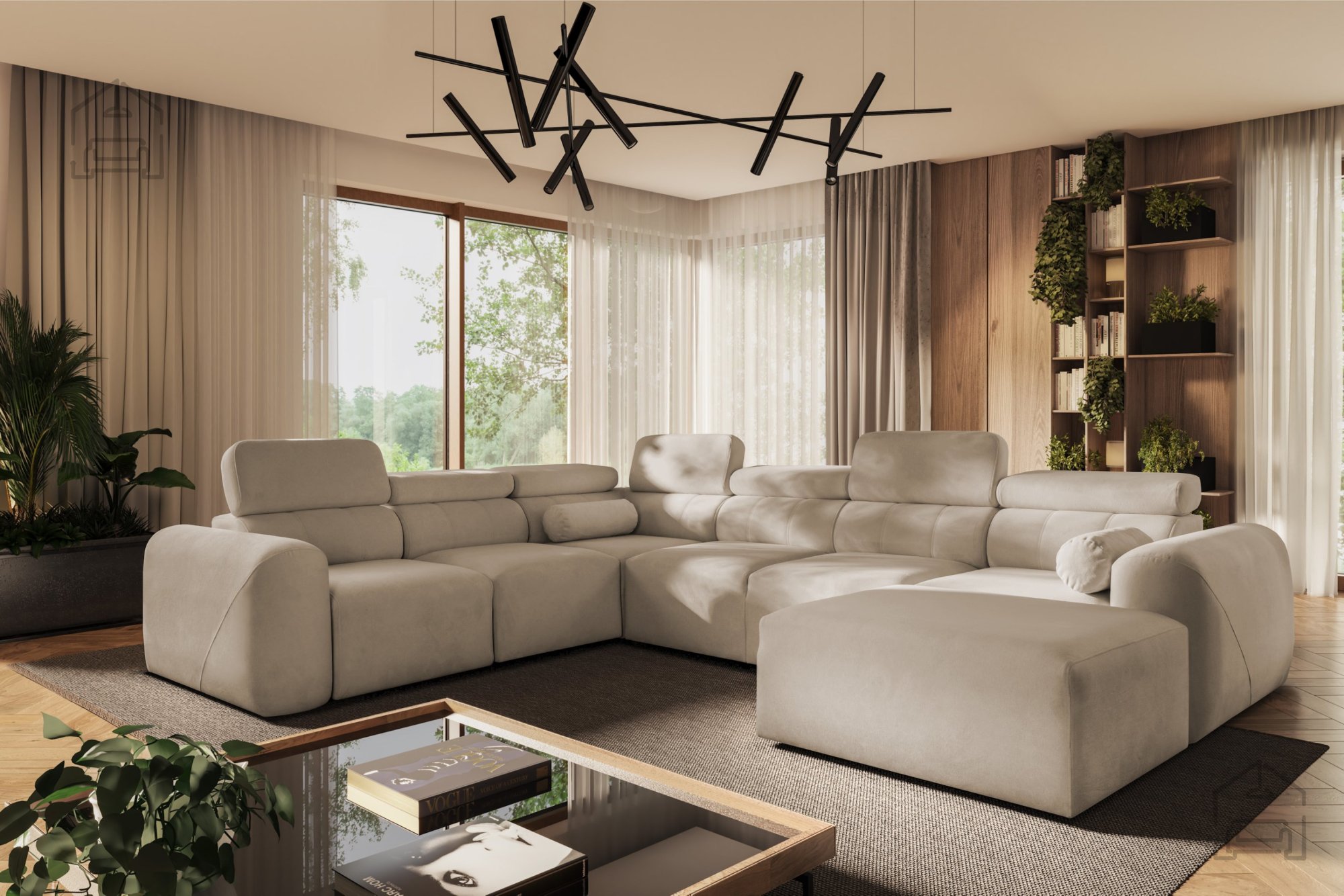 Die U-förmige Wohnlandschaft Volare VIII der Marke Brattex zeichnet sich durch ihre großzügigen Maße von 343x272x95 cm und ihr modernes Design aus, das sich hervorragend in geräumige Wohnzimmer einfügt. Das Produkt ist im modernen Stil gestaltet und wird in Polen hergestellt, was hochwertige europäische Fertigung und ästhetische Perfektion vereint. Die Garnitur ist mit einem Dolphin-Mechanismus ausgestattet, der ein schnelles und einfaches Ausziehen zu einem Bett mit der Größe von 268x132 cm ermöglicht. Außerdem verfügt sie über zwei geräumige Bettzeugschubladen, die zusätzliche Funktionalität für die Aufbewahrung bieten.