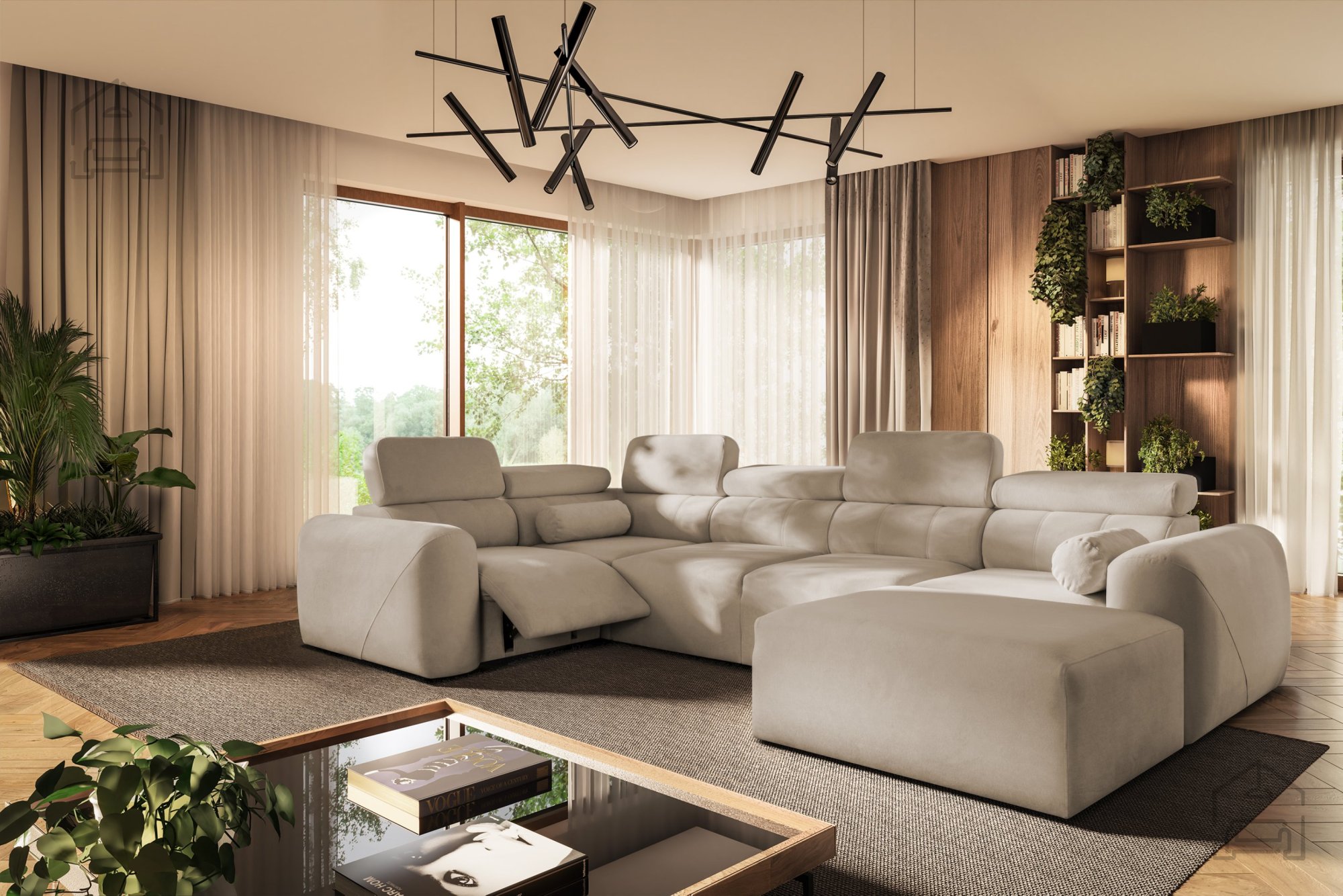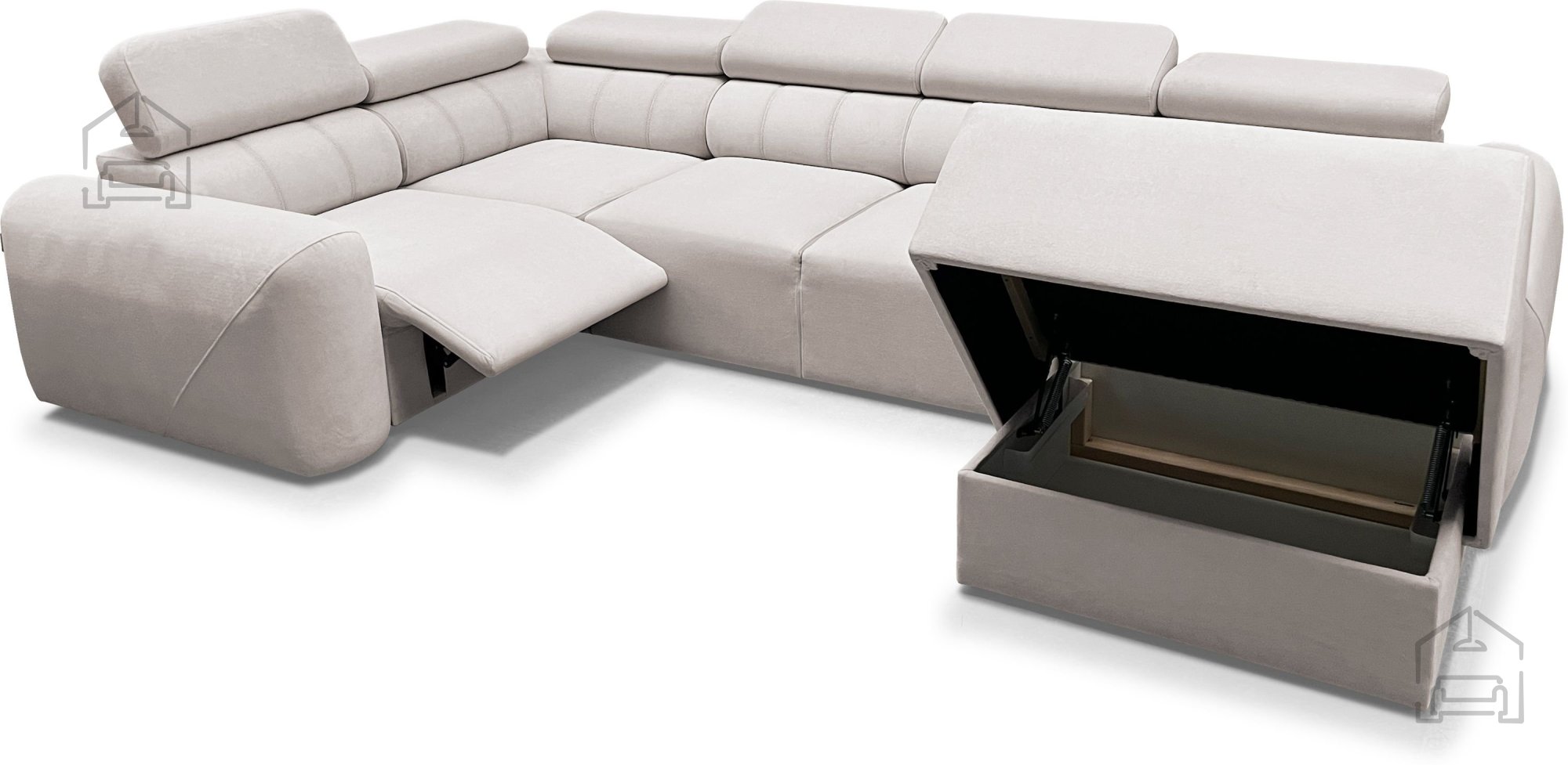 Die Wohnlandschaft Volare IV Mix des polnischen Herstellers Brattex vereint modernes Design, außergewöhnliche Funktionalität und Komfort für den täglichen Gebrauch. Es handelt sich um eine großzügige U-förmige Garnitur, die für diejenigen gedacht ist, die mehr Platz zur Entspannung wünschen und gleichzeitig hochwertige Verarbeitung und präzise Details schätzen. Das Modell verfügt über einen zuverlässigen Dolphin-Mechanismus, der ein schnelles und einfaches Ausziehen in ein Bett mit einer Liegefläche von 268x132 cm ermöglicht. Die Konstruktion besteht aus Holz in Kombination mit Spanplatte, was Stabilität und eine lange Lebensdauer gewährleistet.