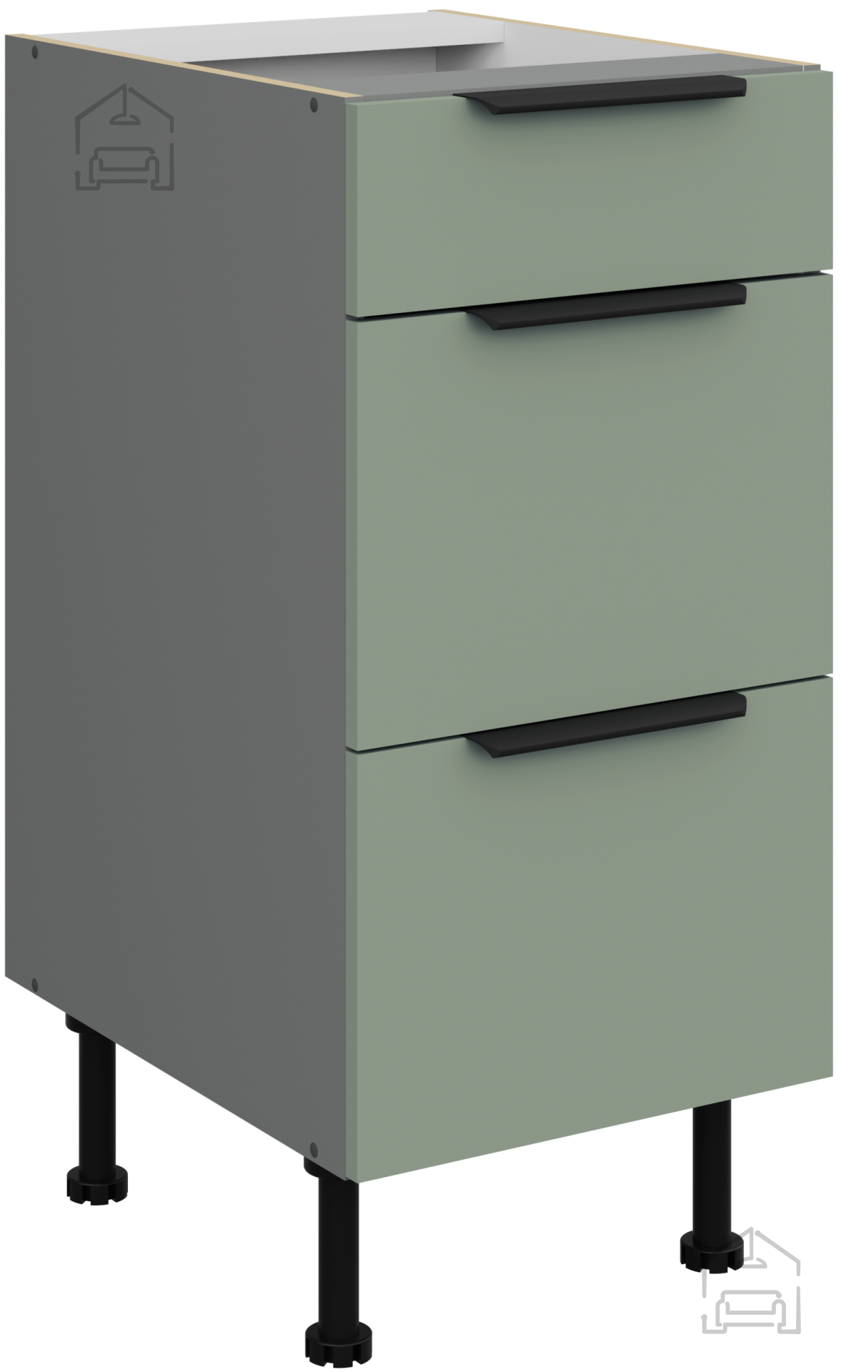 Das Grundmaterial des Küchenensembles Aria ist eine laminierte Platte mit einer Stärke von 16 mm, die eine stabile Konstruktion und Widerstandsfähigkeit gegen den täglichen Gebrauch ermöglicht. Die Oberfläche der Platten ist glatt und kratzfest, was die Reinigung erleichtert und das ursprüngliche Aussehen auch nach Jahren der Nutzung bewahrt. Der Rahmen besteht aus Spanplatte, was zusätzlich zur Stabilität und Haltbarkeit der gesamten Struktur beiträgt. Alle Elemente sind präzise bearbeitet, und die Kanten sind mit einem hochwertigen Band versehen, das das Eindringen von Feuchtigkeit verhindert.