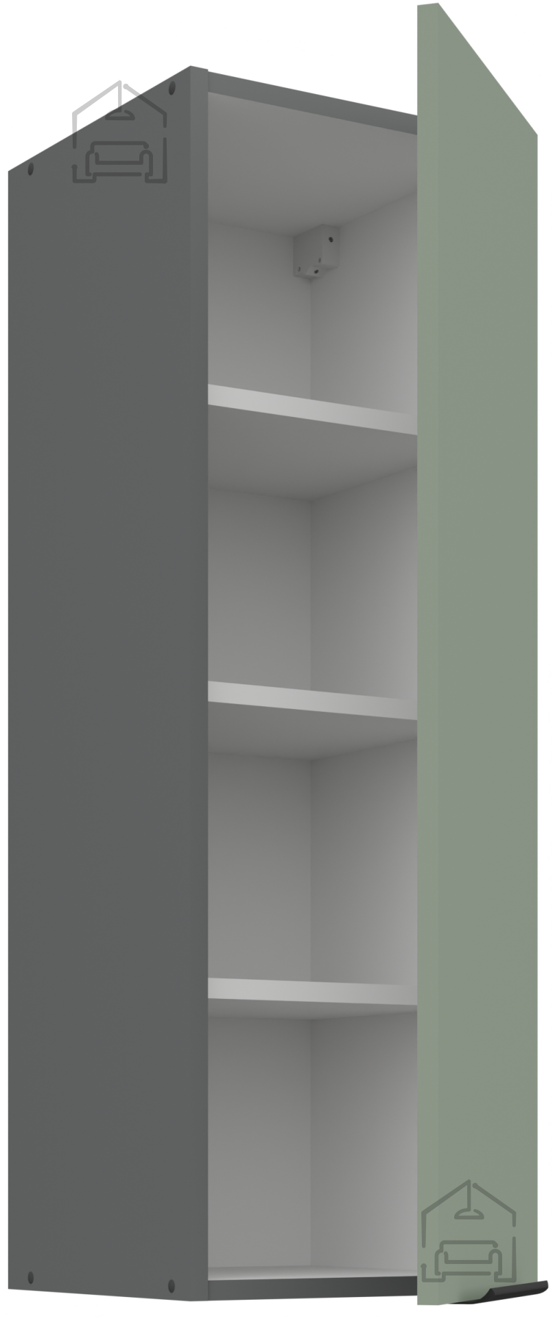 Das Grundmaterial der Küchenzeile Aria ist eine laminierte Platte mit einer Stärke von 16 mm, die eine stabile Konstruktion und Widerstandsfähigkeit gegen den täglichen Gebrauch ermöglicht. Die Oberfläche der Platten ist glatt und kratzfest, was die Reinigung erleichtert und das ursprüngliche Aussehen auch nach Jahren der Nutzung bewahrt. Der Rahmen ist aus Spanplatte gefertigt, was zusätzlich zur Stabilität und Langlebigkeit der gesamten Struktur beiträgt. Alle Elemente sind präzise bearbeitet, und die Kanten sind mit einem hochwertigen Band versiegelt, das das Eindringen von Feuchtigkeit verhindert.