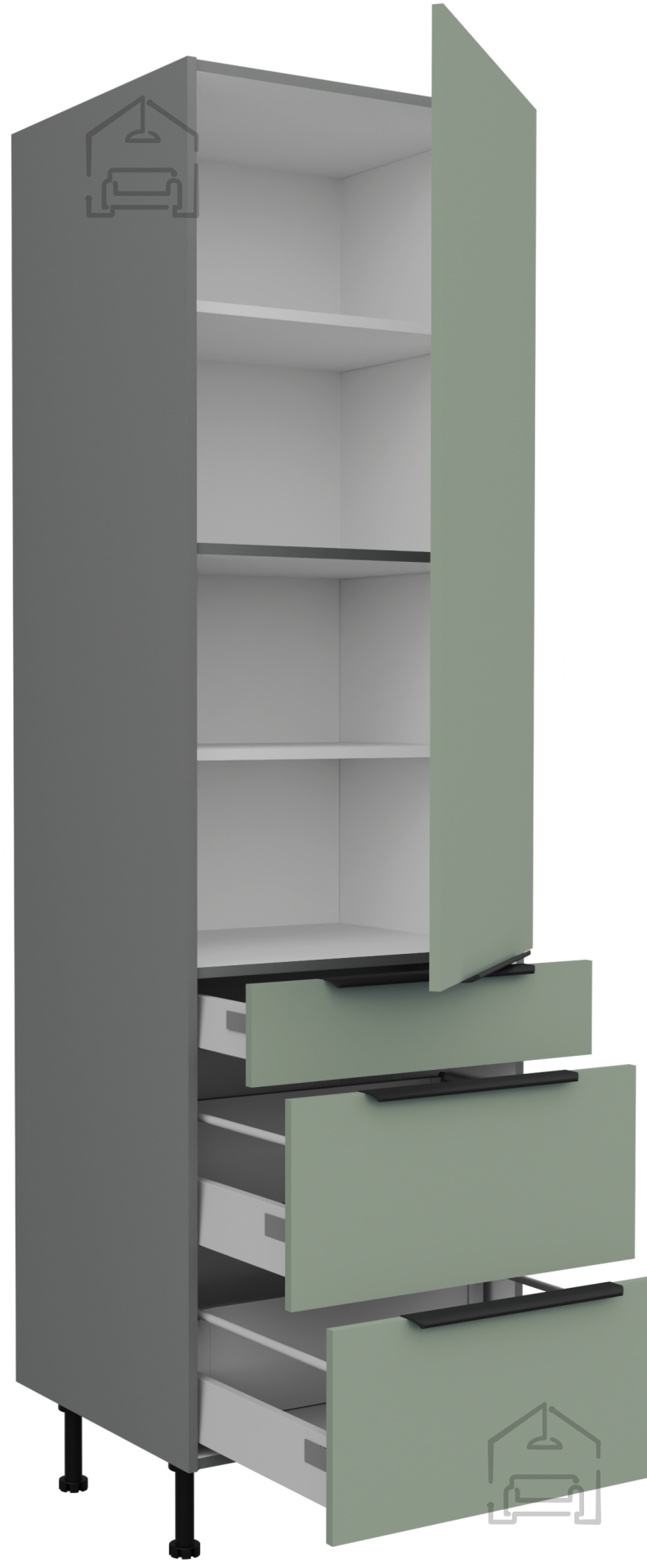 Das Grundmaterial des Küchenensembles Aria ist eine laminierte Platte mit einer Stärke von 16 mm, die eine stabile Konstruktion und Widerstandsfähigkeit gegen den täglichen Gebrauch ermöglicht. Die Oberfläche der Platten ist glatt und kratzfest, was die Reinigung erleichtert und das ursprüngliche Aussehen auch nach Jahren der Nutzung bewahrt. Der Rahmen besteht aus Spanplatte, was zusätzlich zur Stabilität und Langlebigkeit der gesamten Struktur beiträgt. Alle Elemente sind präzise bearbeitet, und die Kanten sind mit einem hochwertigen Band versiegelt, das das Eindringen von Feuchtigkeit verhindert.