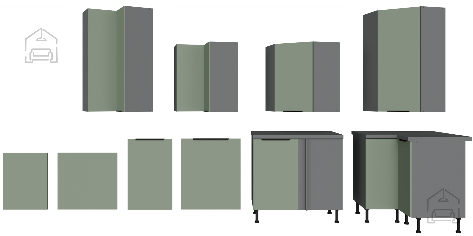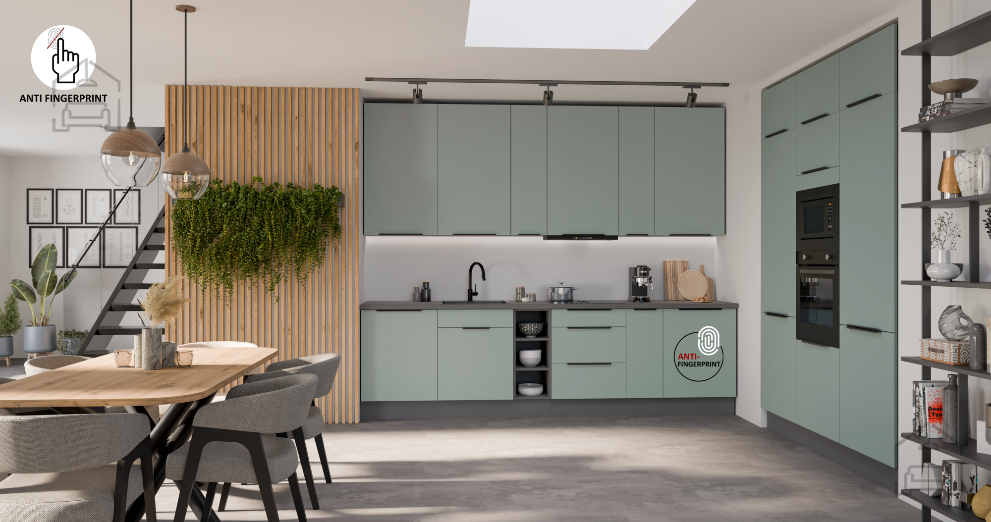 Das Grundmaterial des Küchenensembles Aria ist eine laminierte Platte mit einer Stärke von 16 mm, die eine stabile Konstruktion und Widerstandsfähigkeit gegen den täglichen Gebrauch ermöglicht. Die Oberfläche der Platten ist glatt und kratzfest, was die Reinigung erleichtert und das ursprüngliche Aussehen auch nach Jahren der Nutzung bewahrt. Der Rahmen besteht aus Spanplatte, was zusätzlich zur Stabilität und Haltbarkeit der gesamten Struktur beiträgt. Alle Elemente sind präzise verarbeitet, und die Kanten sind mit einem hochwertigen Band versehen, das das Eindringen von Feuchtigkeit verhindert.