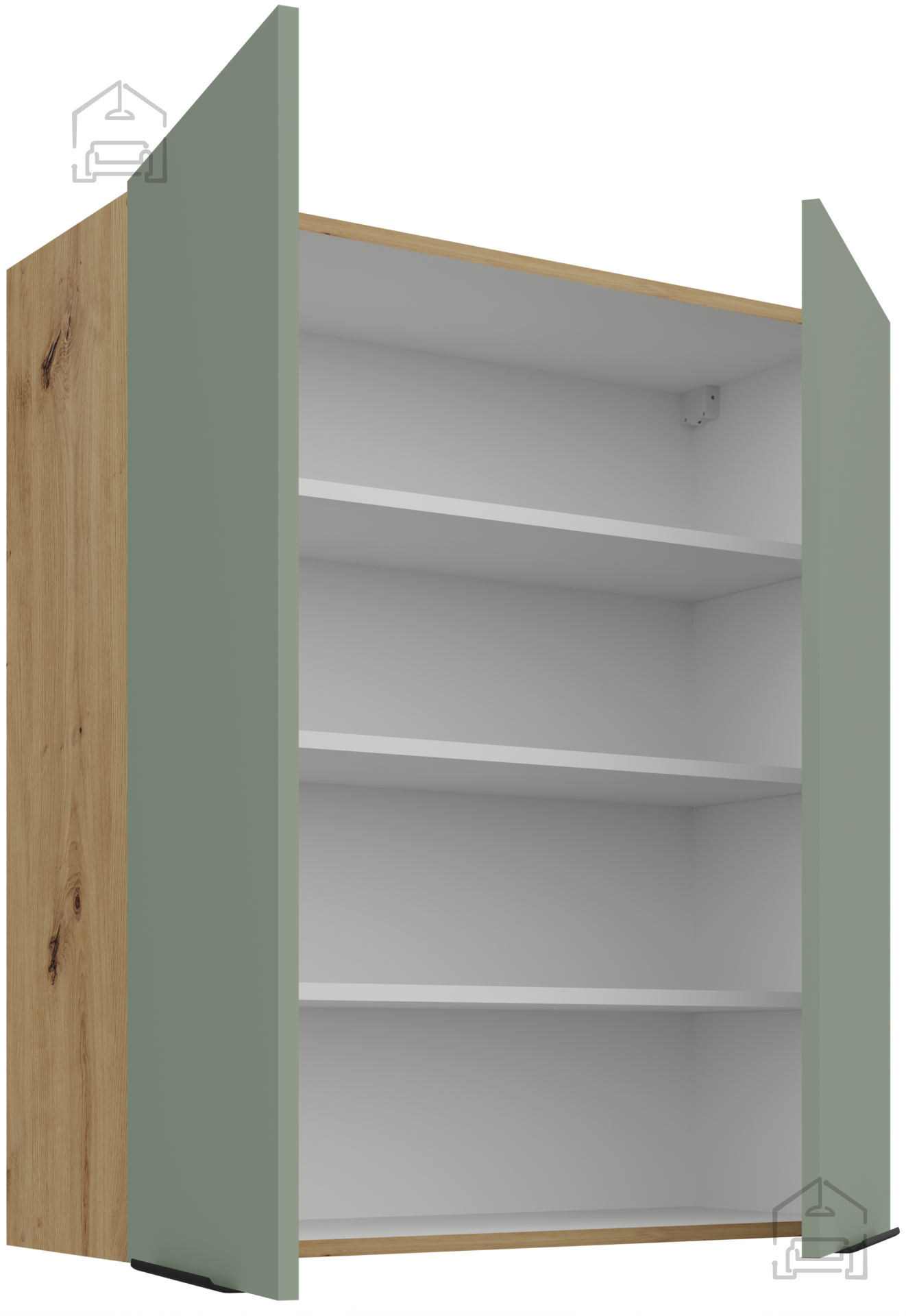 Die Farbe des Produkts – Grün in Kombination mit dem Holzton der Eiche Artisan – bringt ein Gefühl von Natürlichkeit und Frische in den Raum. Eine solche Farbkombination wirkt beruhigend und passt hervorragend zu verschiedenen Einrichtungsstilen, von minimalistischen bis hin zu klassischen Küchen. Das Set Aria kann mit verschiedenen Haushaltsgeräten und Accessoires ergänzt werden, was die Schaffung eines individuell angepassten Ambientes ermöglicht.